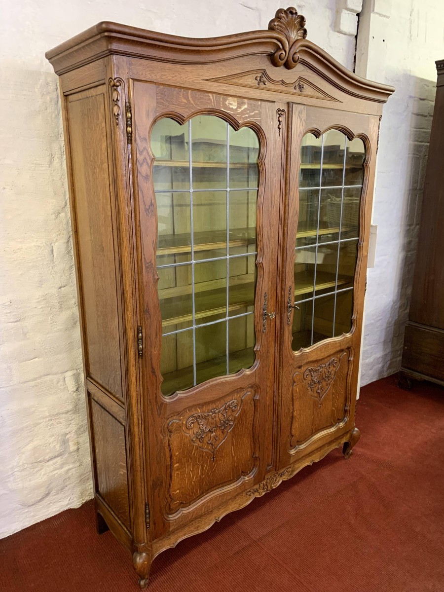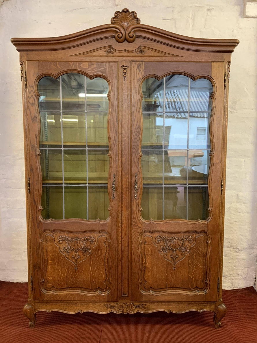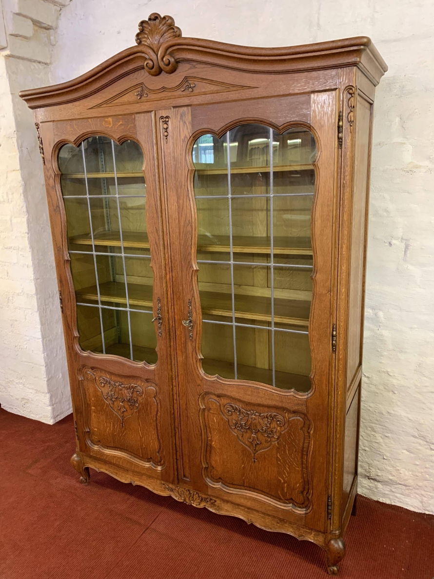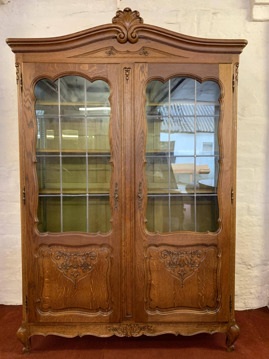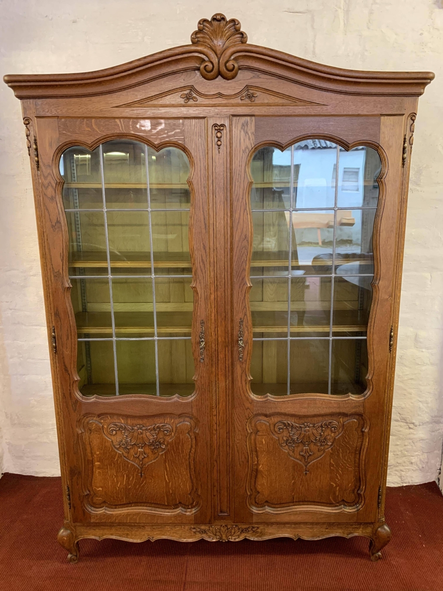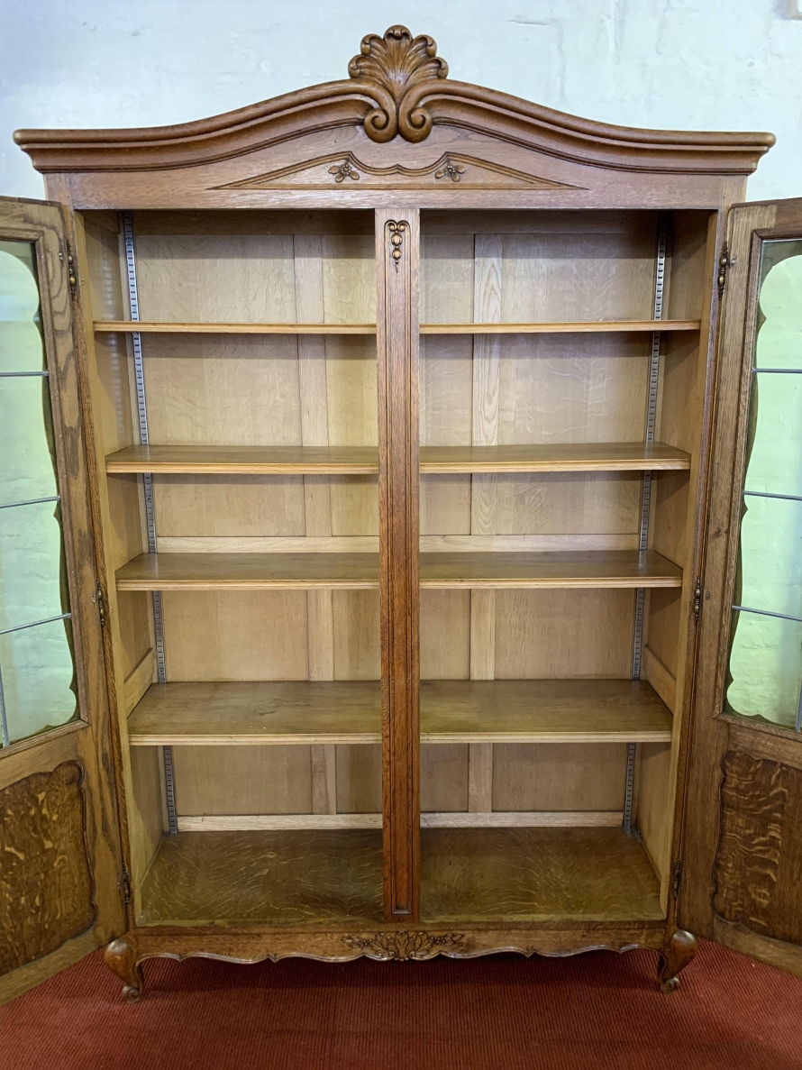 The shaped over sailing top rises to a central fan carving, below are a pair of lockable doors. Each door has a beautiful carved and shaped recess panel with shaped glazing above. Each door has brass hinges, decorative brass escutcheon and key. The doors open to reveal four adjustable and removable shelves. Recessed panelled sides, shaped skirt with central ornate carving. This elegant bookcase stands on carved shaped cabriole legs to the front.