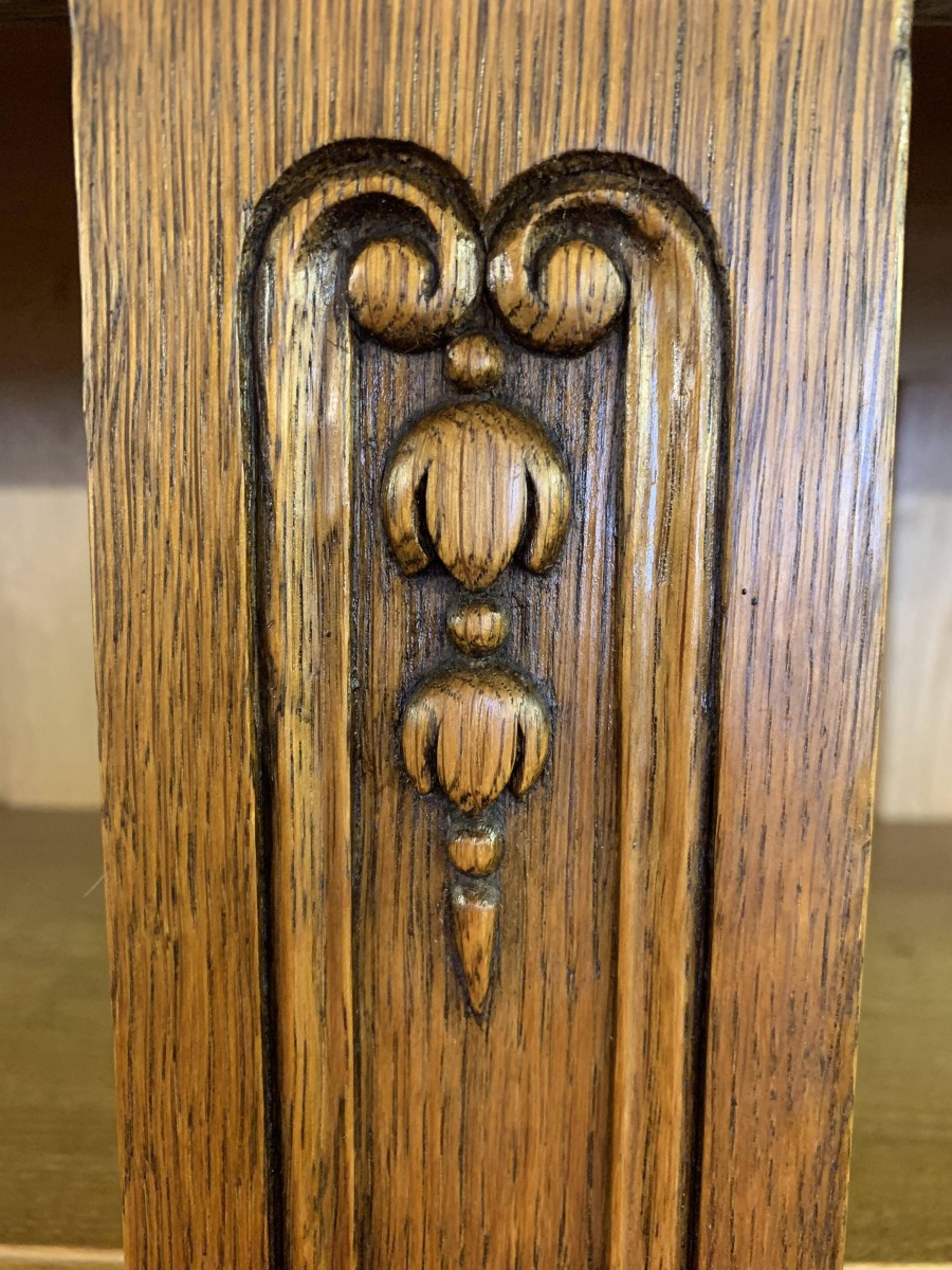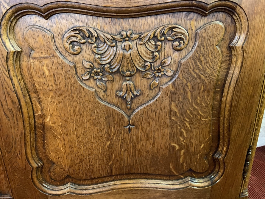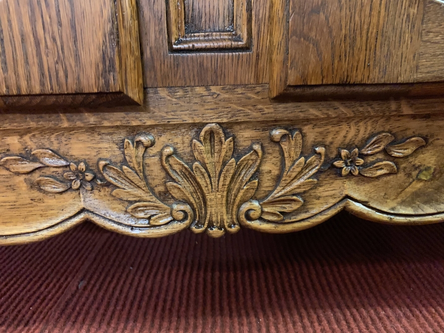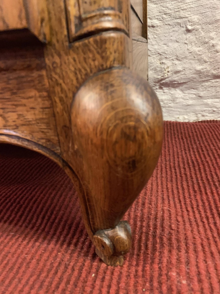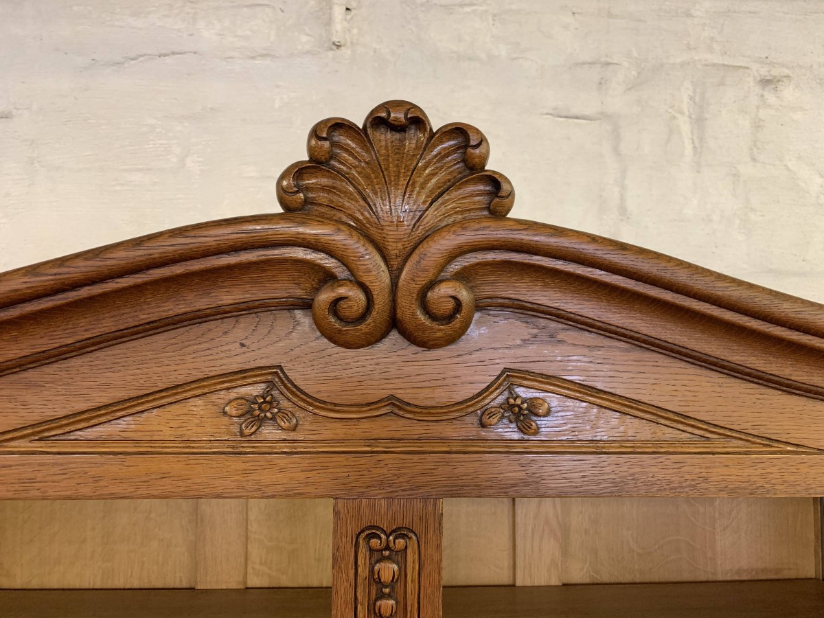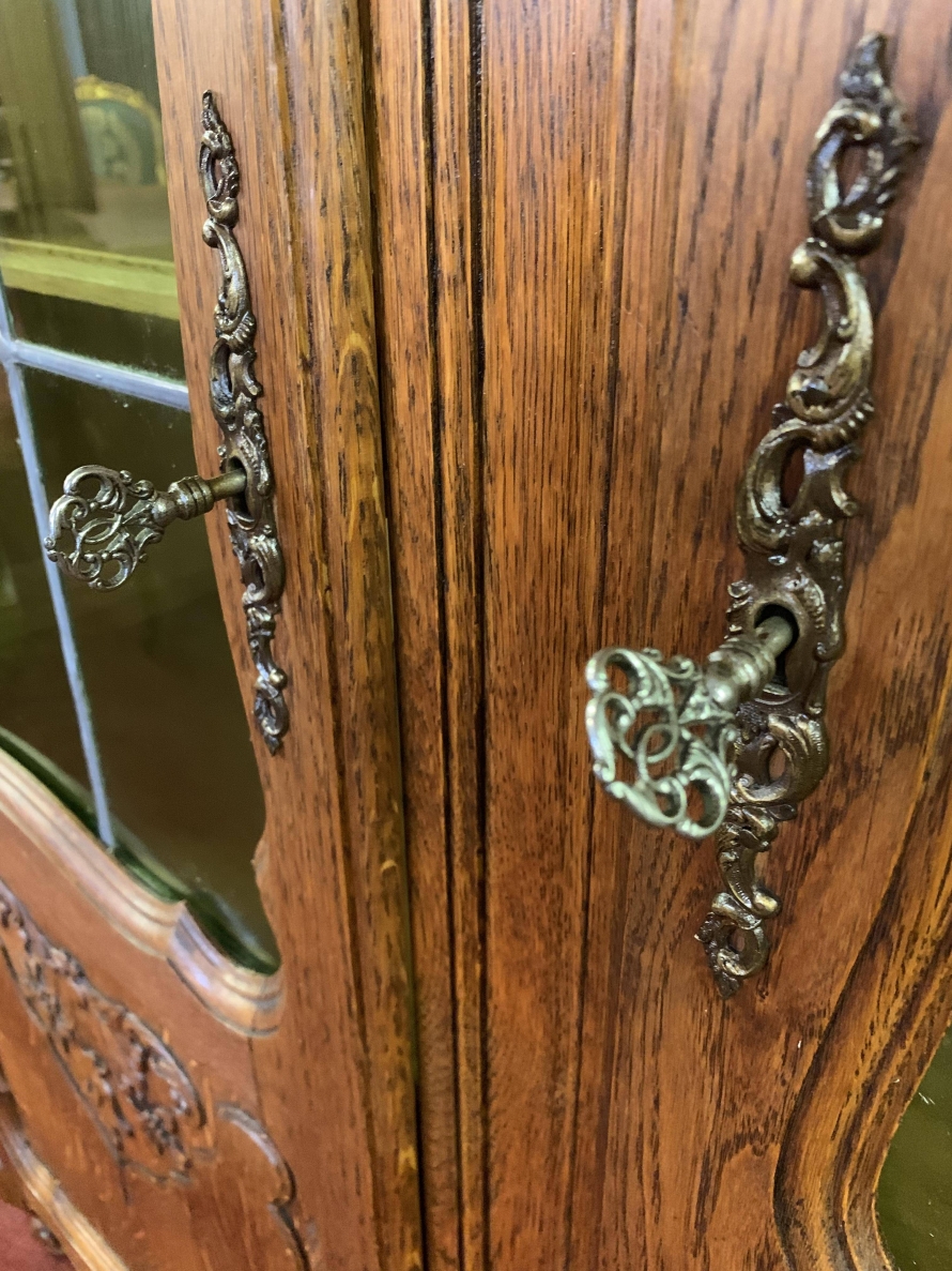 The shaped over sailing top rises to a central fan carving, below are a pair of lockable doors. Each door has a beautiful carved and shaped recess panel with shaped glazing above. Each door has brass hinges, decorative brass escutcheon and key. The doors open to reveal four adjustable and removable shelves. Recessed panelled sides, shaped skirt with central ornate carving. This elegant bookcase stands on carved shaped cabriole legs to the front.