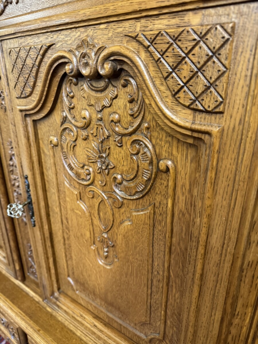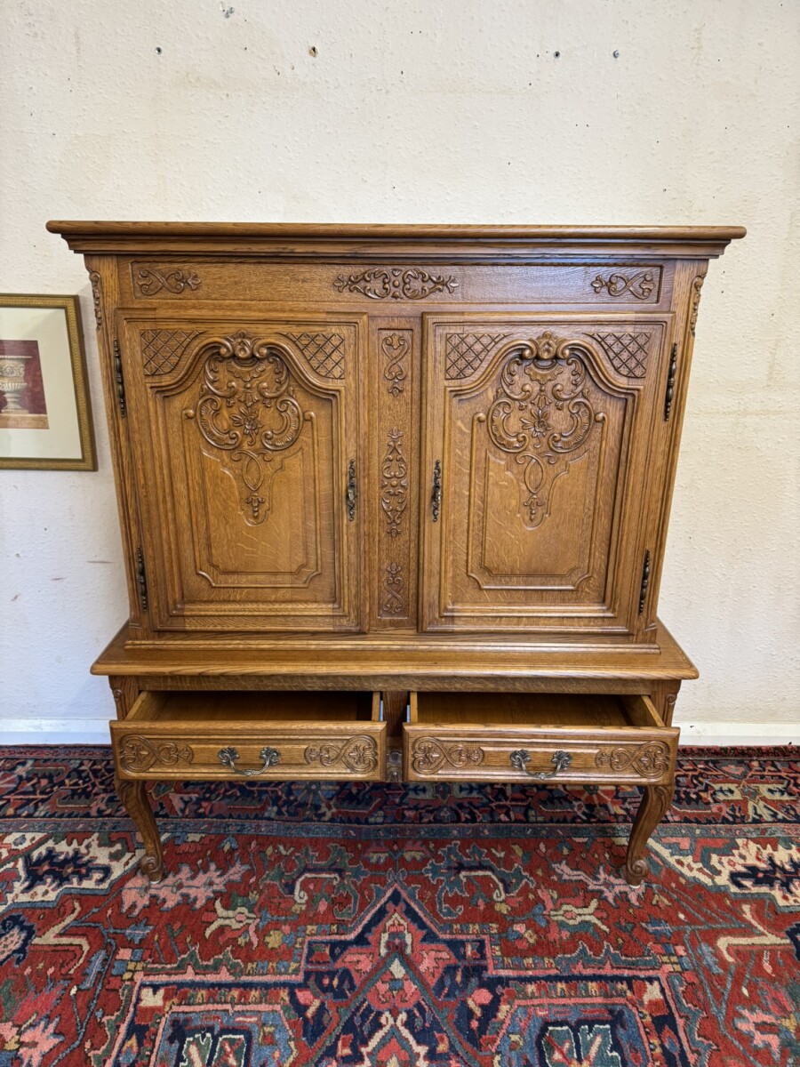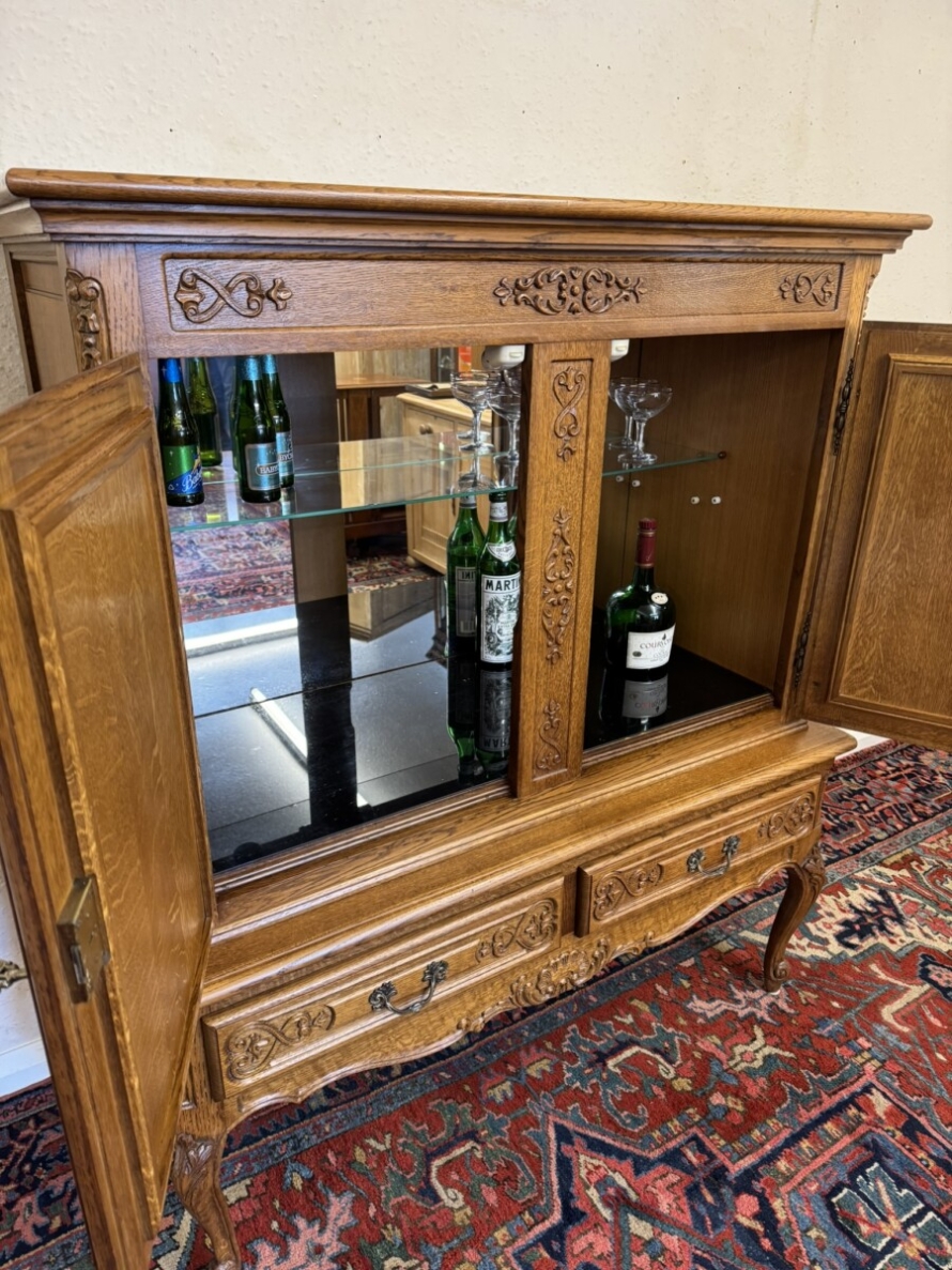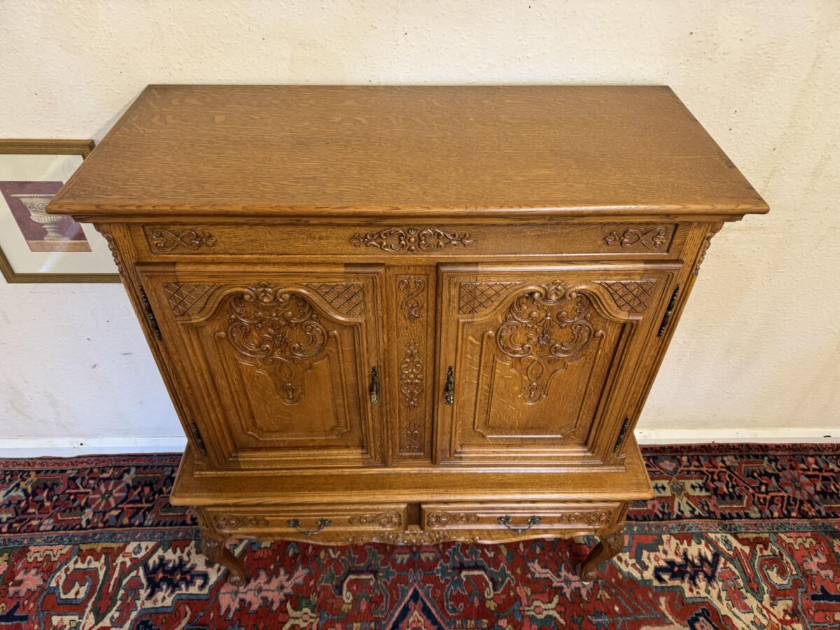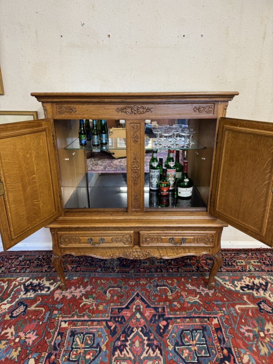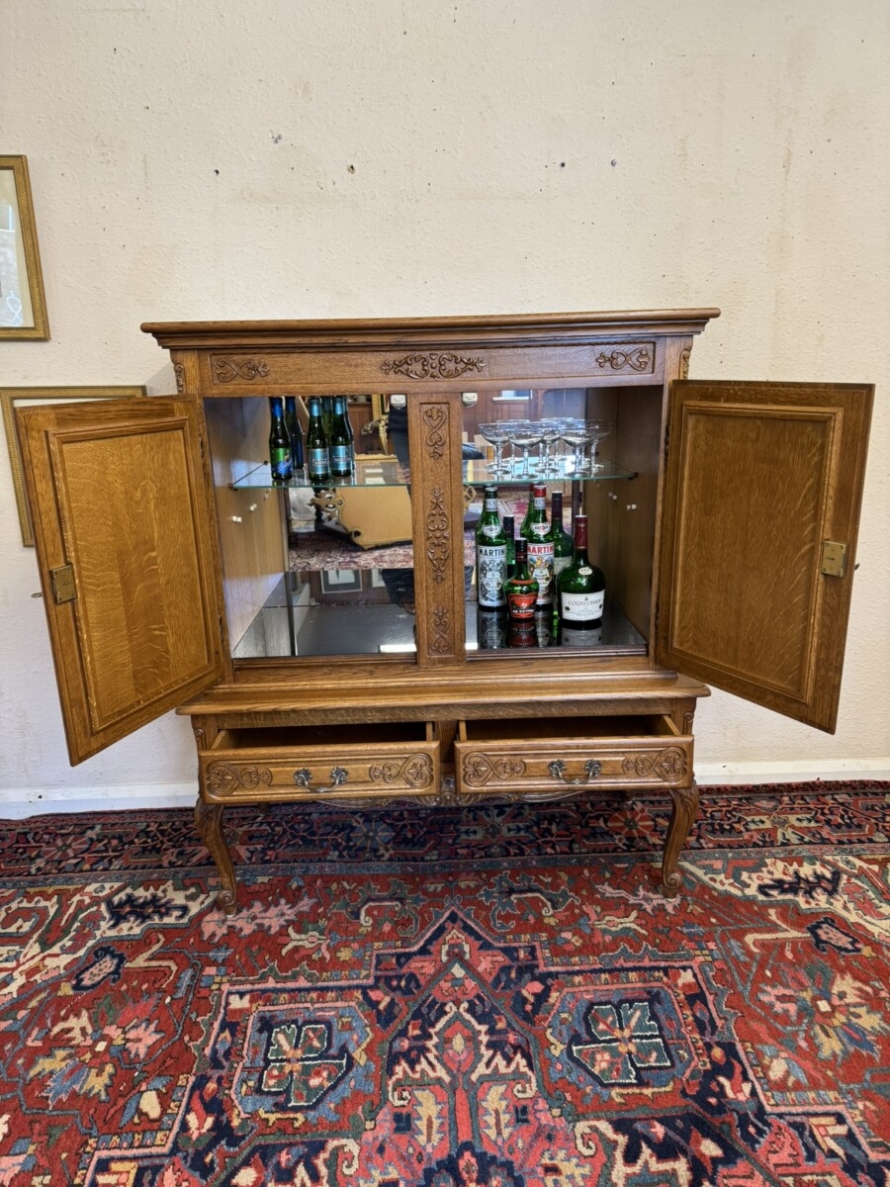 The shaped oversailing top sits above a pair of carved recessed panelled lockable doors with a central carving between the doors. Each door has brass hinges, brass escutcheon and key. The doors open to reveal a mirrored back, glass shelf and glass bottle shelf, below are a pair of carved drawers, each drawer with an ornate brass handle. Recessed panelled sides, shaped skirt with decorative carving and standing on four elegant carved cabriole straight legs.