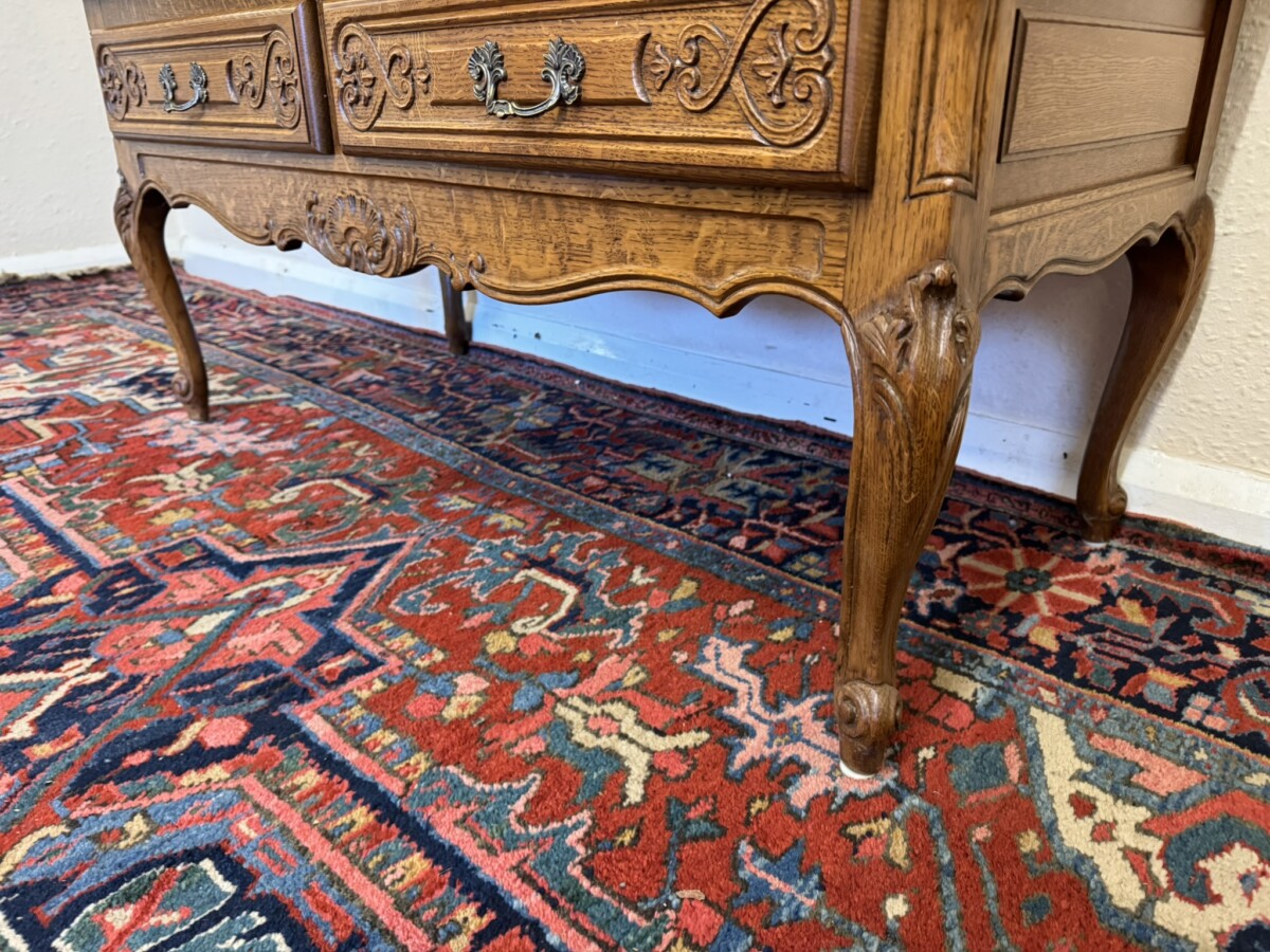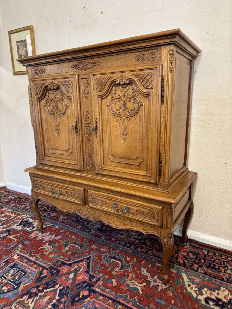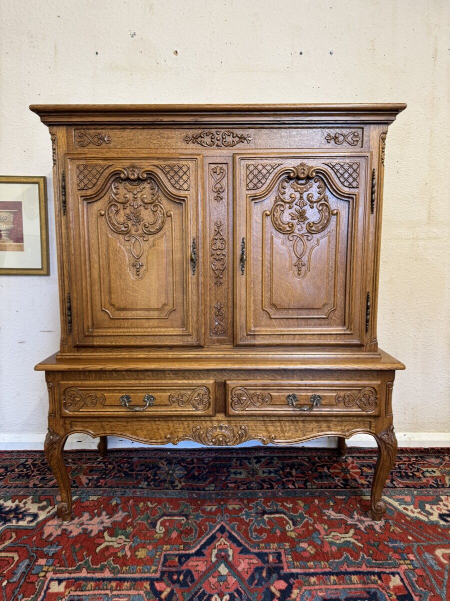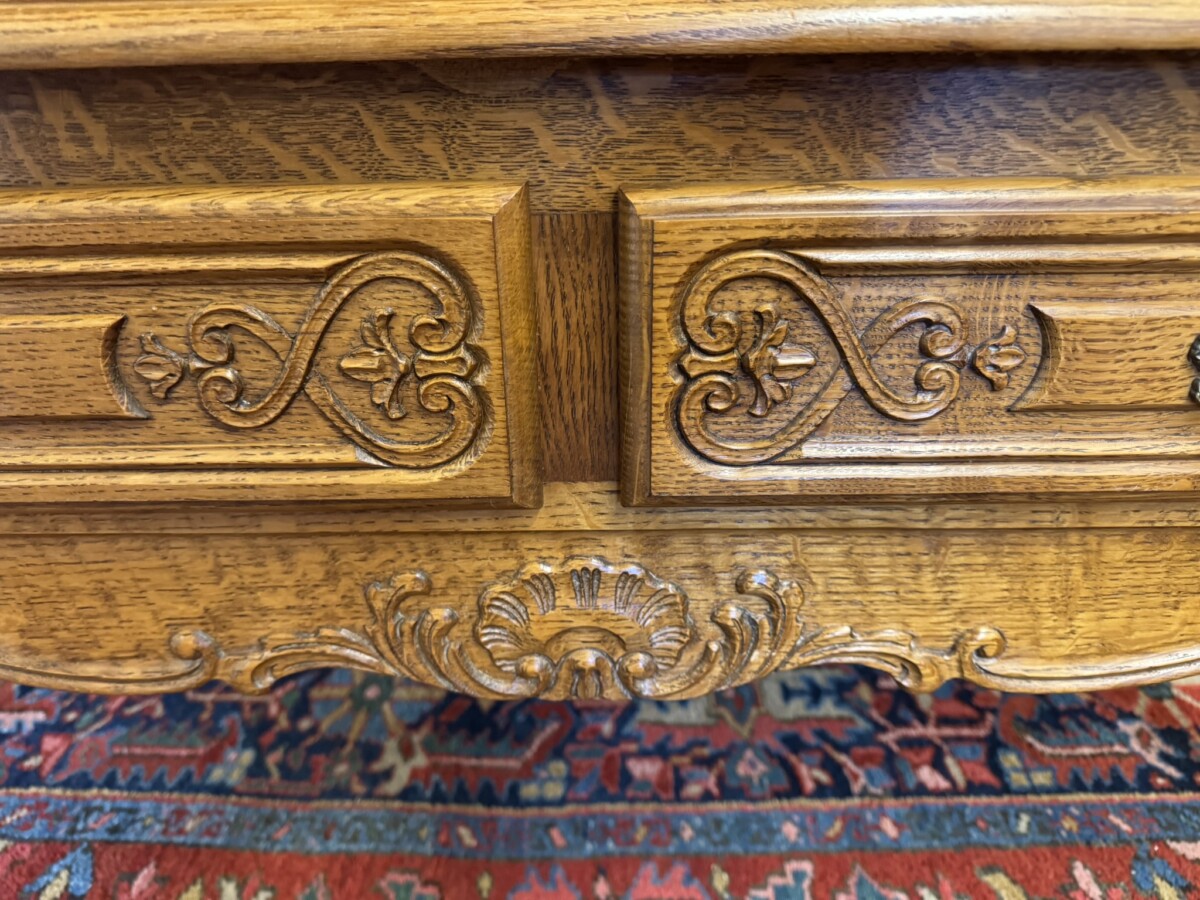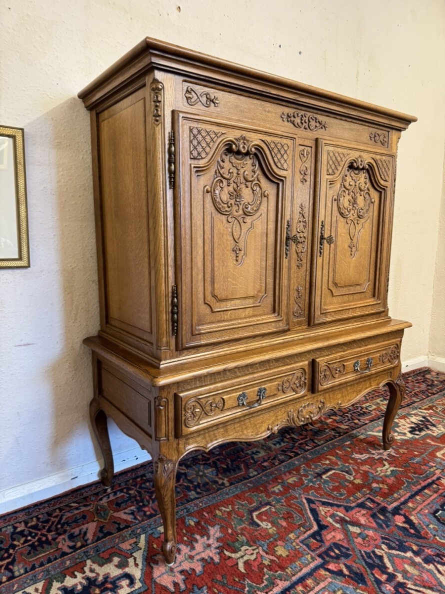 The shaped oversailing top sits above a pair of carved recessed panelled lockable doors with a central carving between the doors. Each door has brass hinges, brass escutcheon and key. The doors open to reveal a mirrored back, glass shelf and glass bottle shelf, below are a pair of carved drawers, each drawer with an ornate brass handle. Recessed panelled sides, shaped skirt with decorative carving and standing on four elegant carved cabriole straight legs.