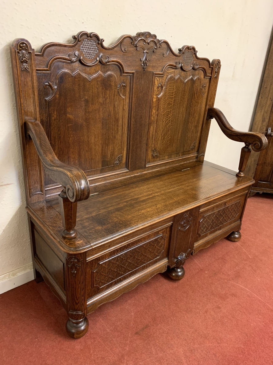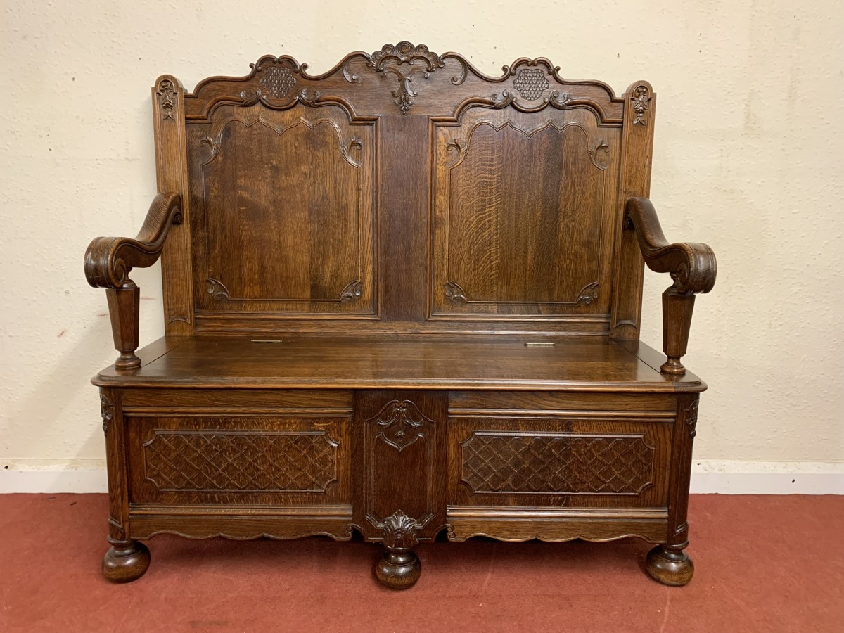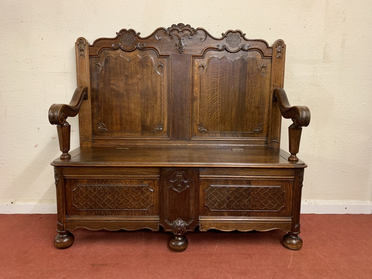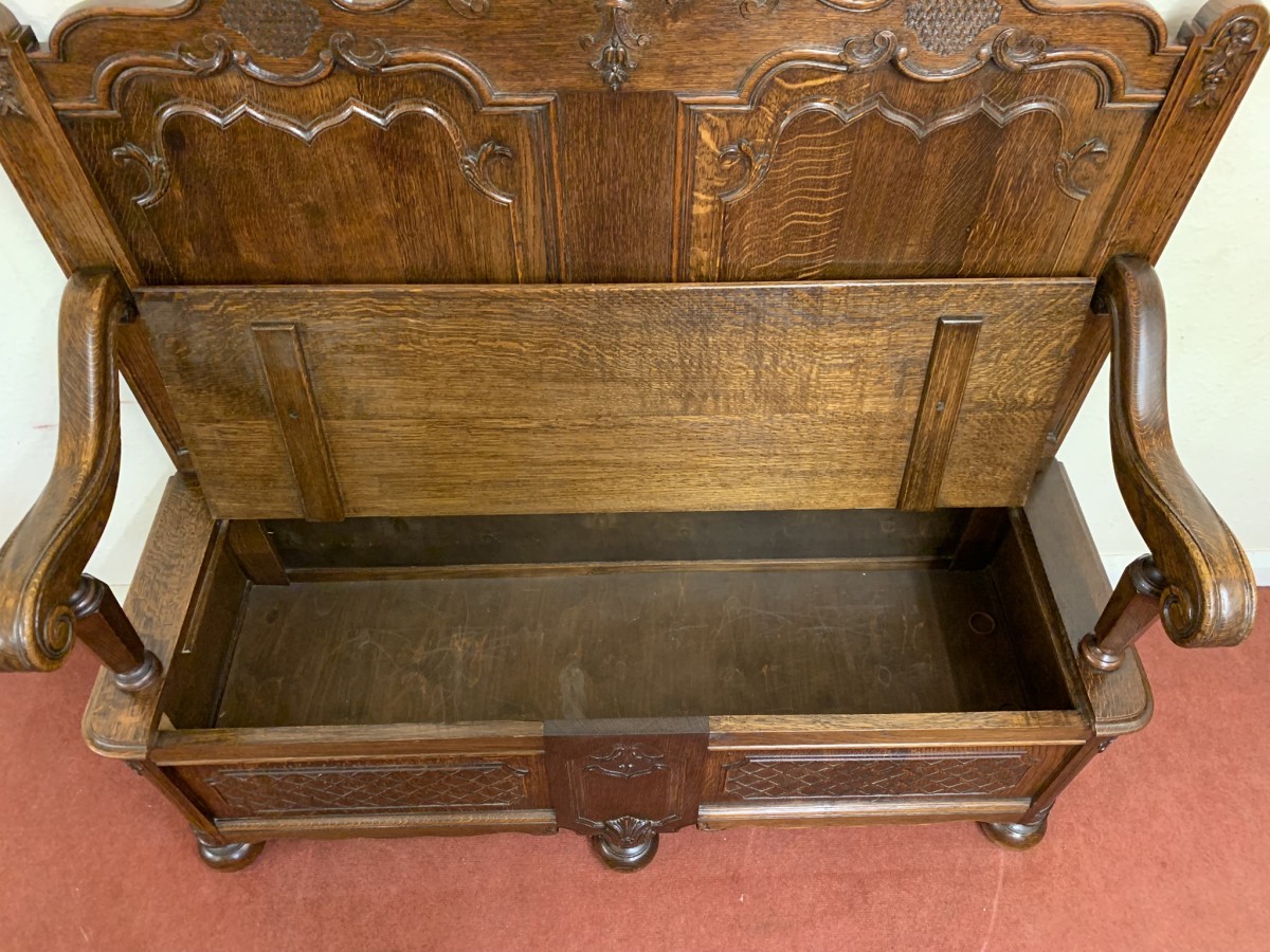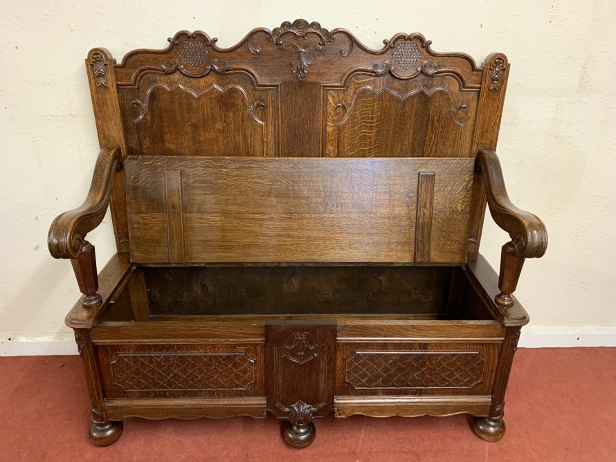 The shaped carved back sits above two carved shaped recessed panels. Having curved arms, lift up lid which opens to reveal good storage space. Two carved panels to the front, recessed panelled sides, shaped skirt this fantastic quality bench sits on three turned feet to the front.