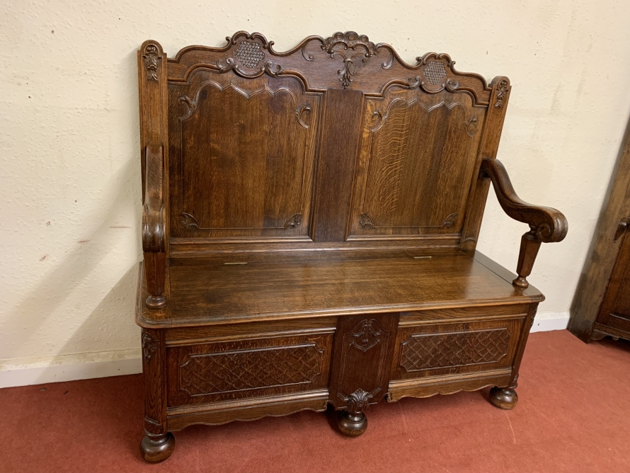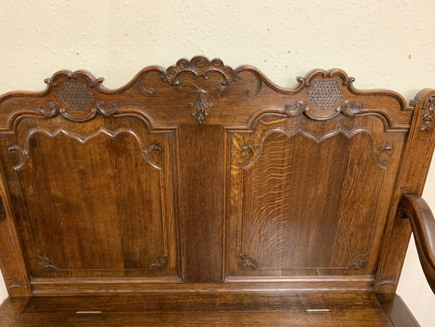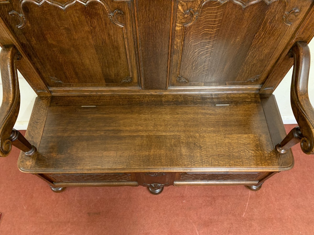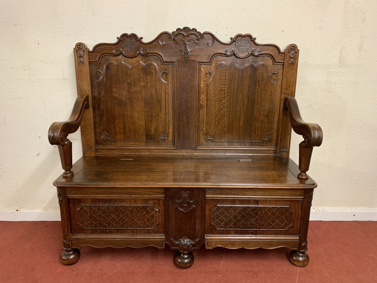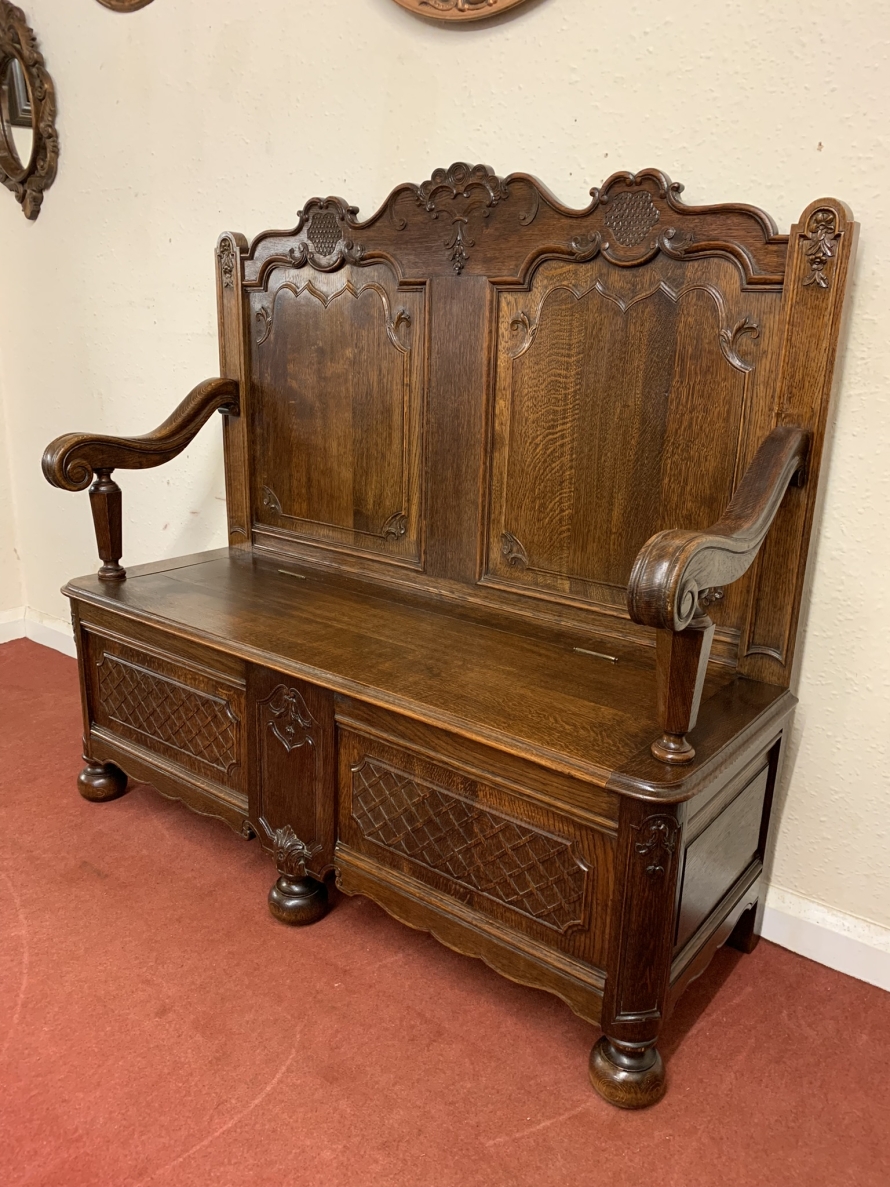The shaped carved back sits above two carved shaped recessed panels. Having curved arms, lift up lid which opens to reveal good storage space. Two carved panels to the front, recessed panelled sides, shaped skirt this fantastic quality bench sits on three turned feet to the front.