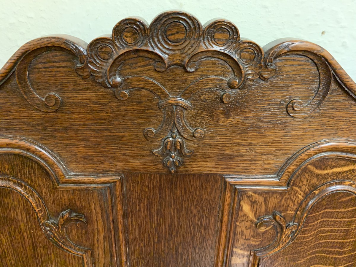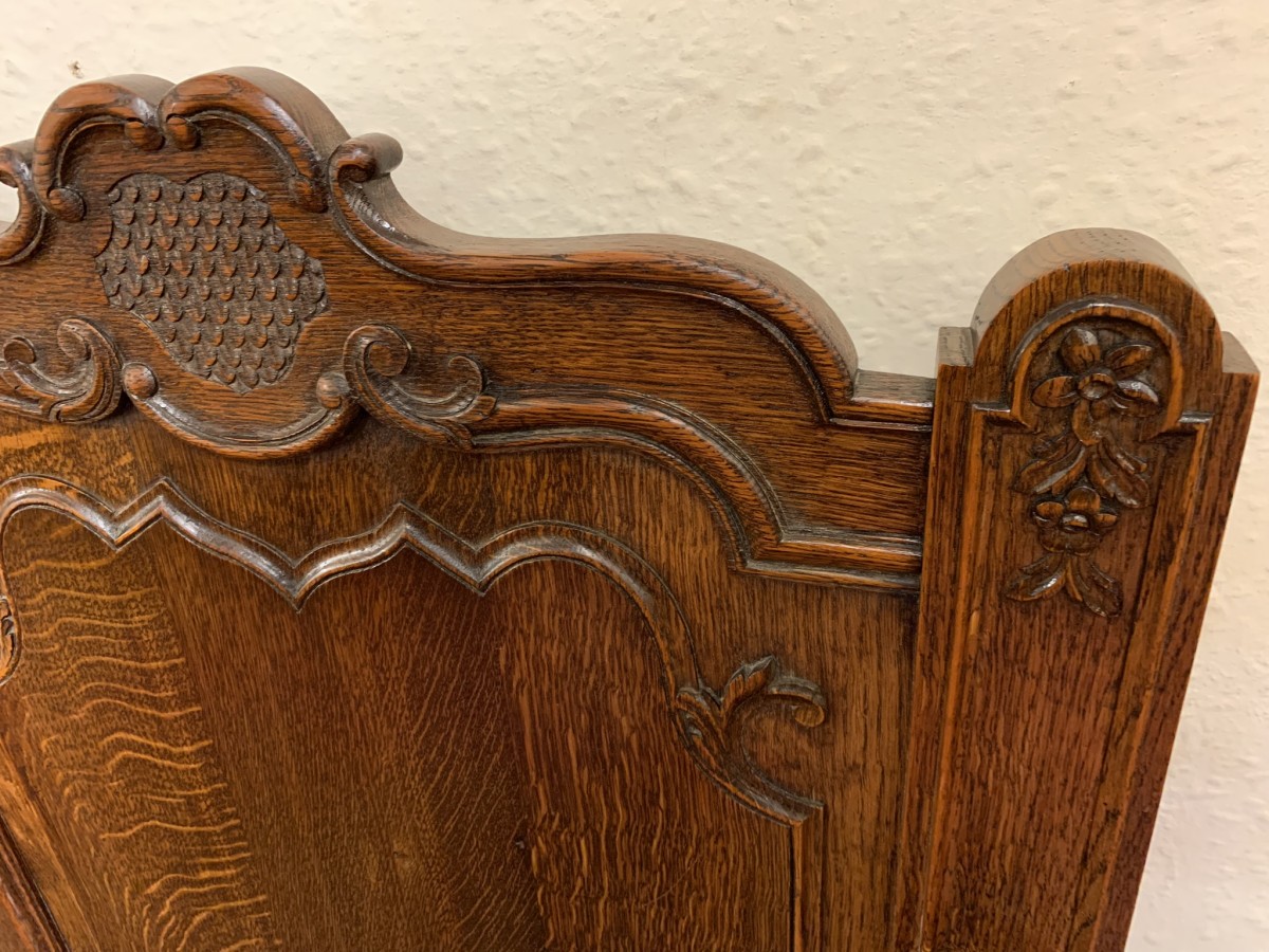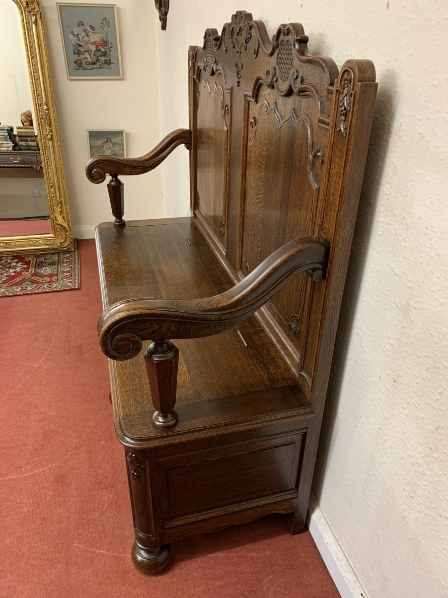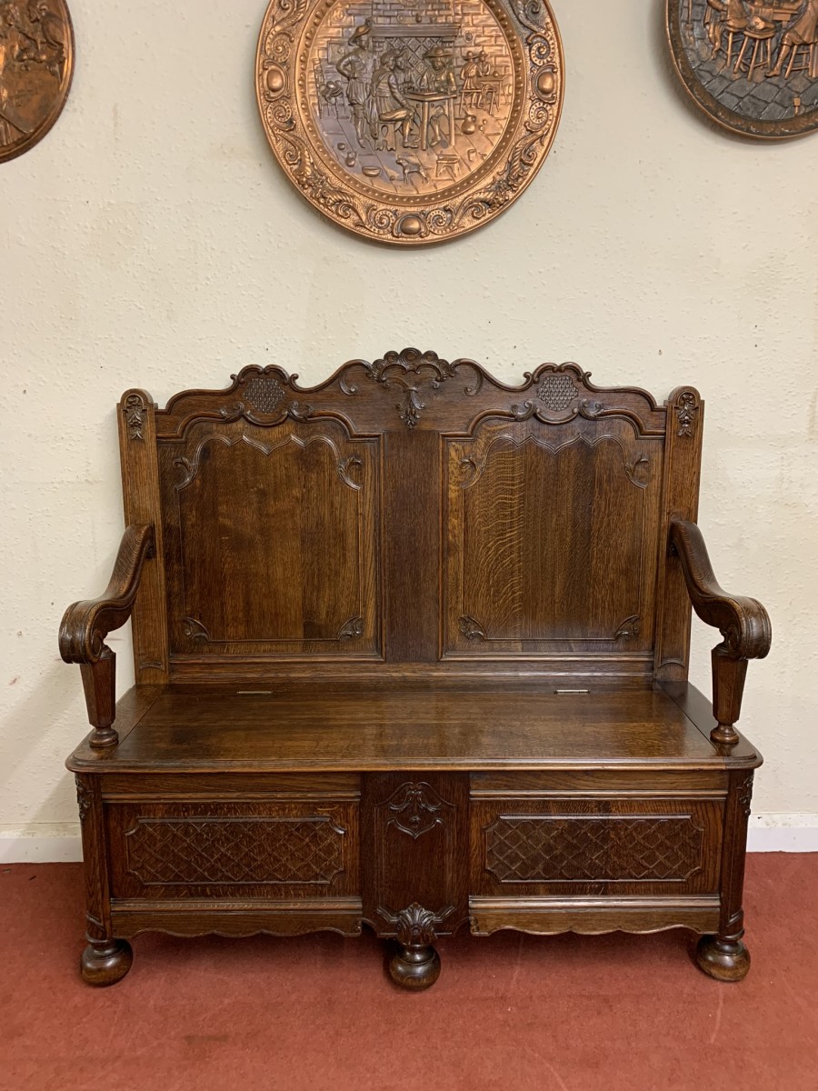 The shaped carved back sits above two carved shaped recessed panels. Having curved arms, lift up lid which opens to reveal good storage space. Two carved panels to the front, recessed panelled sides, shaped skirt this fantastic quality bench sits on three turned feet to the front.