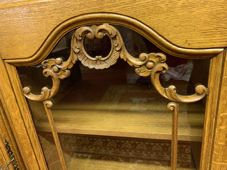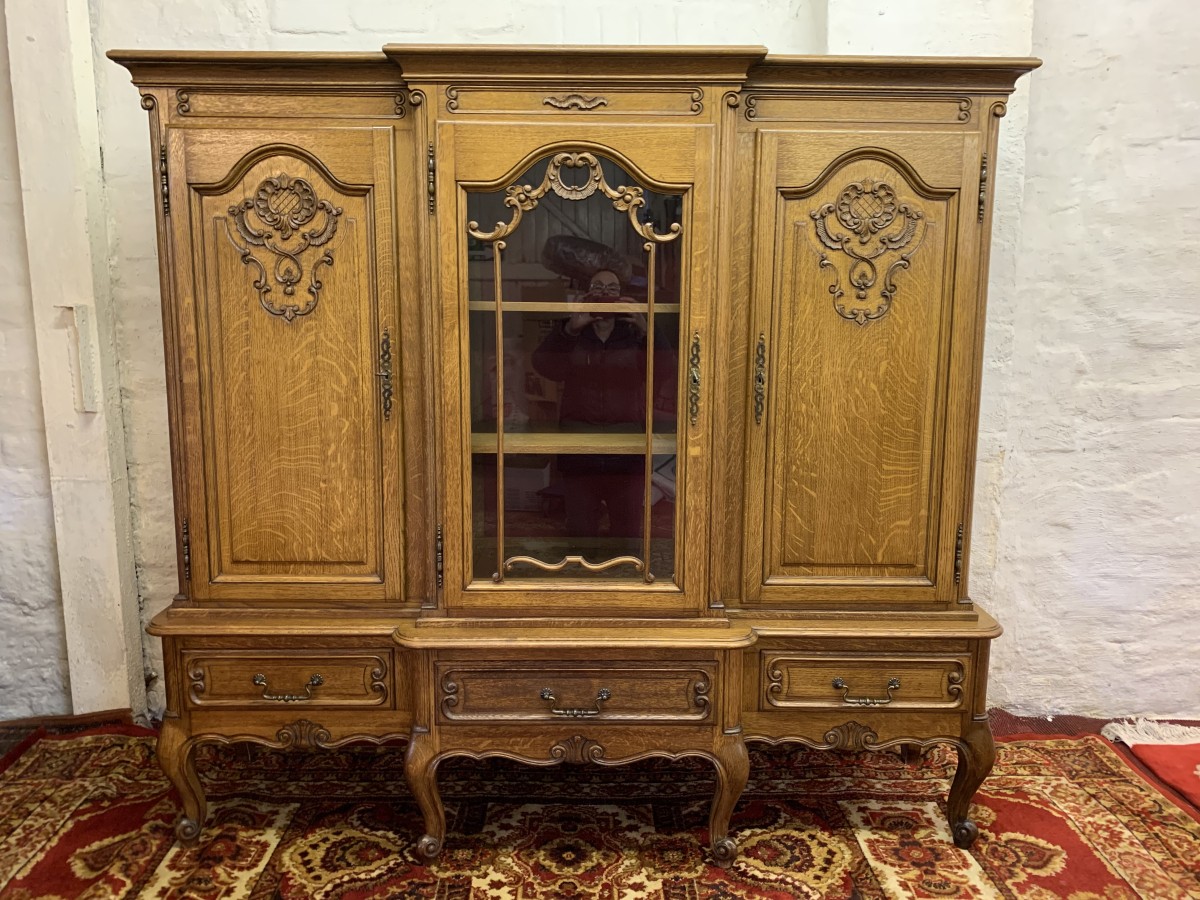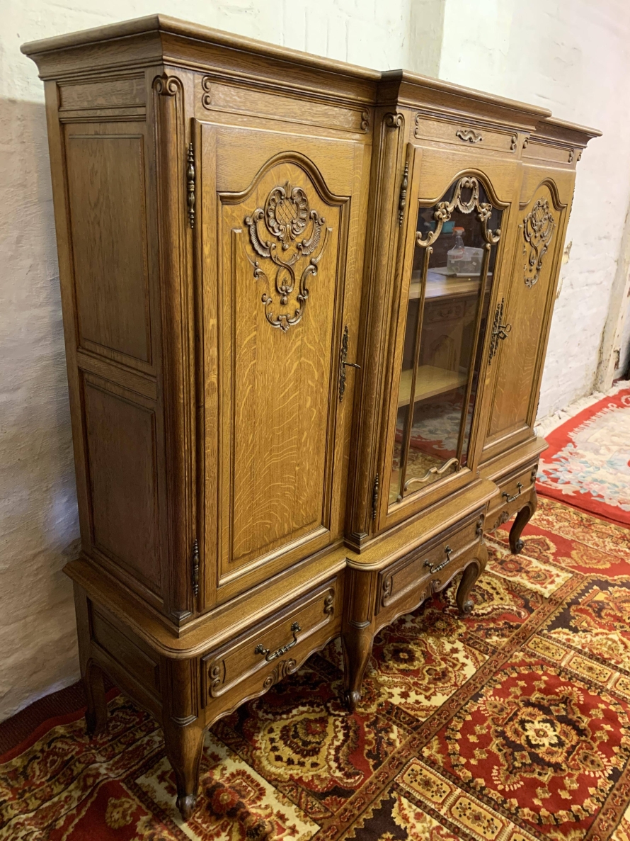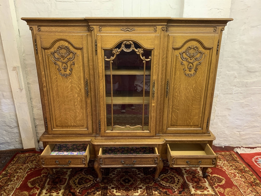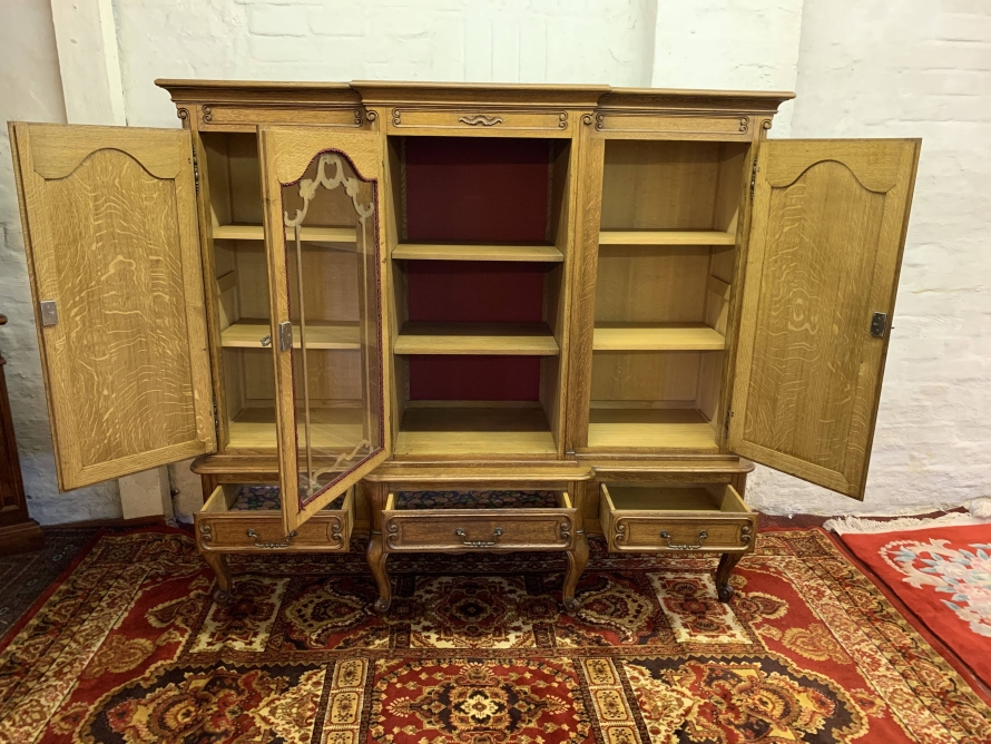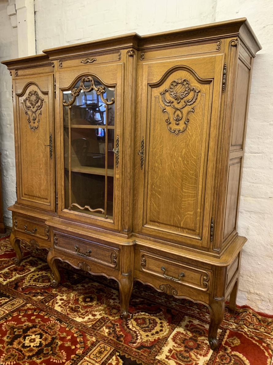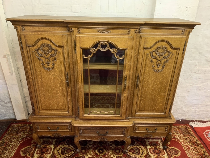 This beautiful French carved oak cabinet is in excellent condition. The oversailing top sits above a central glazed brakefront lockable door, the door has carved decoration, brass hinges, brass escutcheon and key. This door opens to reveal two removable shelves. Below the central door is a carved recessed panelled drawer, with brass handle. The central brakefront door is flanked by a pair of carved recessed panelled cupboard doors, each door has ornate carved decoration, brass hinges, brass escutcheon and key. Each door opens to reveal two removable shelves. Below is a carved recessed panelled drawer, each drawer having brass handle. Recessed panelled sides, carved shaped skirt – this fabulous French cabinet stands on four carved cabriole shaped legs to the front.