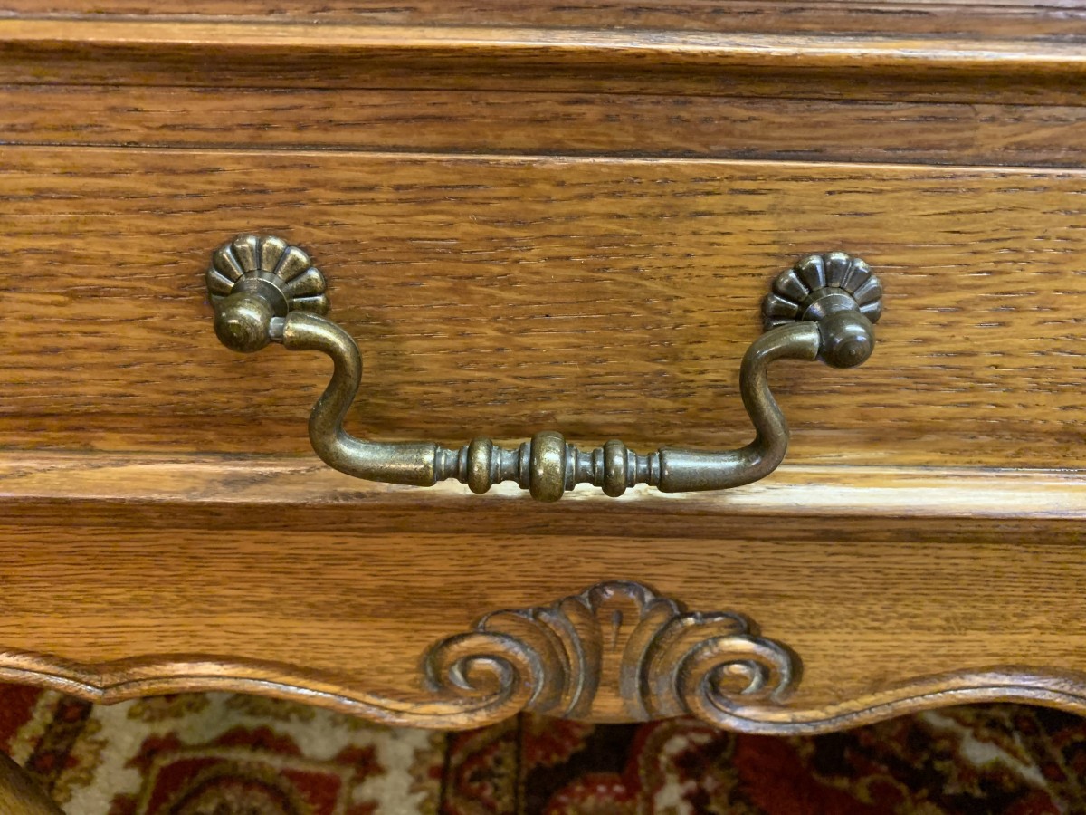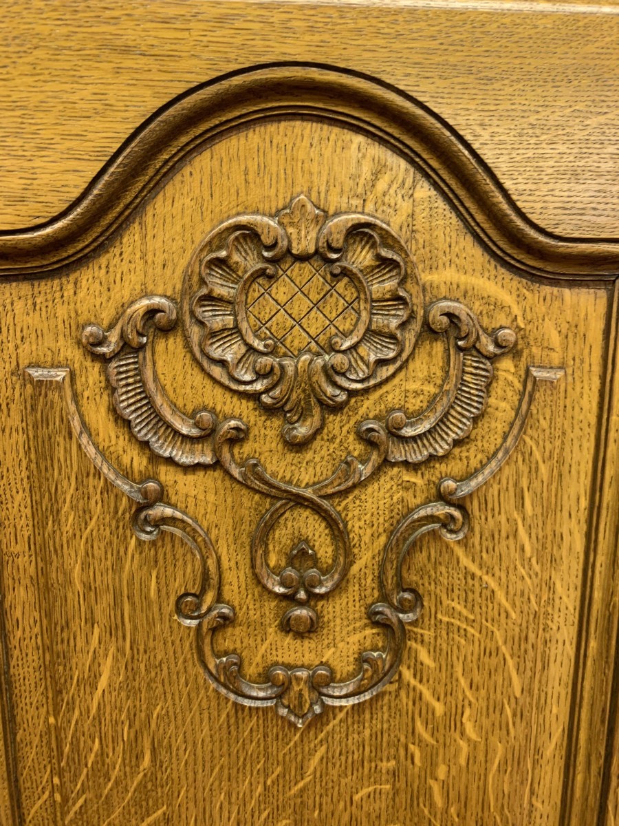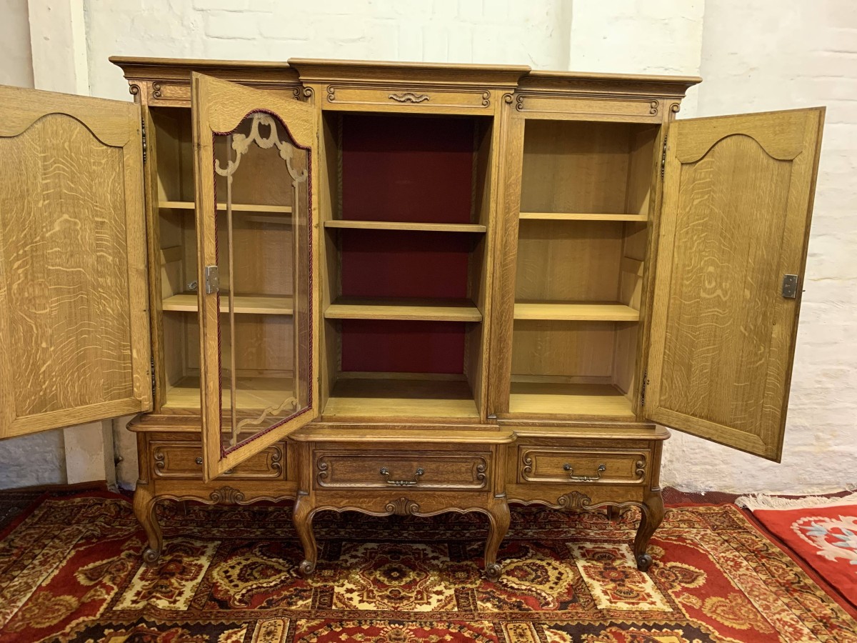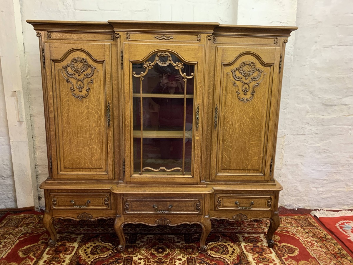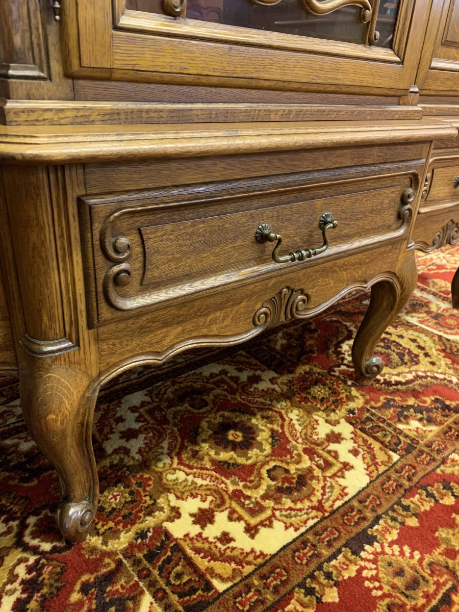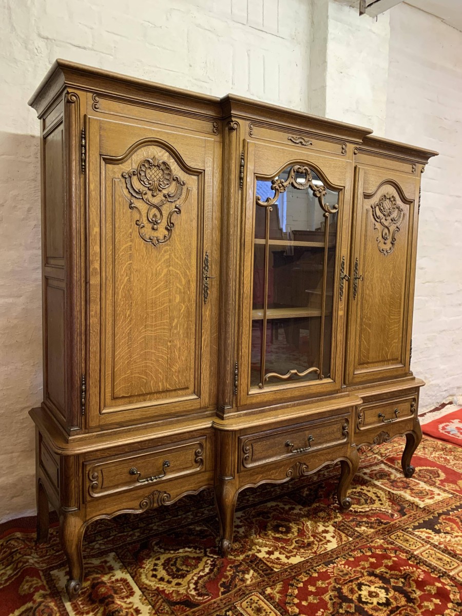 This beautiful French carved oak cabinet is in excellent condition. The oversailing top sits above a central glazed brakefront lockable door, the door has carved decoration, brass hinges, brass escutcheon and key. This door opens to reveal two removable shelves. Below the central door is a carved recessed panelled drawer, with brass handle. The central brakefront door is flanked by a pair of carved recessed panelled cupboard doors, each door has ornate carved decoration, brass hinges, brass escutcheon and key. Each door opens to reveal two removable shelves. Below is a carved recessed panelled drawer, each drawer having brass handle. Recessed panelled sides, carved shaped skirt – this fabulous French cabinet stands on four carved cabriole shaped legs to the front.