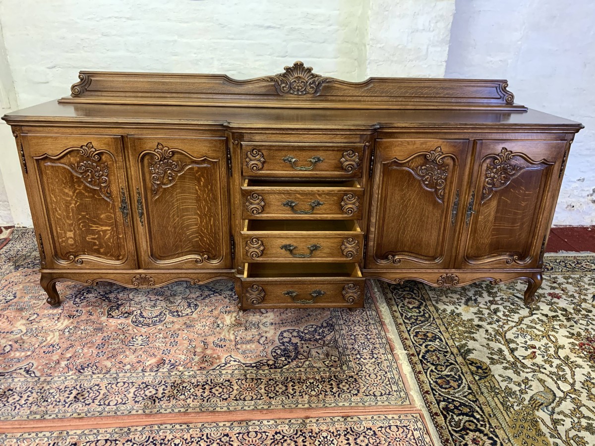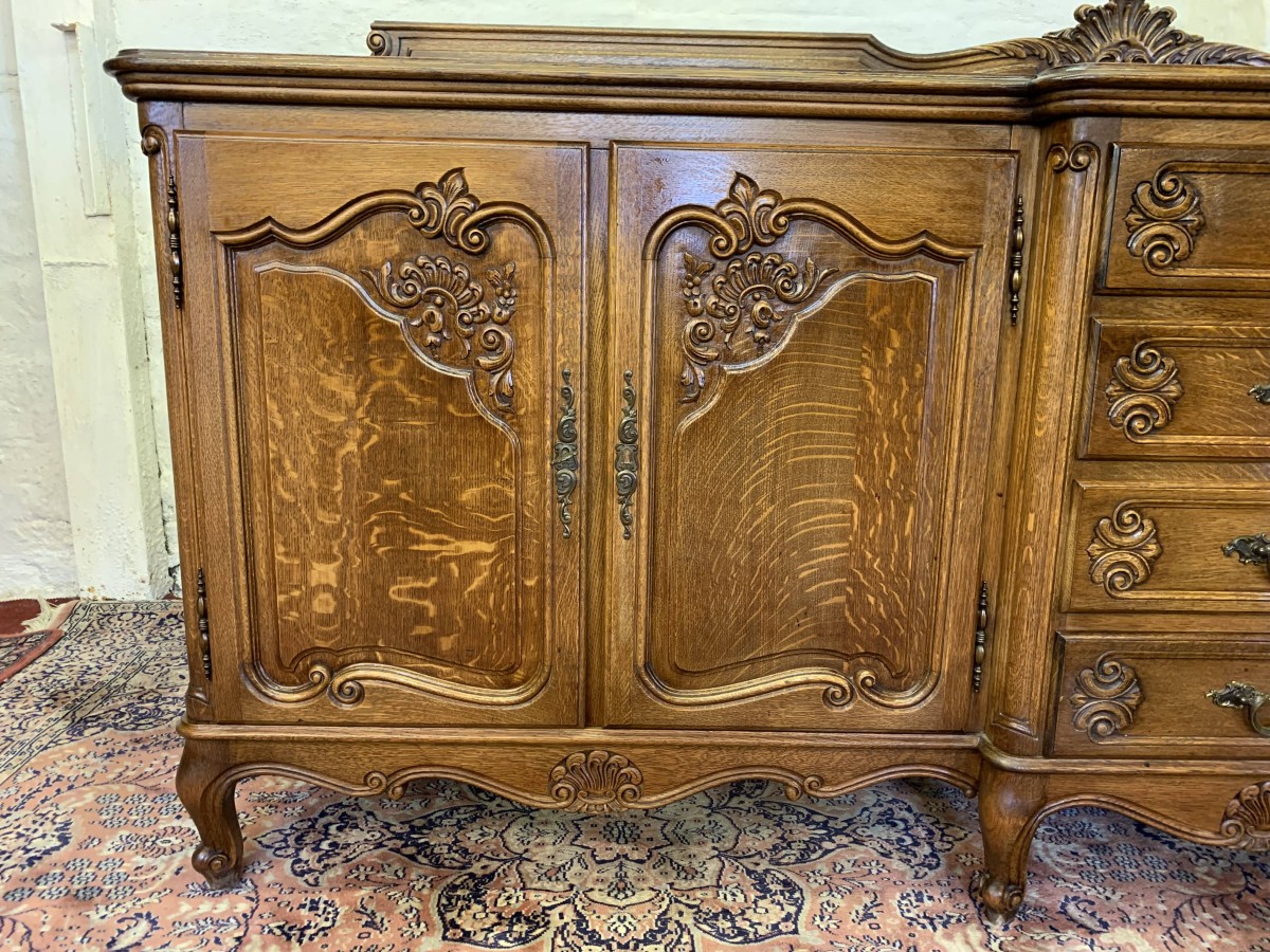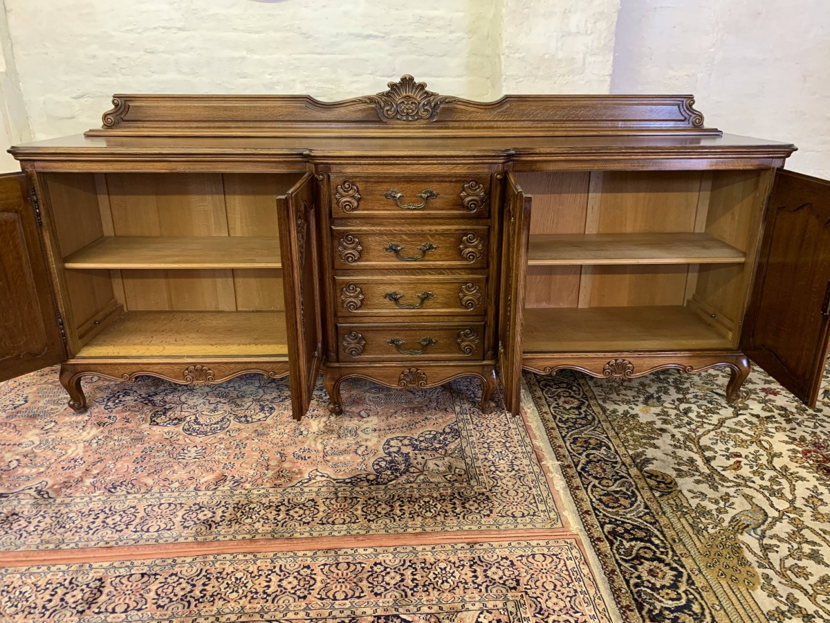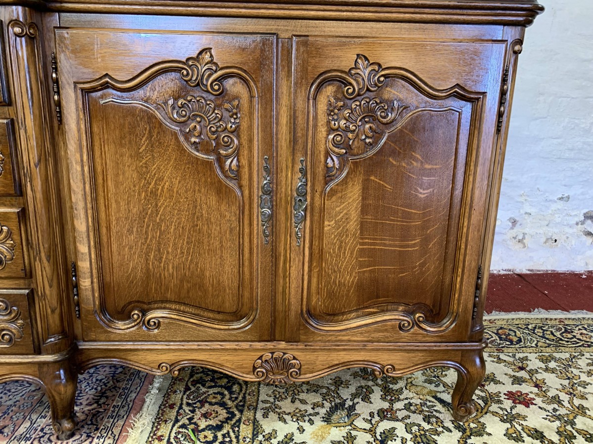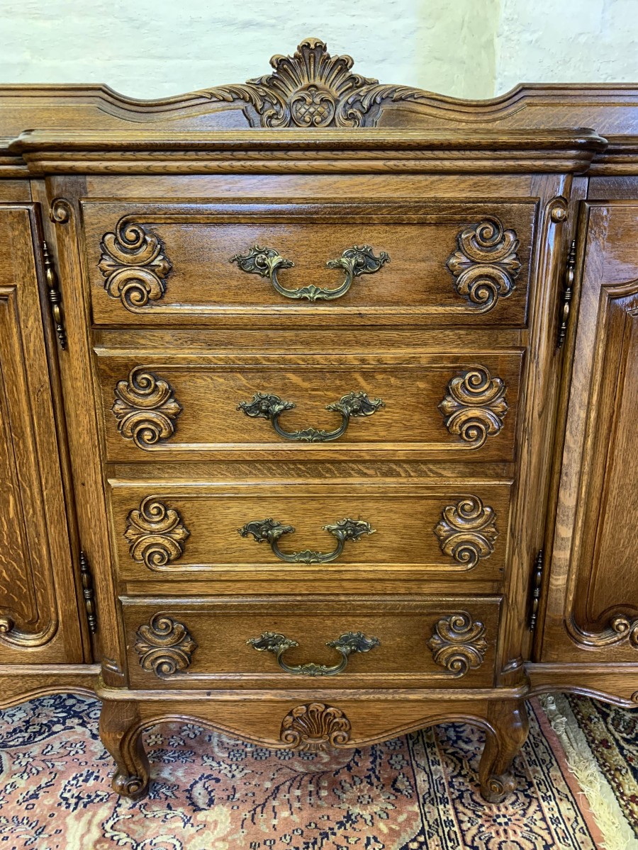 The French shaped dresser has a central brakefront bank of four carved recessed panelled drawers, each drawer having an ornate brass handle. To the left-hand side are a pair of carved recessed panelled lockable doors, each door having a pair of brass hinges and ornate brass escutcheon. The doors open to reveal a removable shelf. To the right-hand side are also a pair of carved recessed panelled lockable doors, each door having brass hinges and brass decorative escutcheon. The doors open to reveal a removable shelf. Shaped carved skirt this stunning credenza stands on four carved cabriole shaped legs to the front.
