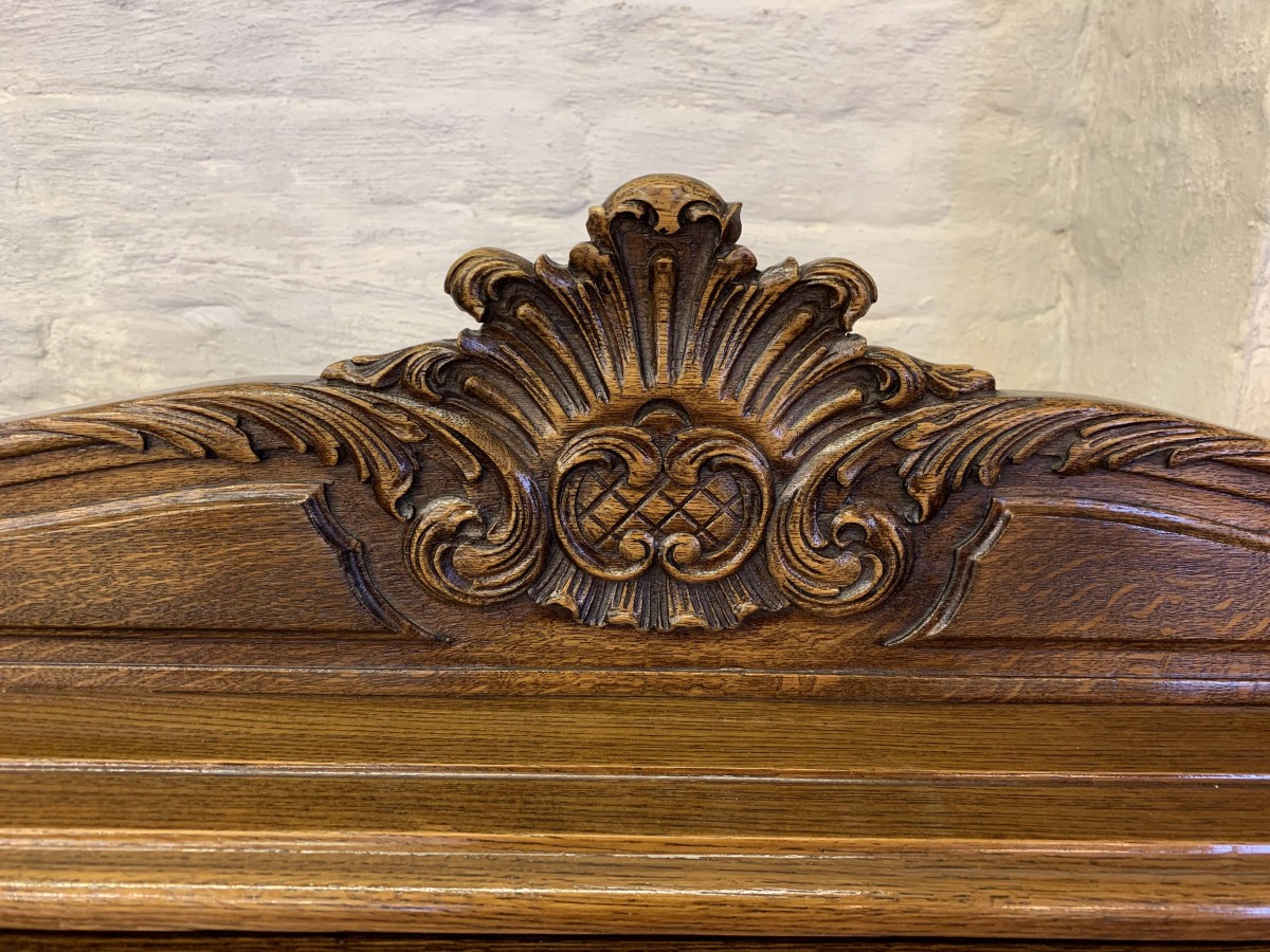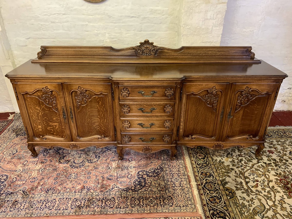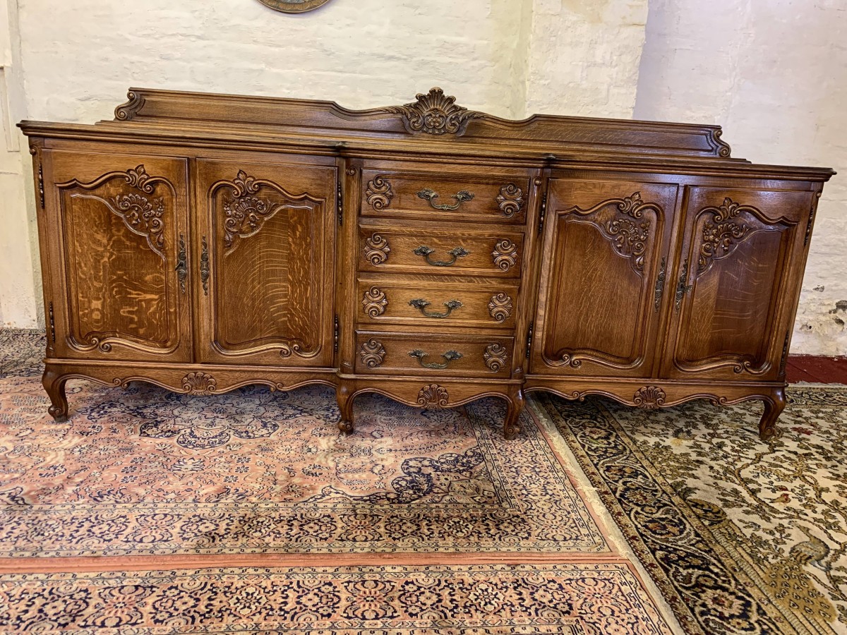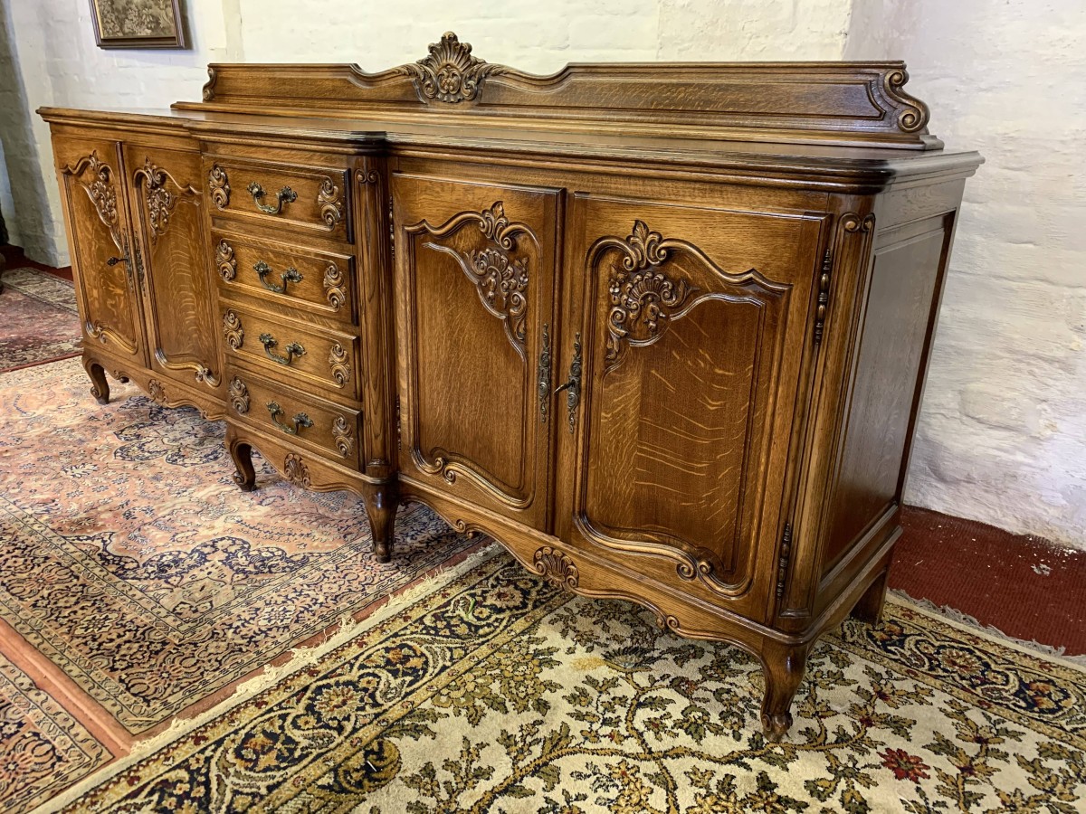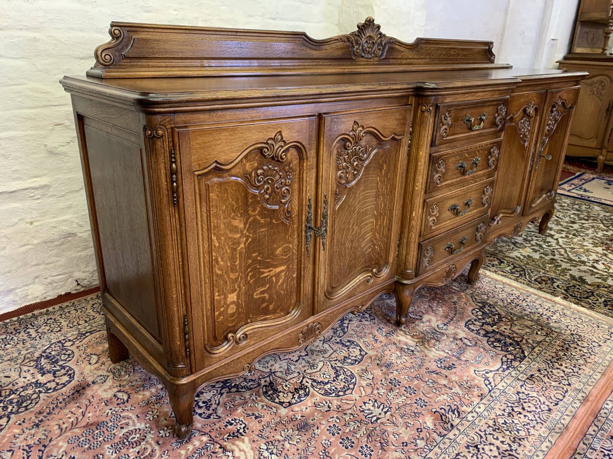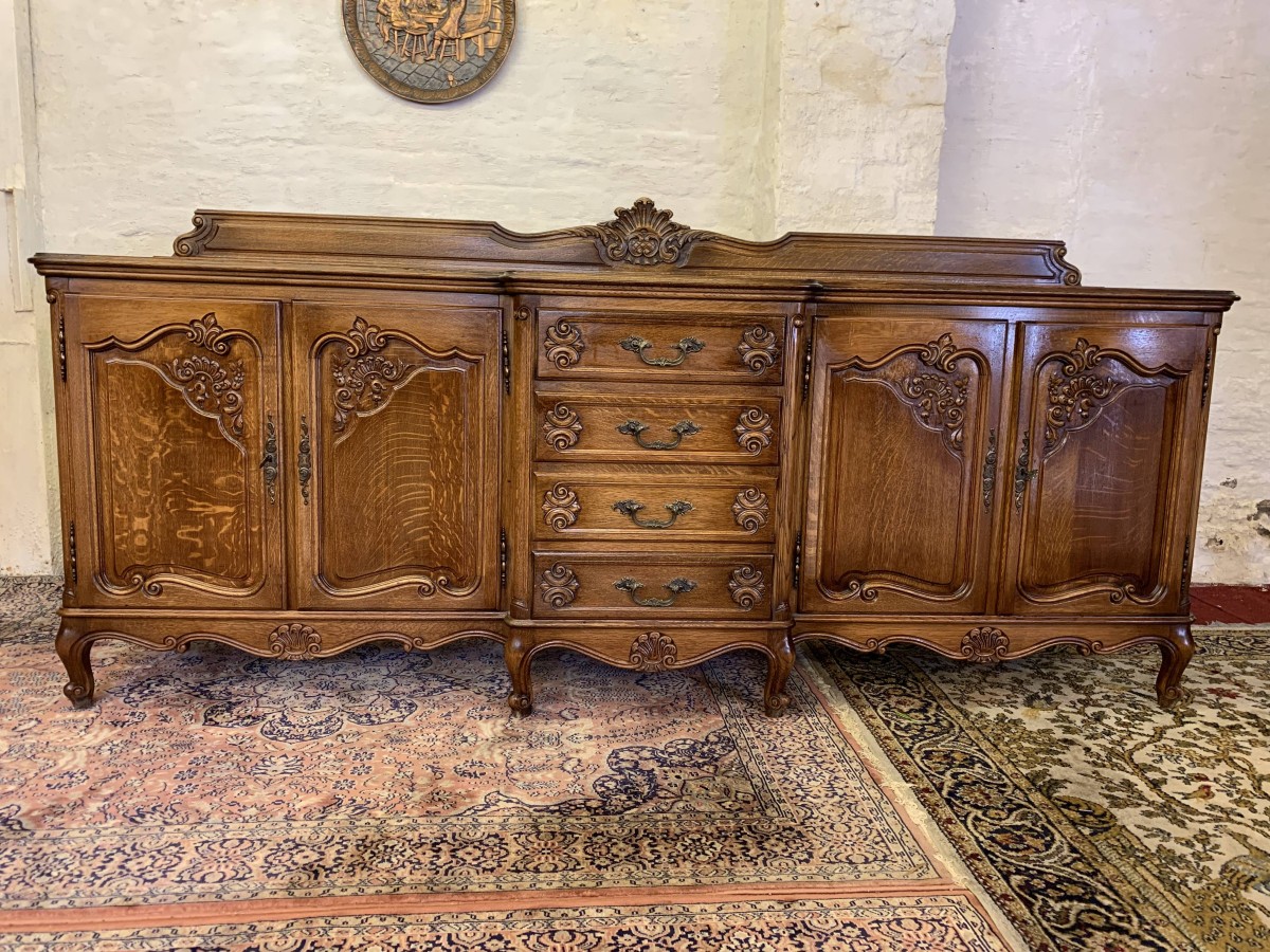 The French shaped dresser has a central brakefront bank of four carved recessed panelled drawers, each drawer having an ornate brass handle. To the left-hand side are a pair of carved recessed panelled lockable doors, each door having a pair of brass hinges and ornate brass escutcheon. The doors open to reveal a removable shelf. To the right-hand side are also a pair of carved recessed panelled lockable doors, each door having brass hinges and brass decorative escutcheon. The doors open to reveal a removable shelf. Shaped carved skirt this stunning credenza stands on four carved cabriole shaped legs to the front.