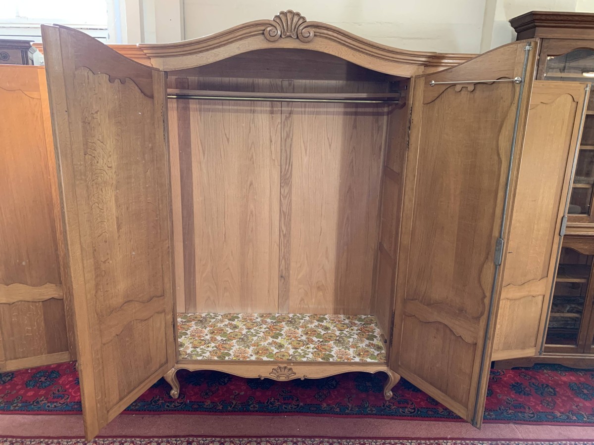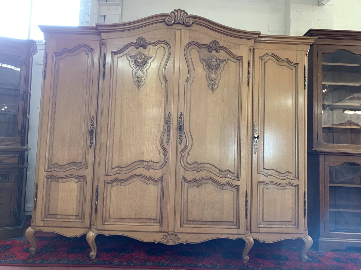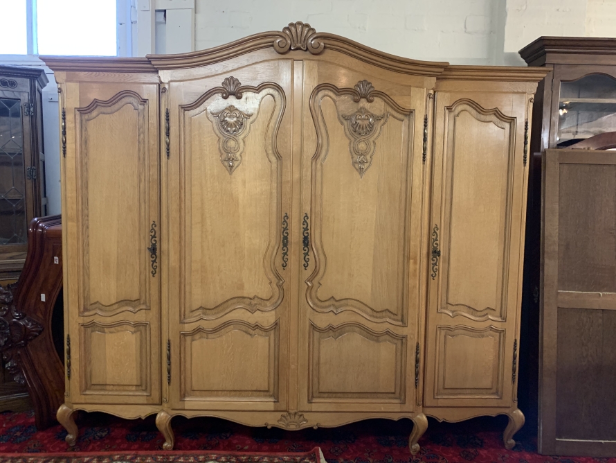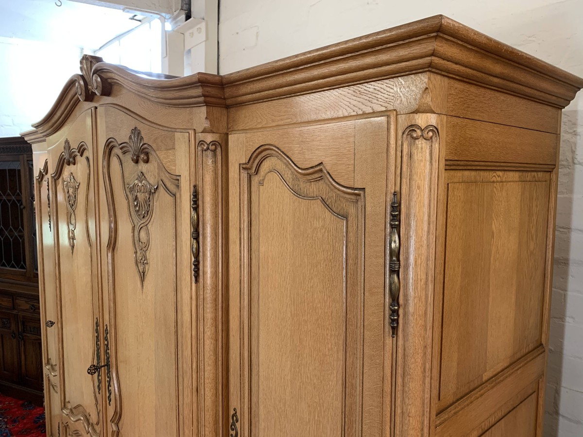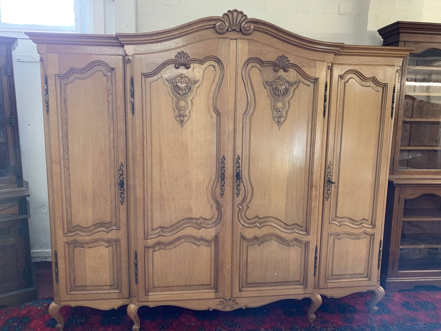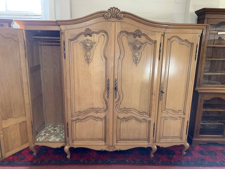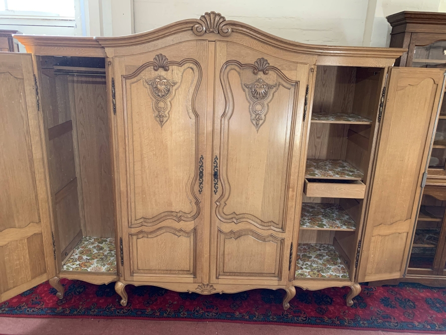 The shaped oversailing top rises to a central carving. Below are four lockable recessed panelled doors, the pair of brakefront central doors having decorative carvings. Each of the four doors have decorative brass hinges and escutcheon. The left-hand door and pair of brake front central doors open to reveal a shelf above a brass hanging rail. The right-hand door opens to reveal three removable shelves, one shelf having a drawer below. The armoire offers fantastic amount of storage. Recessed panelled sides shaped skirt with central carving, this stunning armoire stands on four cabriole shaped legs to the front. Please note this wardrobe splits down for easy transportation and delivery into any home.