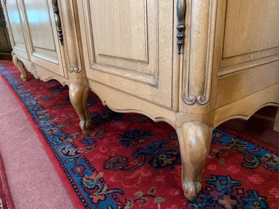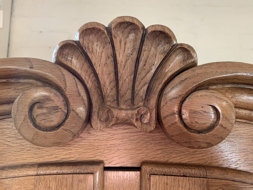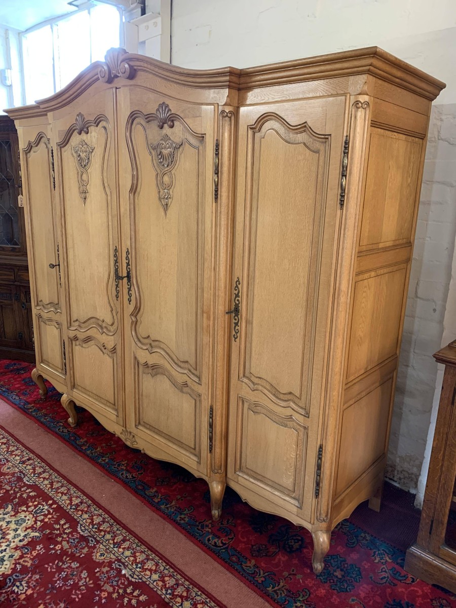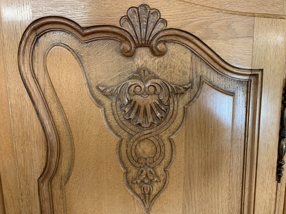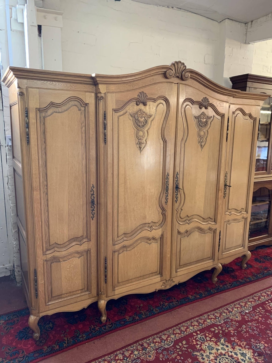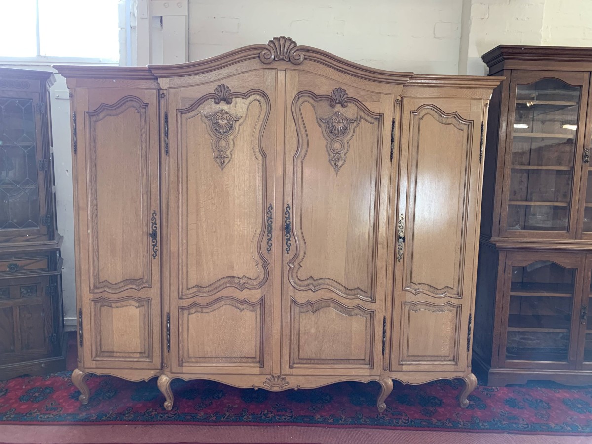 The shaped oversailing top rises to a central carving. Below are four lockable recessed panelled doors, the pair of brakefront central doors having decorative carvings. Each of the four doors have decorative brass hinges and escutcheon. The left-hand door and pair of brake front central doors open to reveal a shelf above a brass hanging rail. The right-hand door opens to reveal three removable shelves, one shelf having a drawer below. The armoire offers fantastic amount of storage. Recessed panelled sides shaped skirt with central carving, this stunning armoire stands on four cabriole shaped legs to the front. Please note this wardrobe splits down for easy transportation and delivery into any home.
