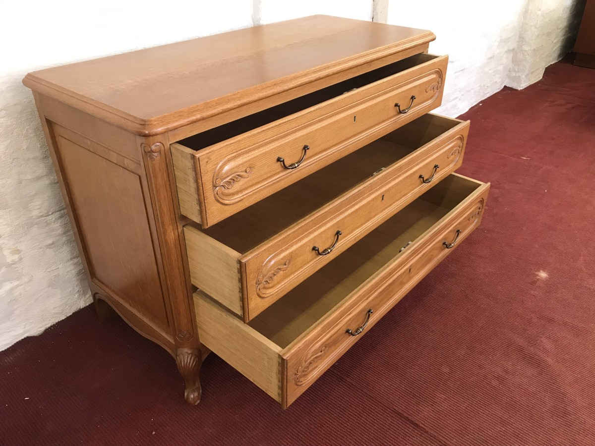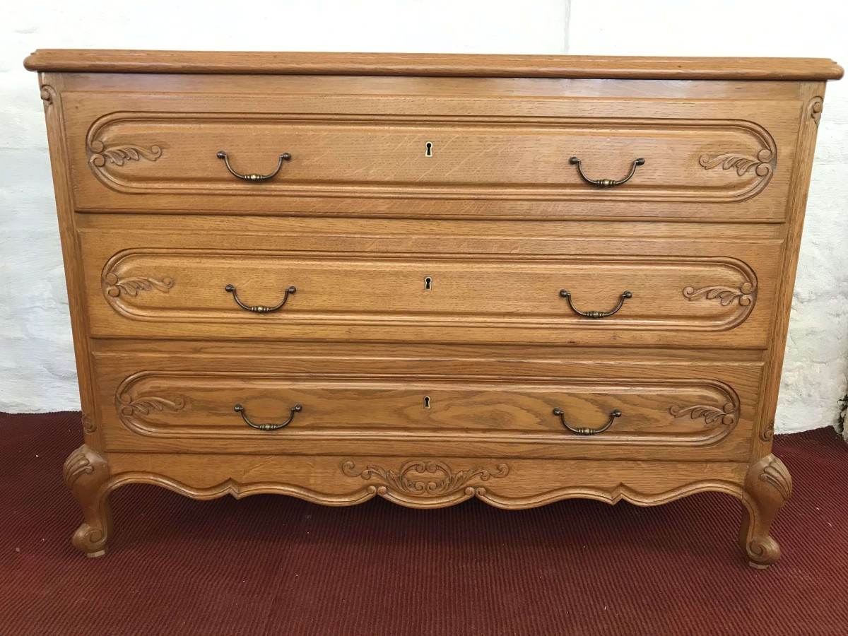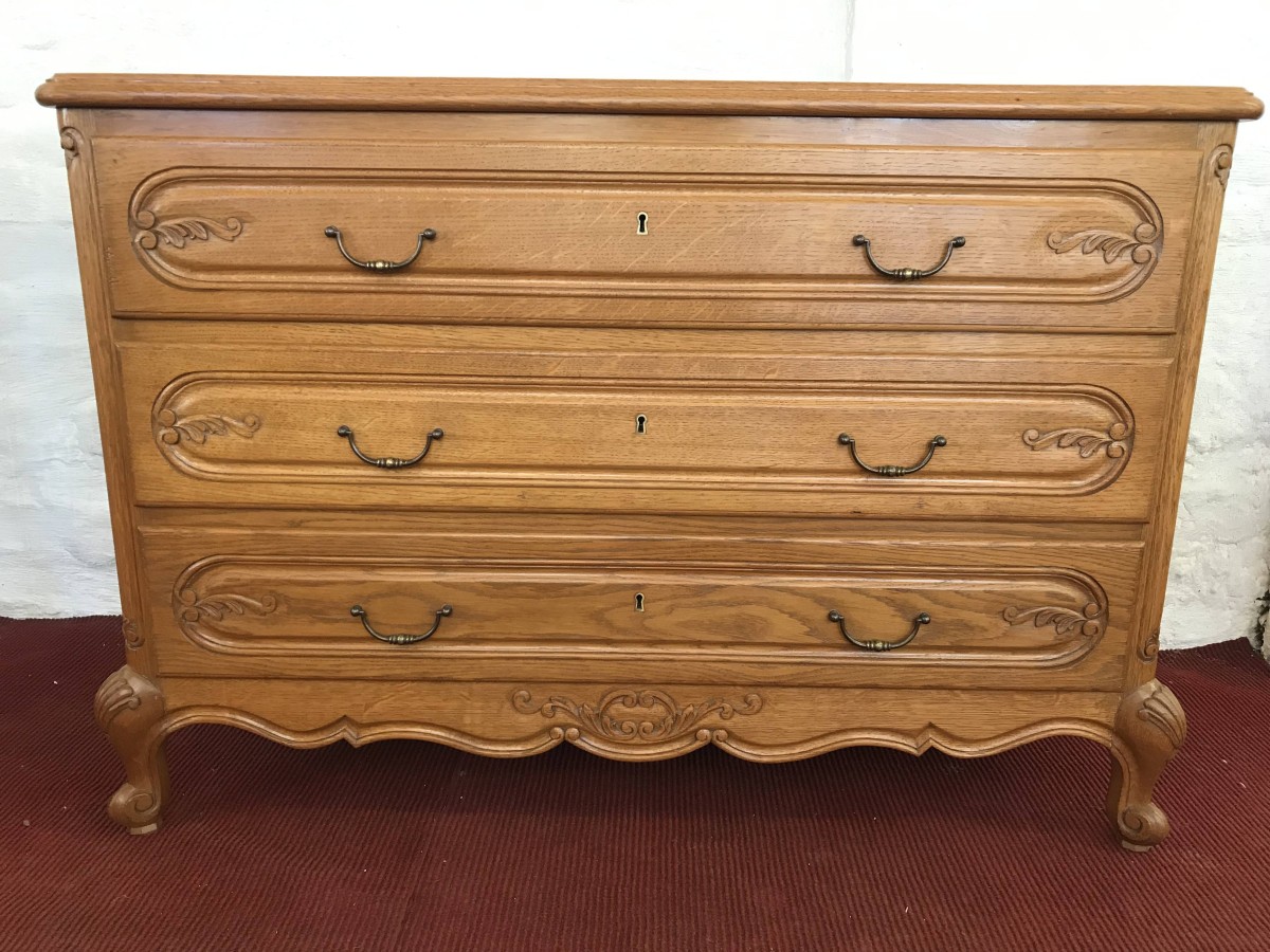 Outstanding Quality French Carved Oak Chest Of Three Lockable Drawers.
