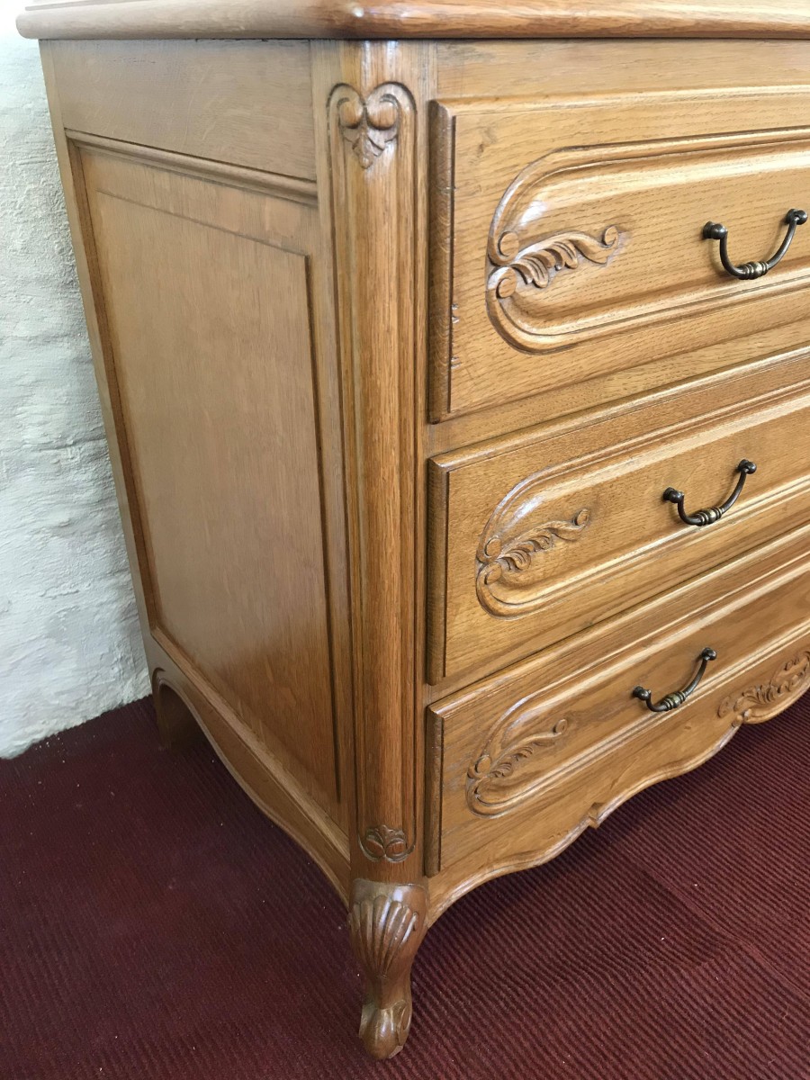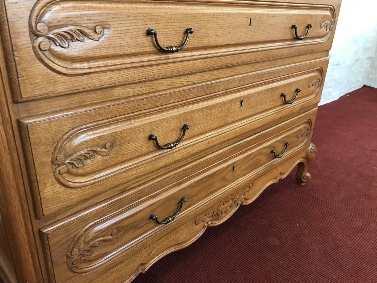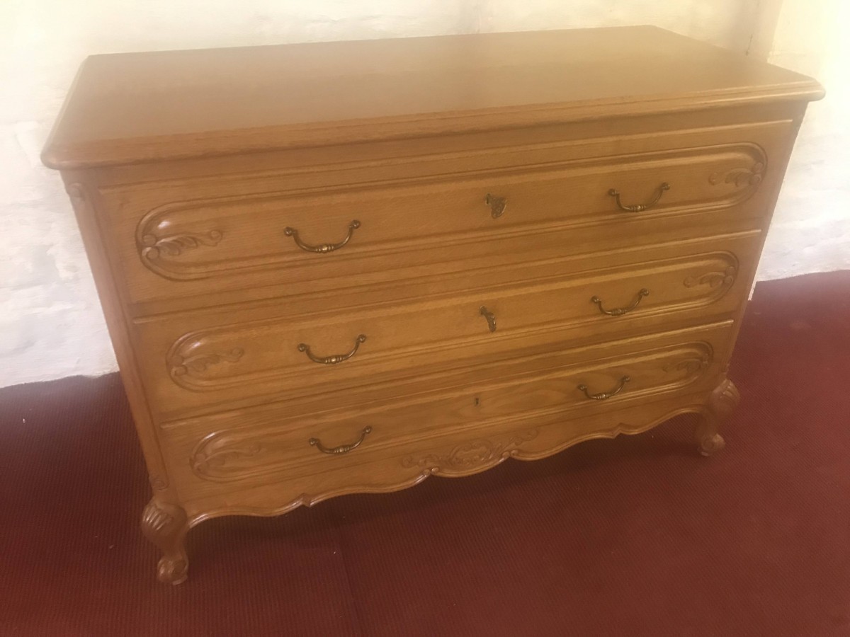 Outstanding Quality French Carved Oak Chest Of Three Lockable Drawers.