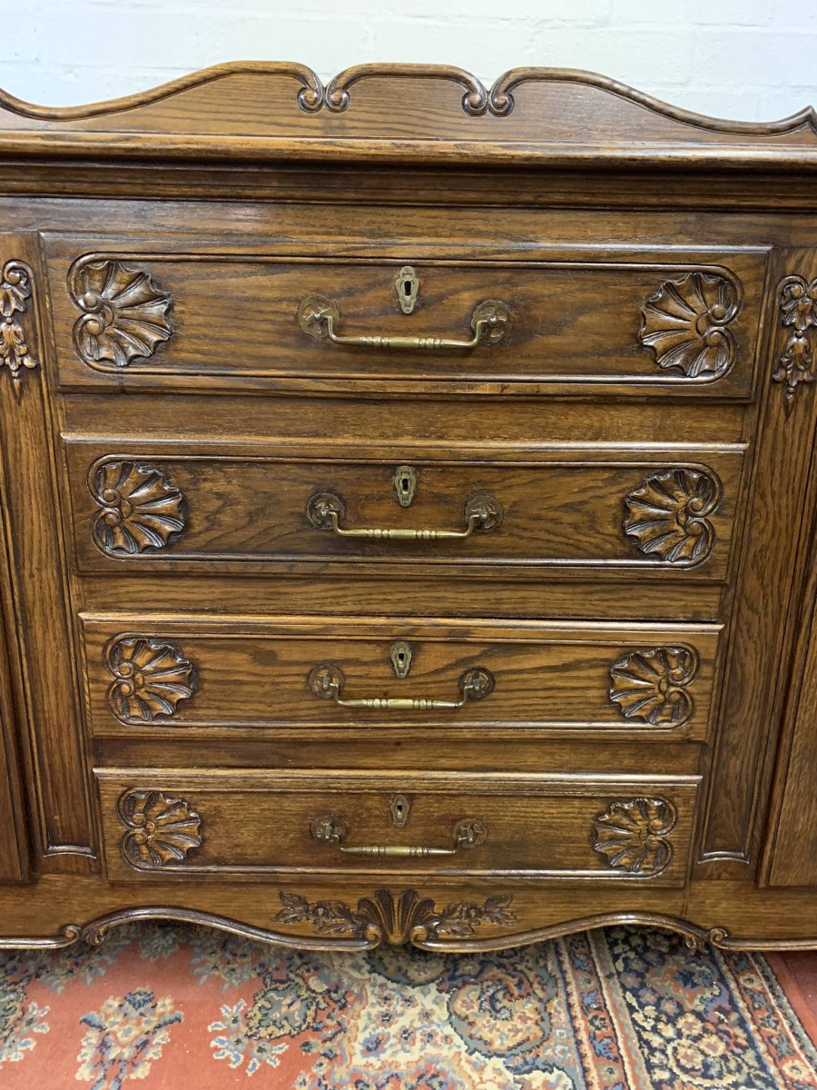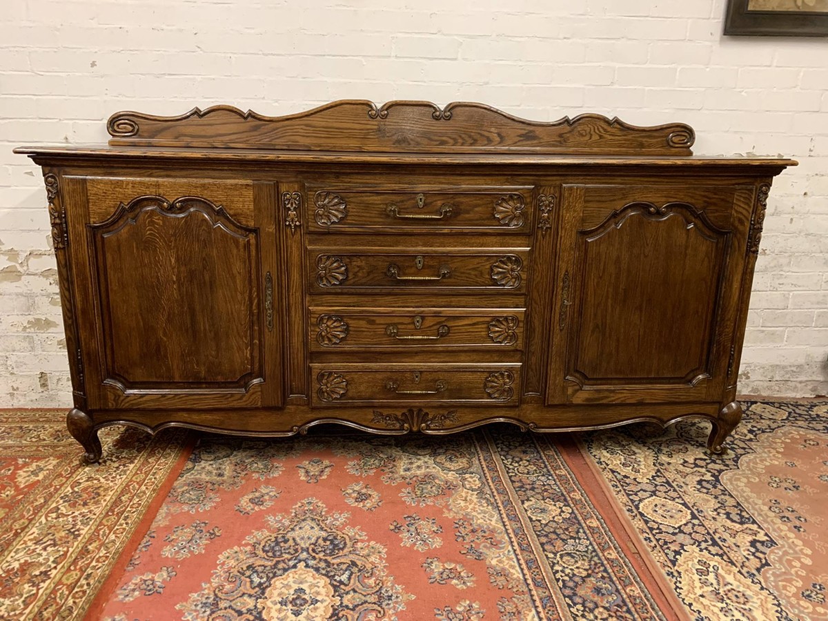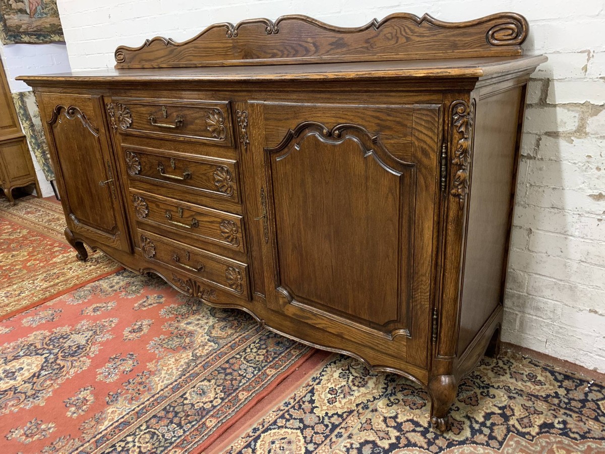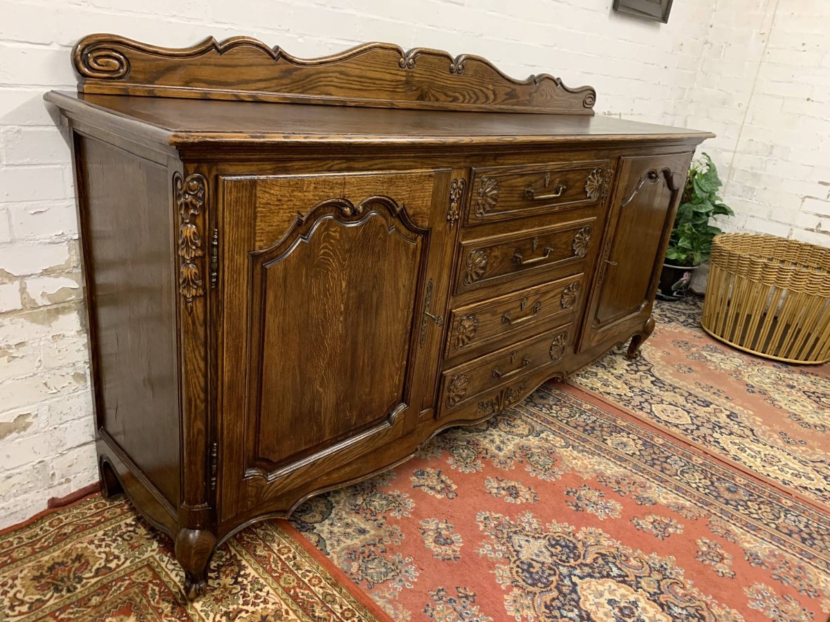 This fabulous French dresser is in excellent condition. The shaped back is removable. The oversailing top has a cross banded edge. Below are a central bank of four carved lockable drawers, each drawer having a brass drop handle. The drawers are flanked by a pair of shaped recessed panelled lockable cupboard doors, each drawer having brass hinges, decorative brass escutcheon and key. The doors open to reveal a removable shelf. Recessed panelled sides, shaped skirt with decorative central carving this super French enfilade stands on two carved cabriole shaped legs to the front.