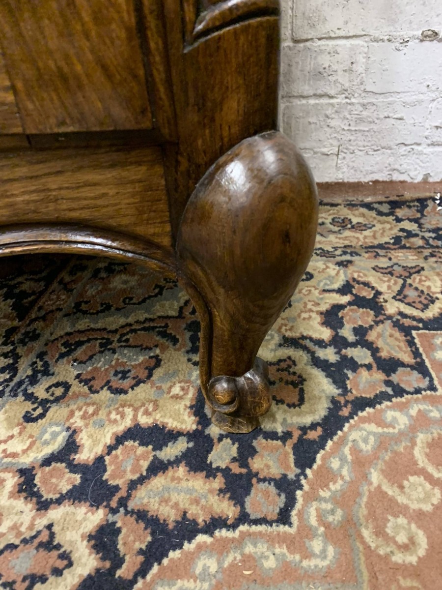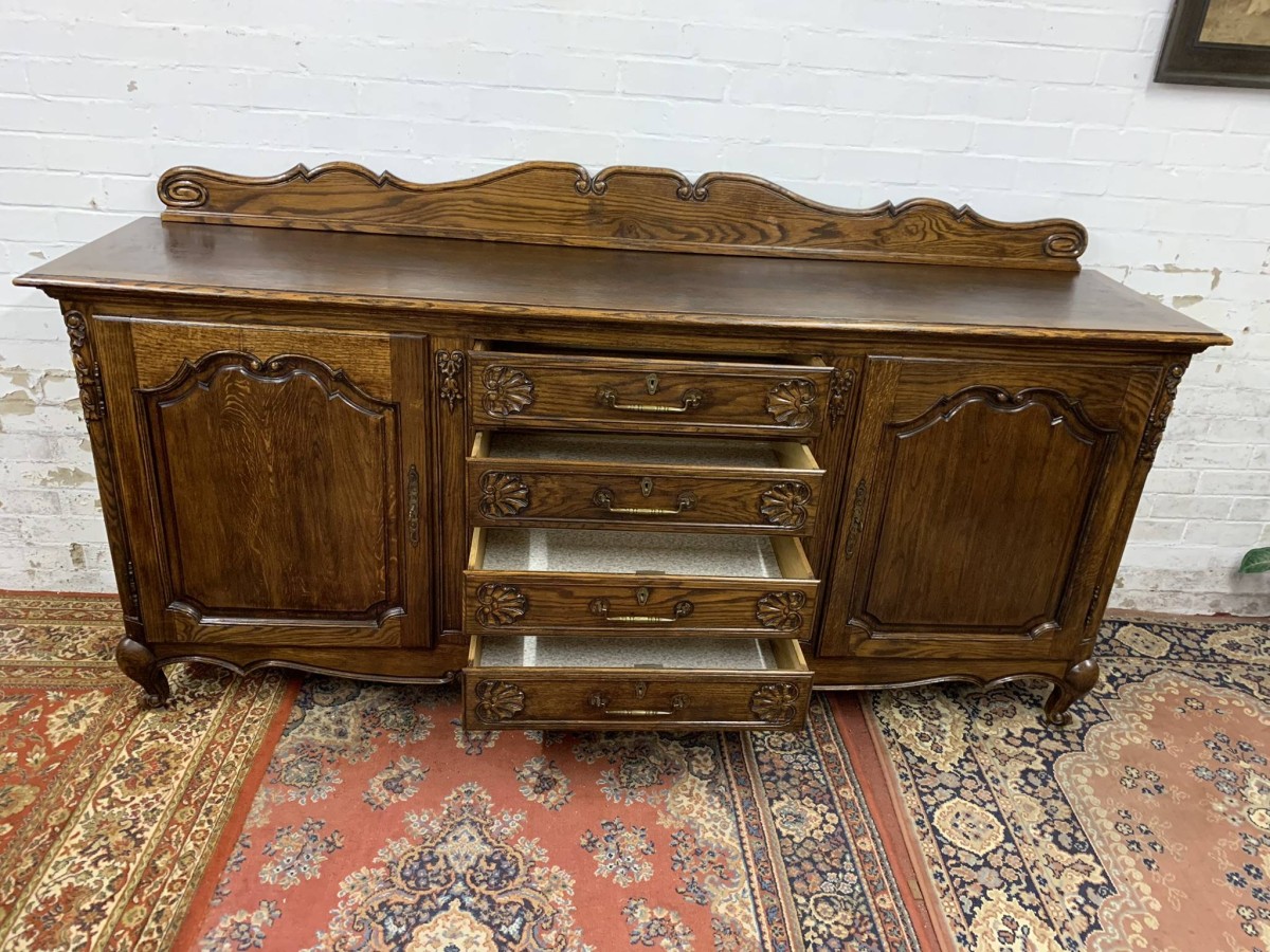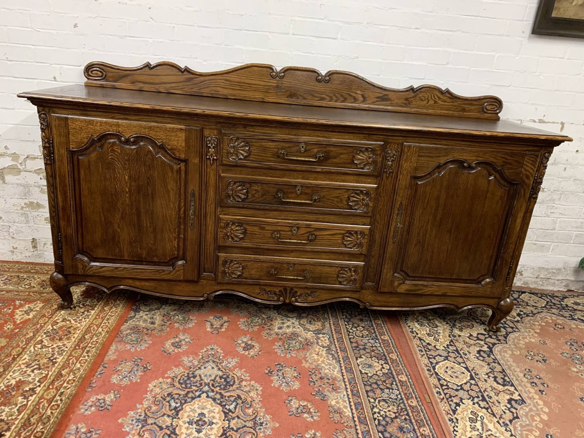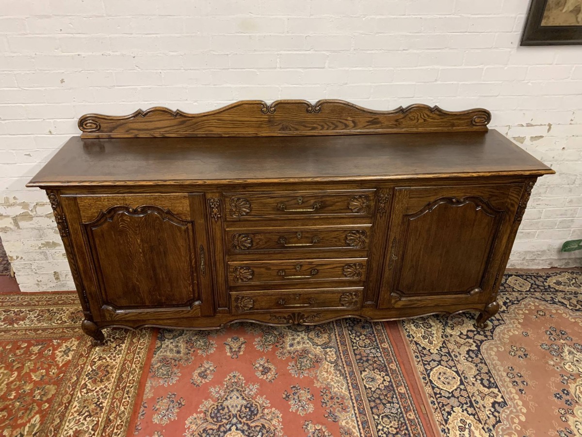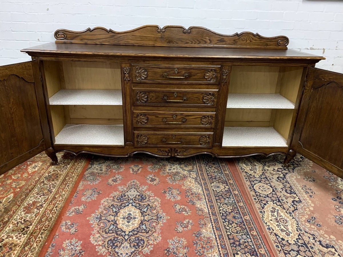 This fabulous French dresser is in excellent condition. The shaped back is removable. The oversailing top has a cross banded edge. Below are a central bank of four carved lockable drawers, each drawer having a brass drop handle. The drawers are flanked by a pair of shaped recessed panelled lockable cupboard doors, each drawer having brass hinges, decorative brass escutcheon and key. The doors open to reveal a removable shelf. Recessed panelled sides, shaped skirt with decorative central carving this super French enfilade stands on two carved cabriole shaped legs to the front.