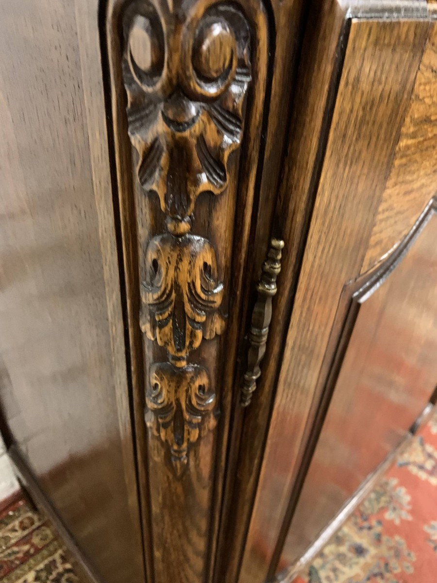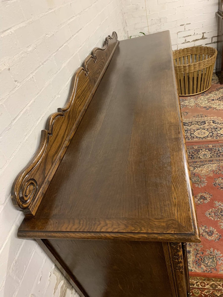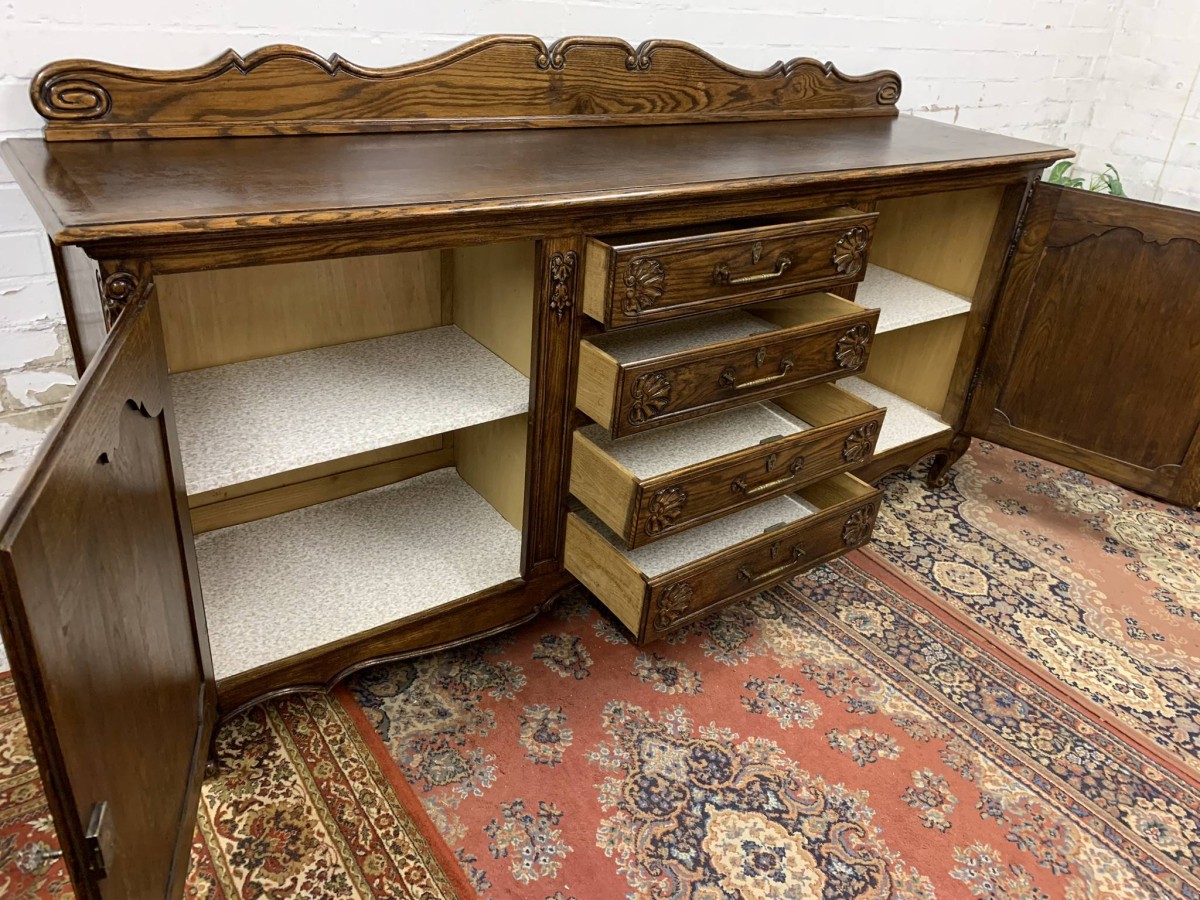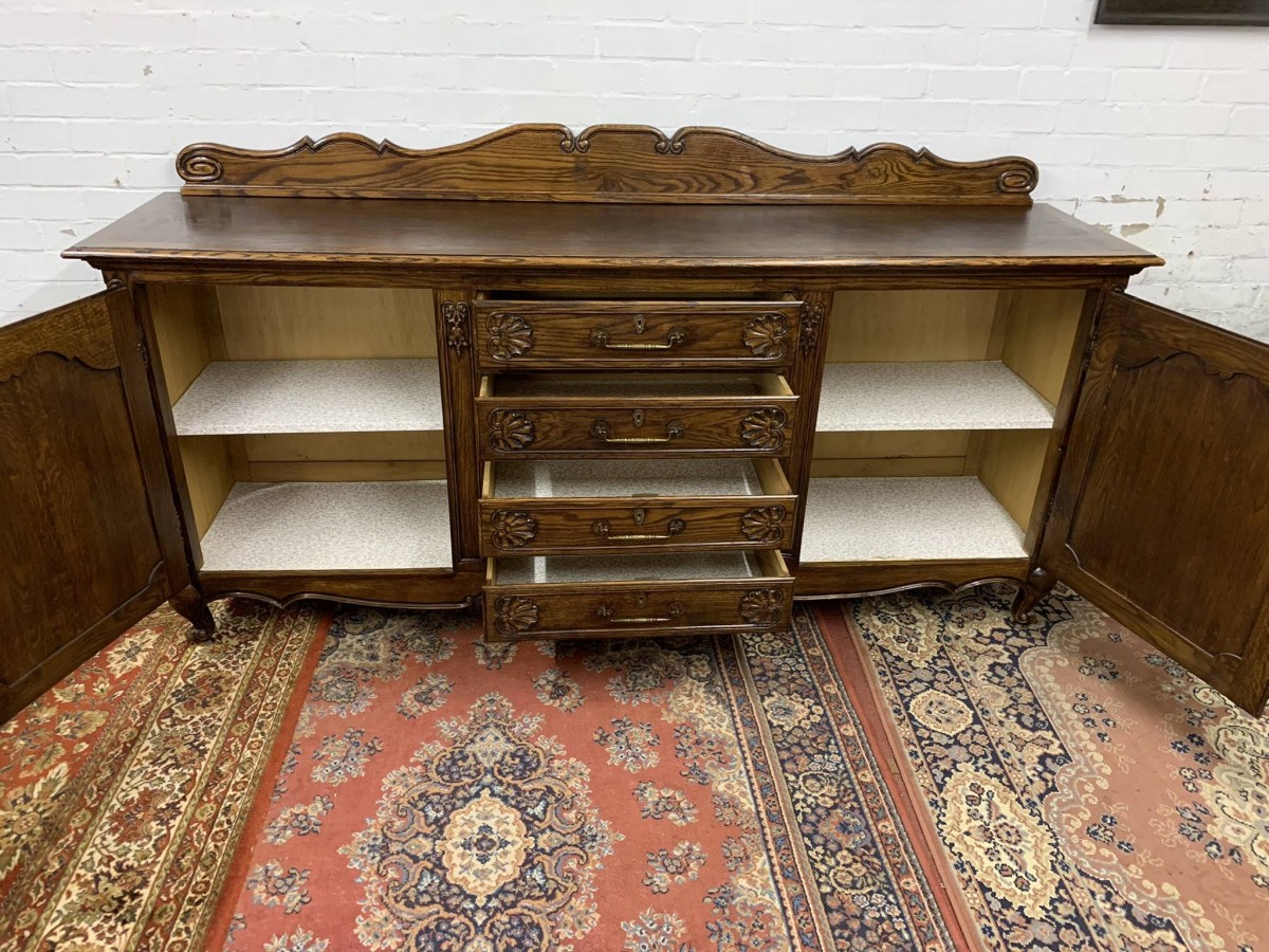 This fabulous French dresser is in excellent condition. The shaped back is removable. The oversailing top has a cross banded edge. Below are a central bank of four carved lockable drawers, each drawer having a brass drop handle. The drawers are flanked by a pair of shaped recessed panelled lockable cupboard doors, each drawer having brass hinges, decorative brass escutcheon and key. The doors open to reveal a removable shelf. Recessed panelled sides, shaped skirt with decorative central carving this super French enfilade stands on two carved cabriole shaped legs to the front.