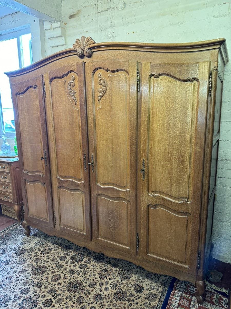 The shaped oversailing top rises to a central carving, below are four lockable doors, the central pair of doors having carvings to the top. Each of the four doors has brass hinges and brass escutcheon. The left-hand door and pair of central doors open to reveal a hanging rail with a shelf above. The right-hand door opens to reveal four removable shelves, one with a drawer below. Recessed panelled sides, shaped skirt this fabulous armoire sits on carved cabriole shaped legs to the front.. Please note this armoire completely splits down for easy transportation and delivery into any home.