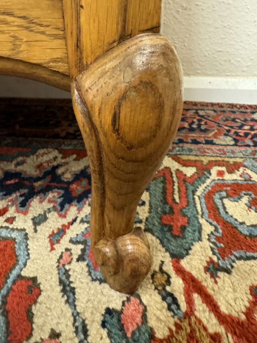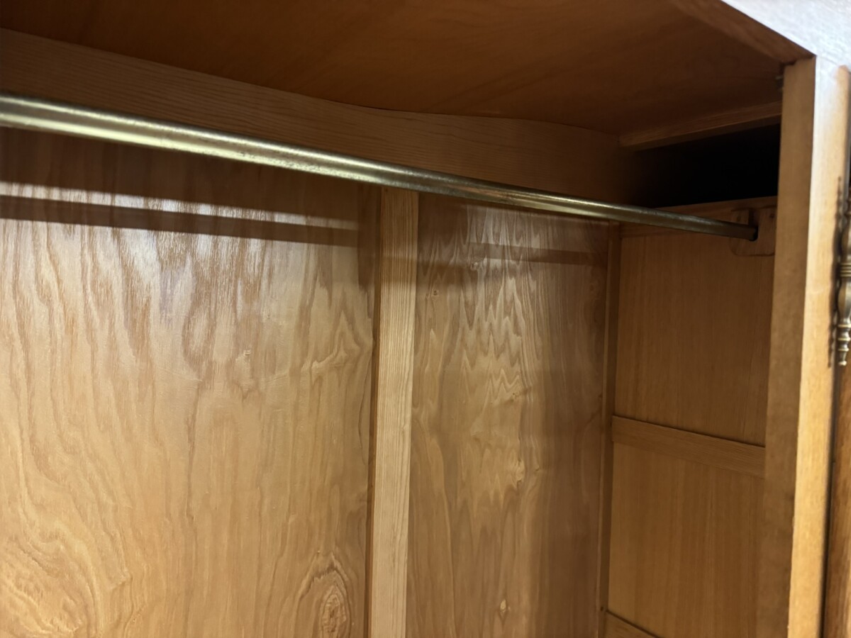 The shaped oversailing top rises to a decorative central carving, below are carved recessed panelled lockable doors, each door has brass hinges, brass escutcheon and key. The left-hand side opens to reveal a brass hanging rail. The right-hand side opens to reveal a brass hanging rail with two removable shelves below. Fielded panelled sides, shaped skirt and standing on two carved cabriole shaped legs to the front. Please note this armoire completely splits down for easy transportation and delivery into any home.