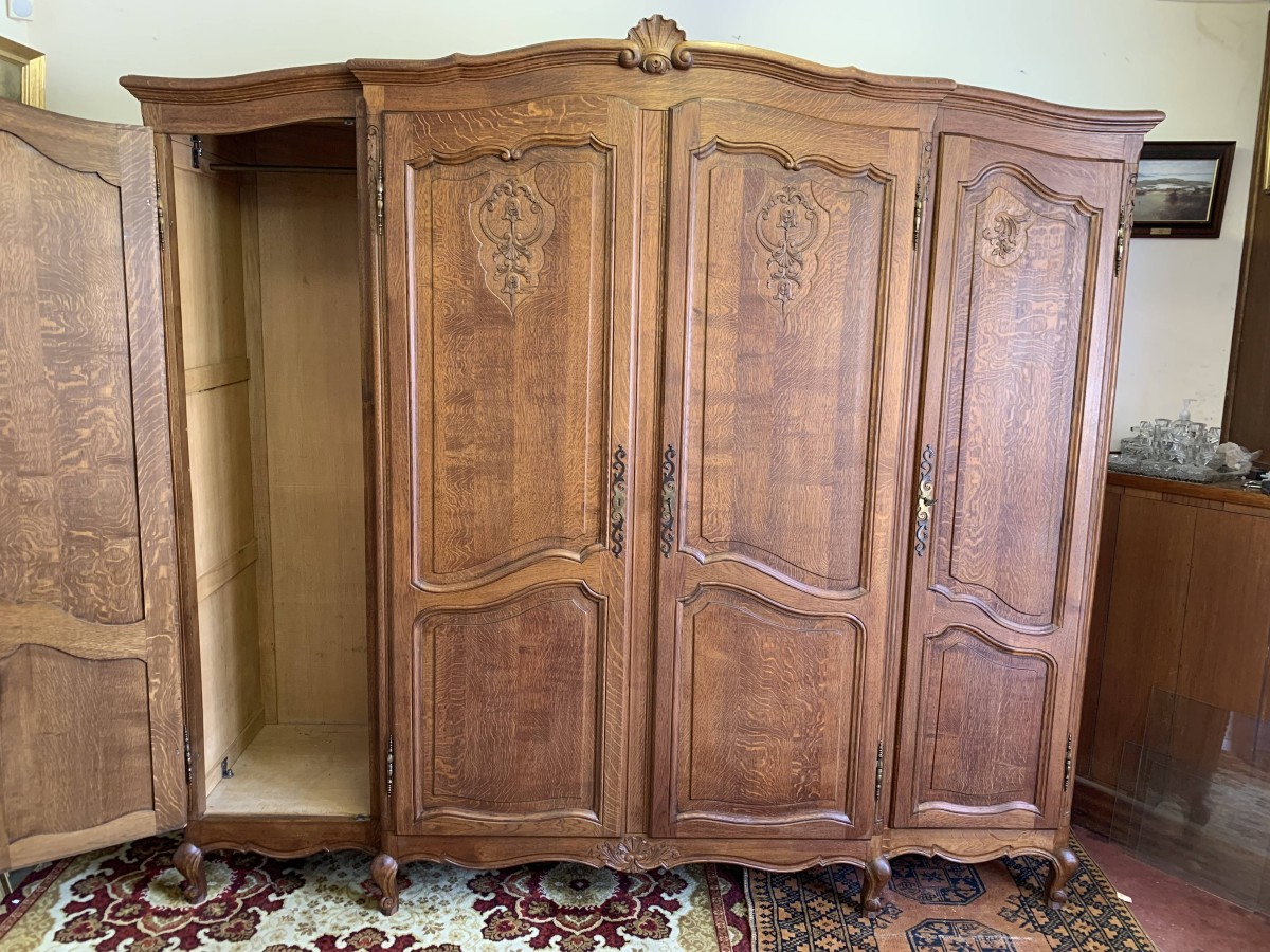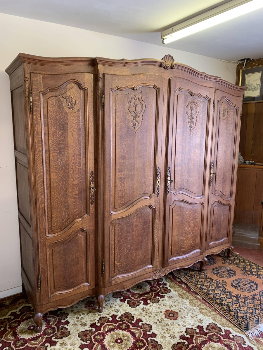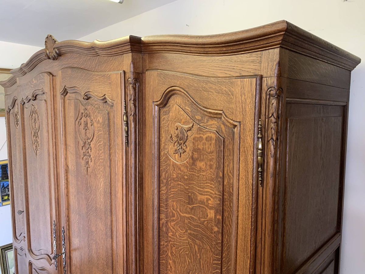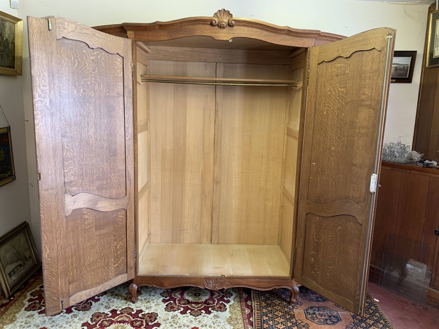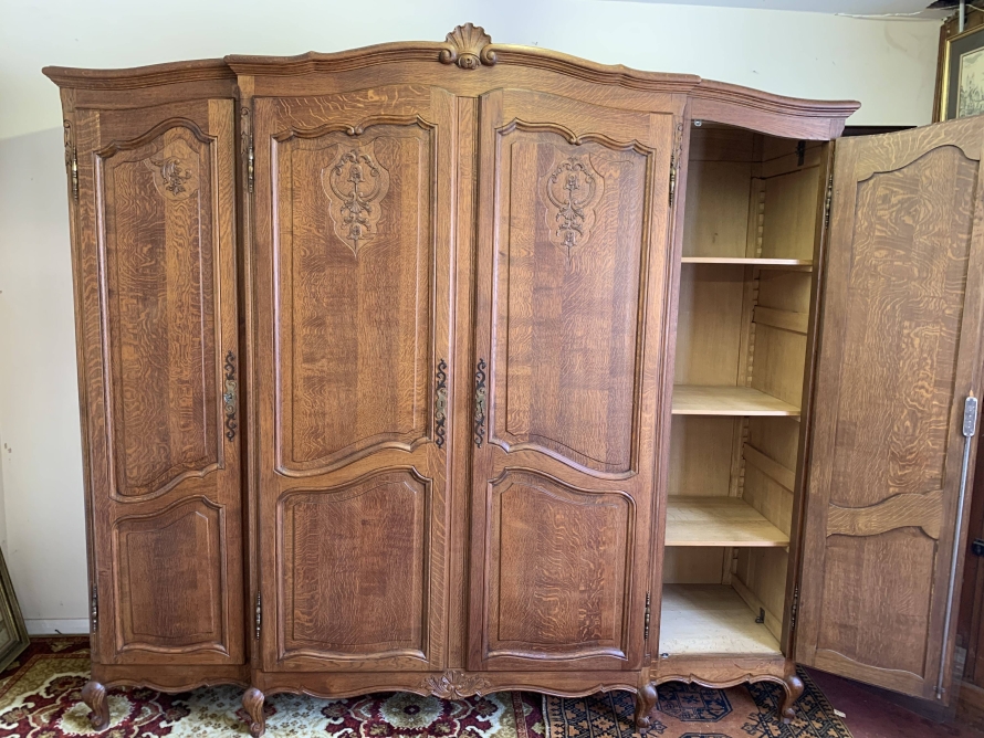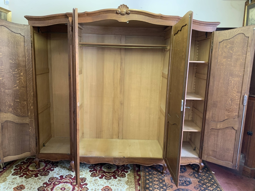 The shaped oversailing top rises to a central carving. Below are four lockable carved recessed panelled doors, each door having brass hinges, ornate brass escutcheon and key. The central brake front pair of doors open to reveal a shelf above a brass hanging rail. The left-hand door opens to reveal a hanging rail. The right-hand door opens to reveal three adjustable and removable shelves. Recessed panelled sides, shaped skirt with central decorative carving this fabulous French armoire stands on four carved cabriole shaped legs to the front. Please note this armoire completely splits down for easy transportation and delivery into any home.