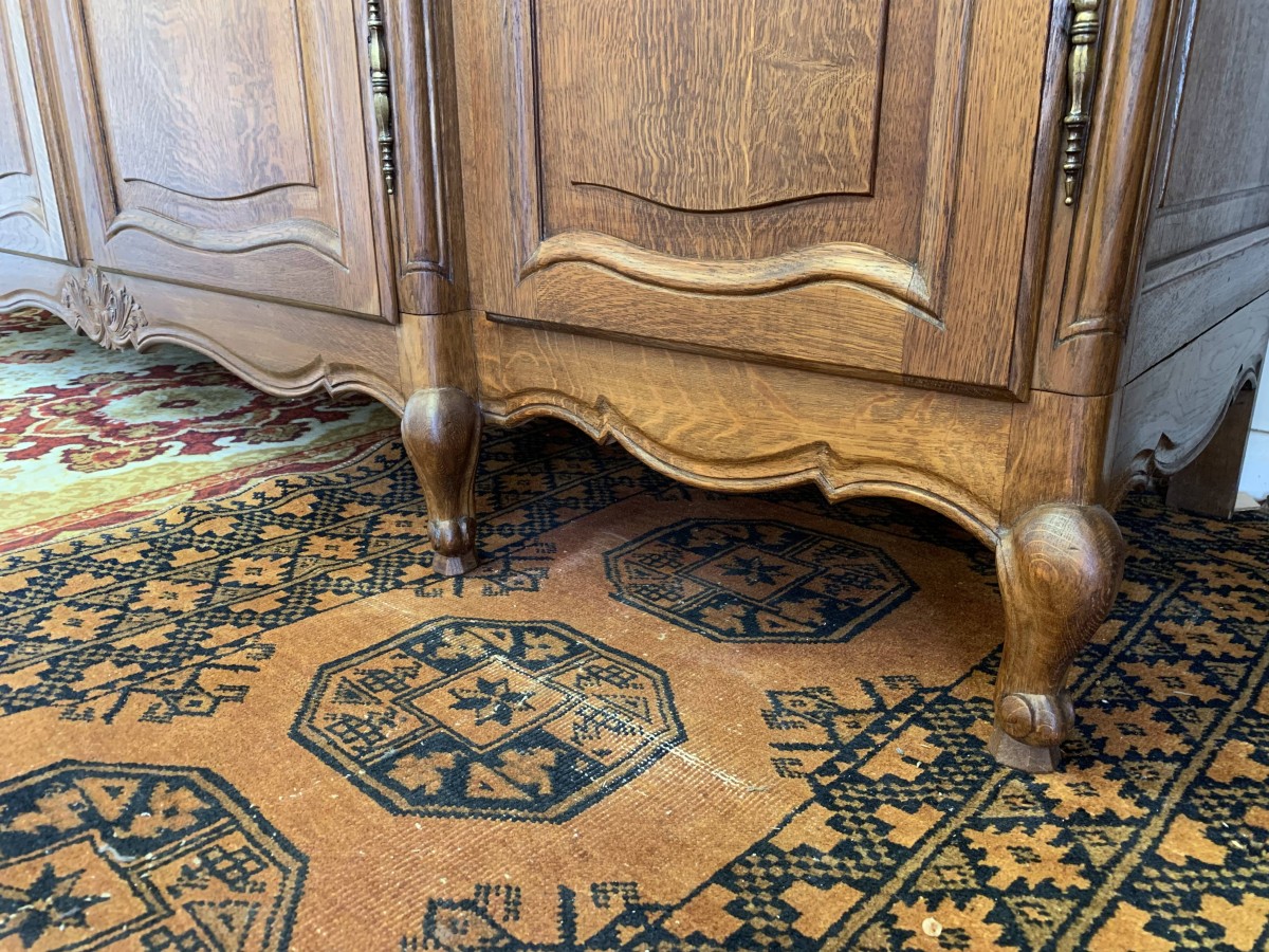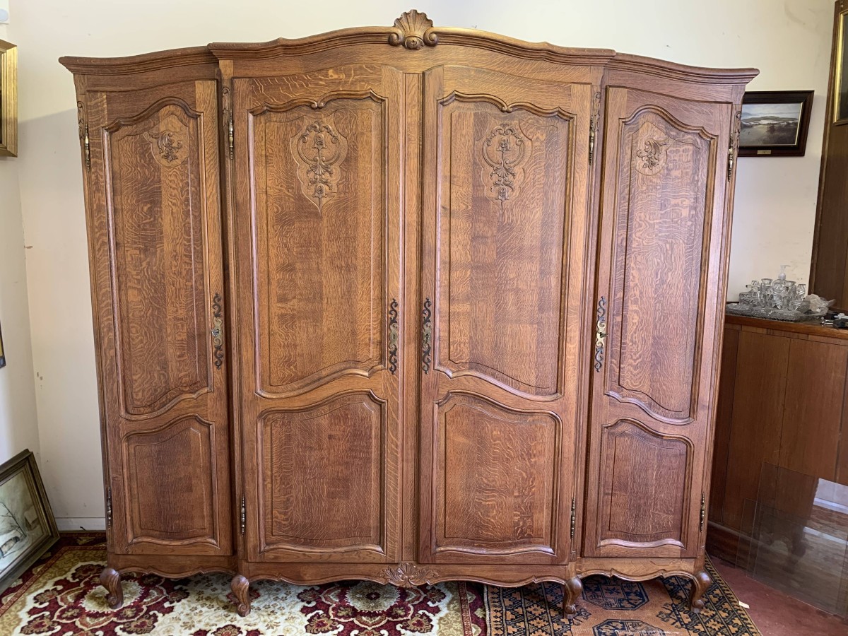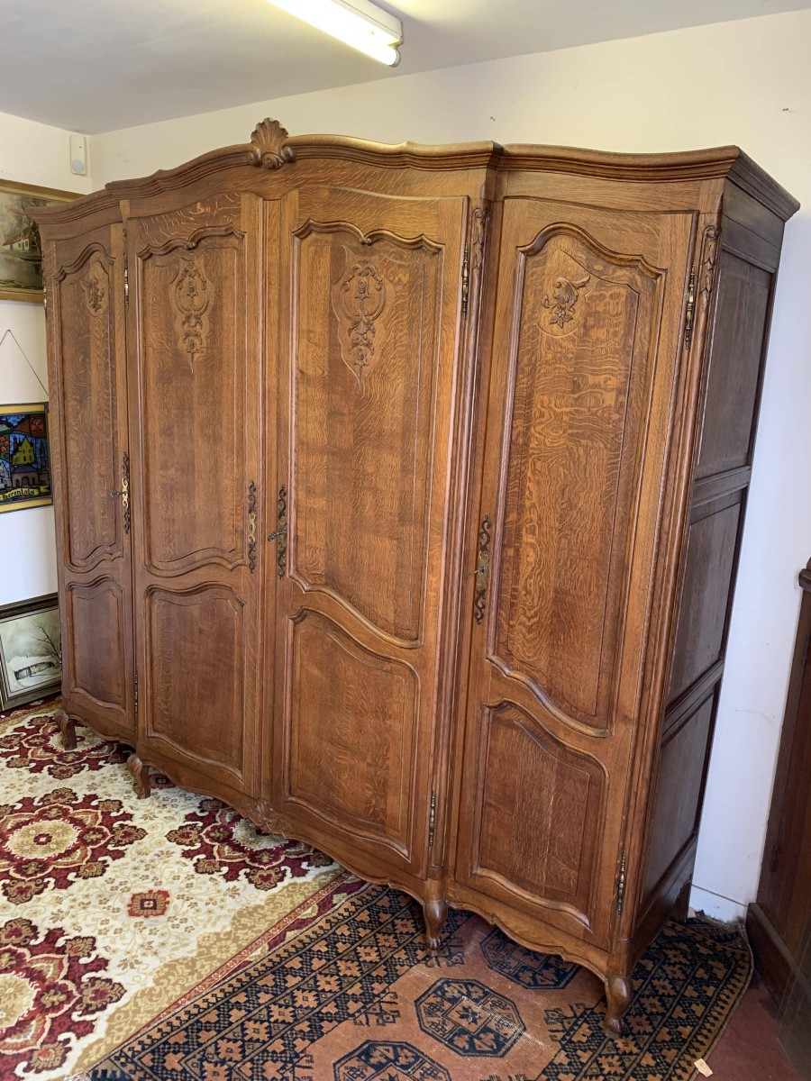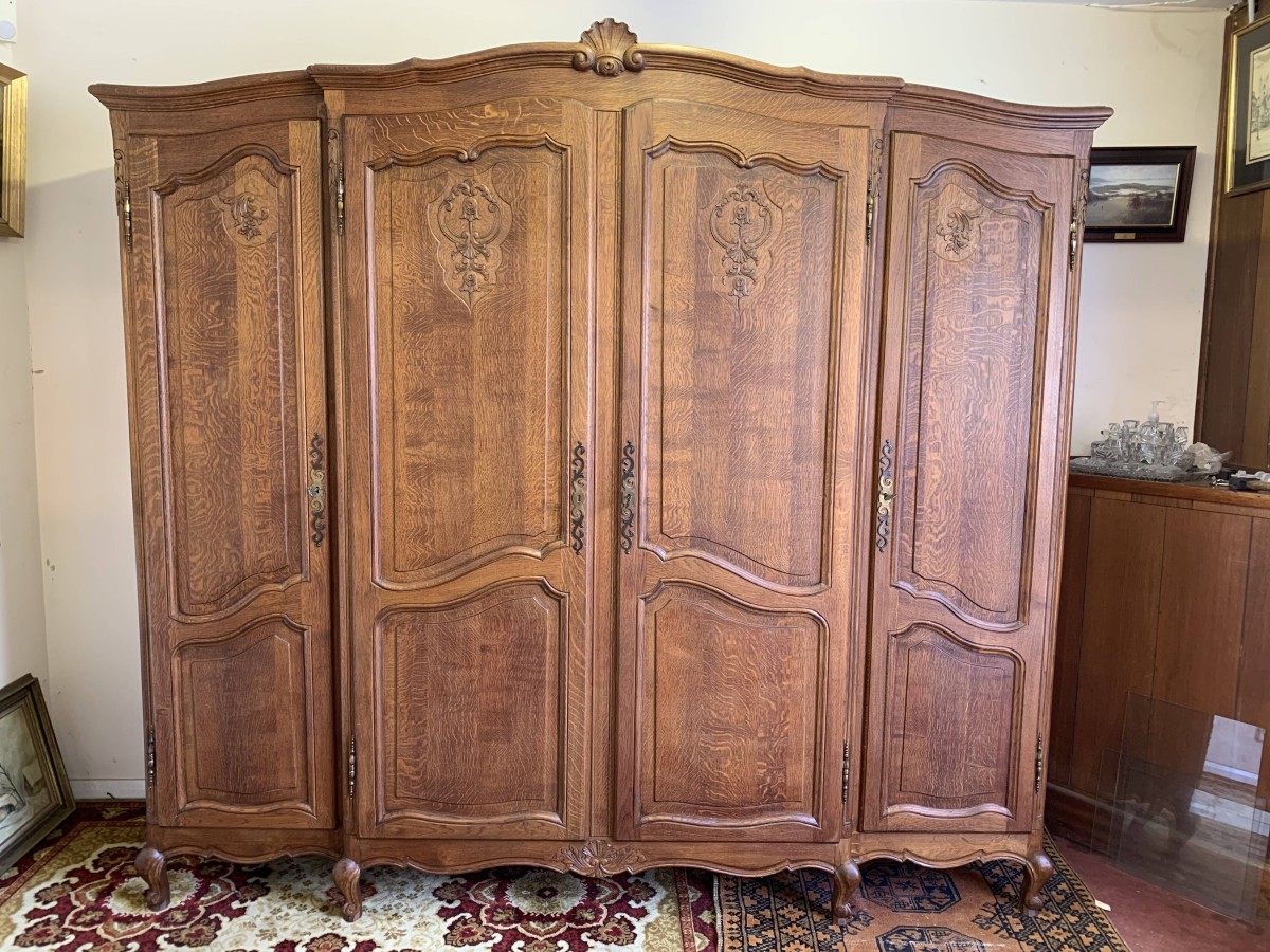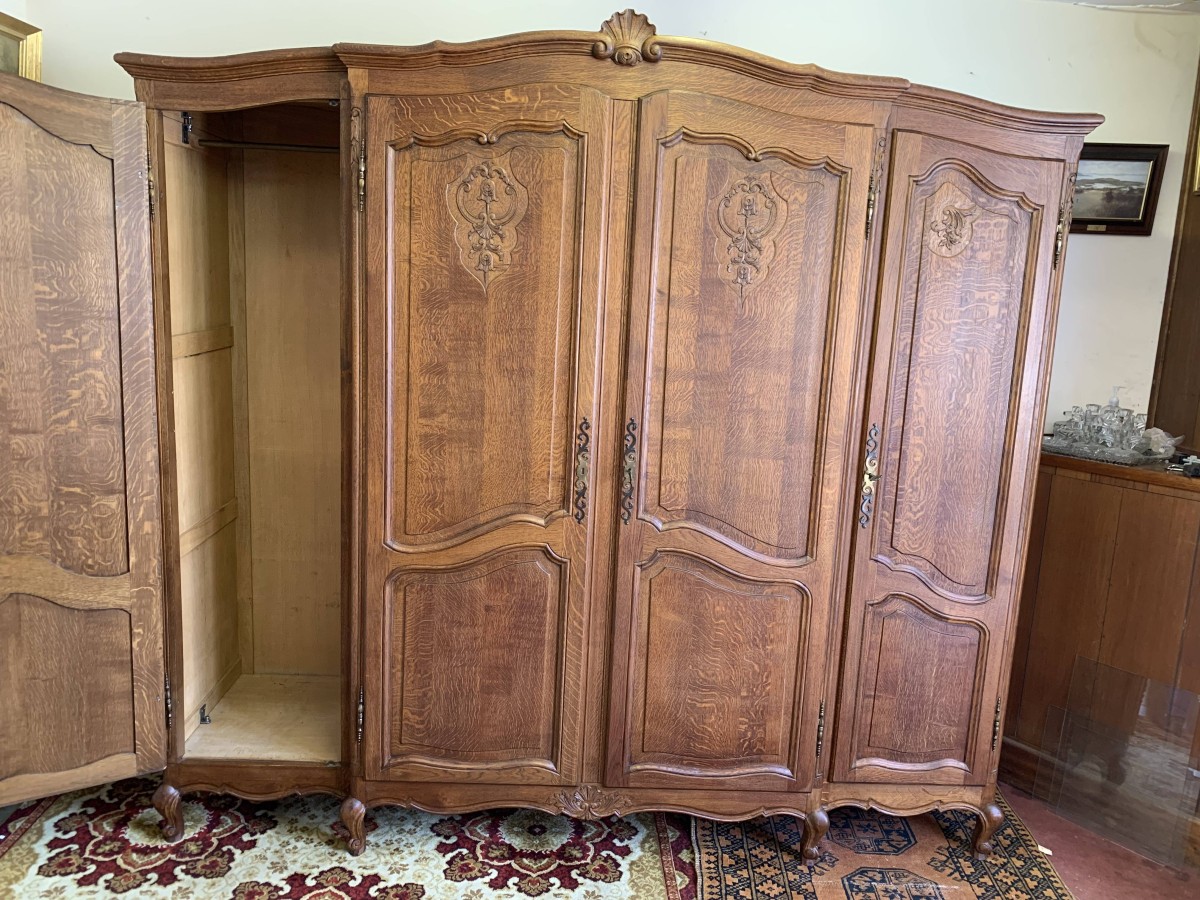 The shaped oversailing top rises to a central carving. Below are four lockable carved recessed panelled doors, each door having brass hinges, ornate brass escutcheon and key. The central brake front pair of doors open to reveal a shelf above a brass hanging rail. The left-hand door opens to reveal a hanging rail. The right-hand door opens to reveal three adjustable and removable shelves. Recessed panelled sides, shaped skirt with central decorative carving this fabulous French armoire stands on four carved cabriole shaped legs to the front. Please note this armoire completely splits down for easy transportation and delivery into any home.