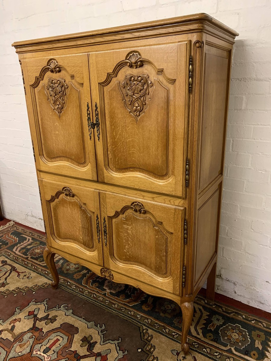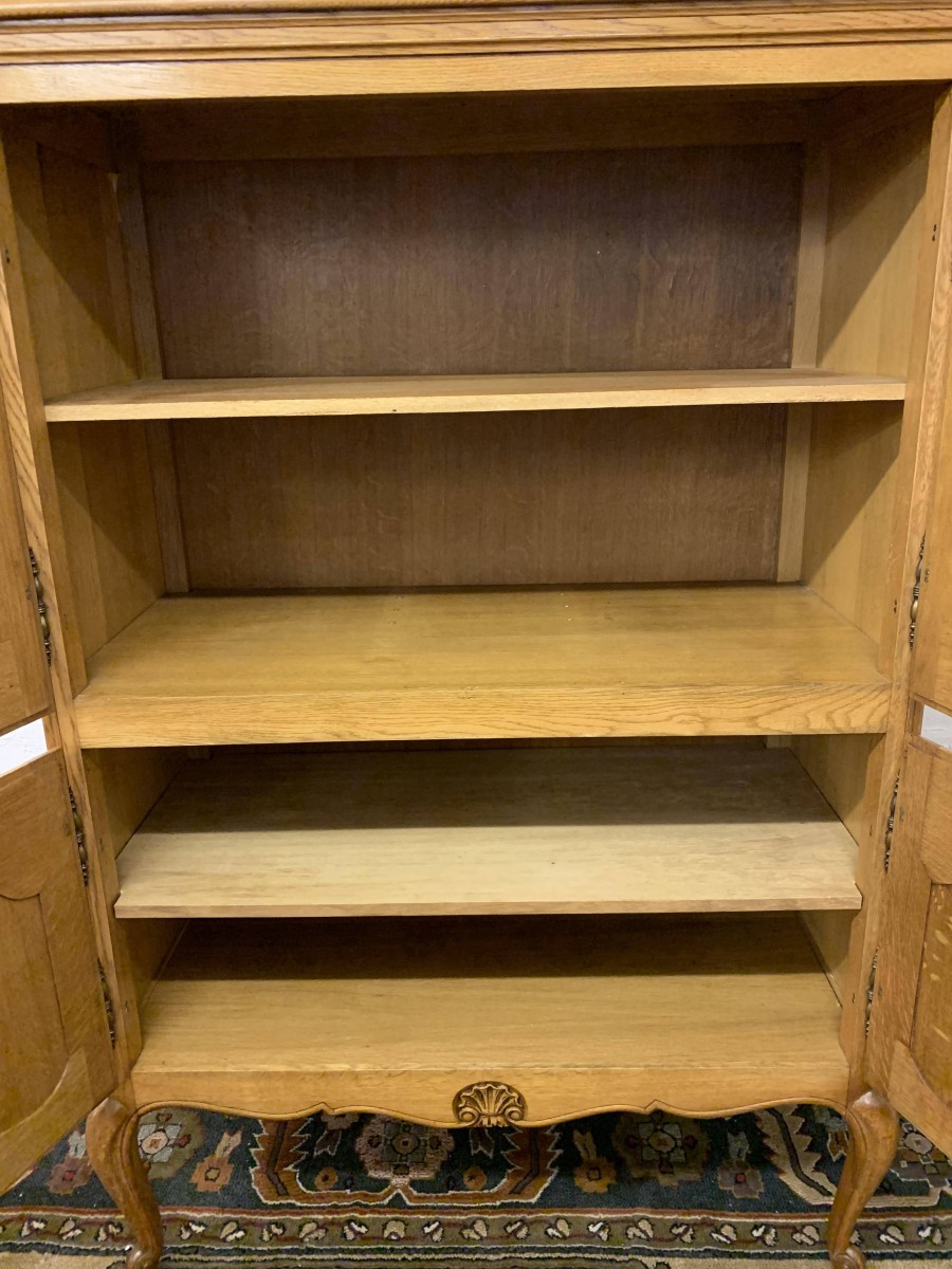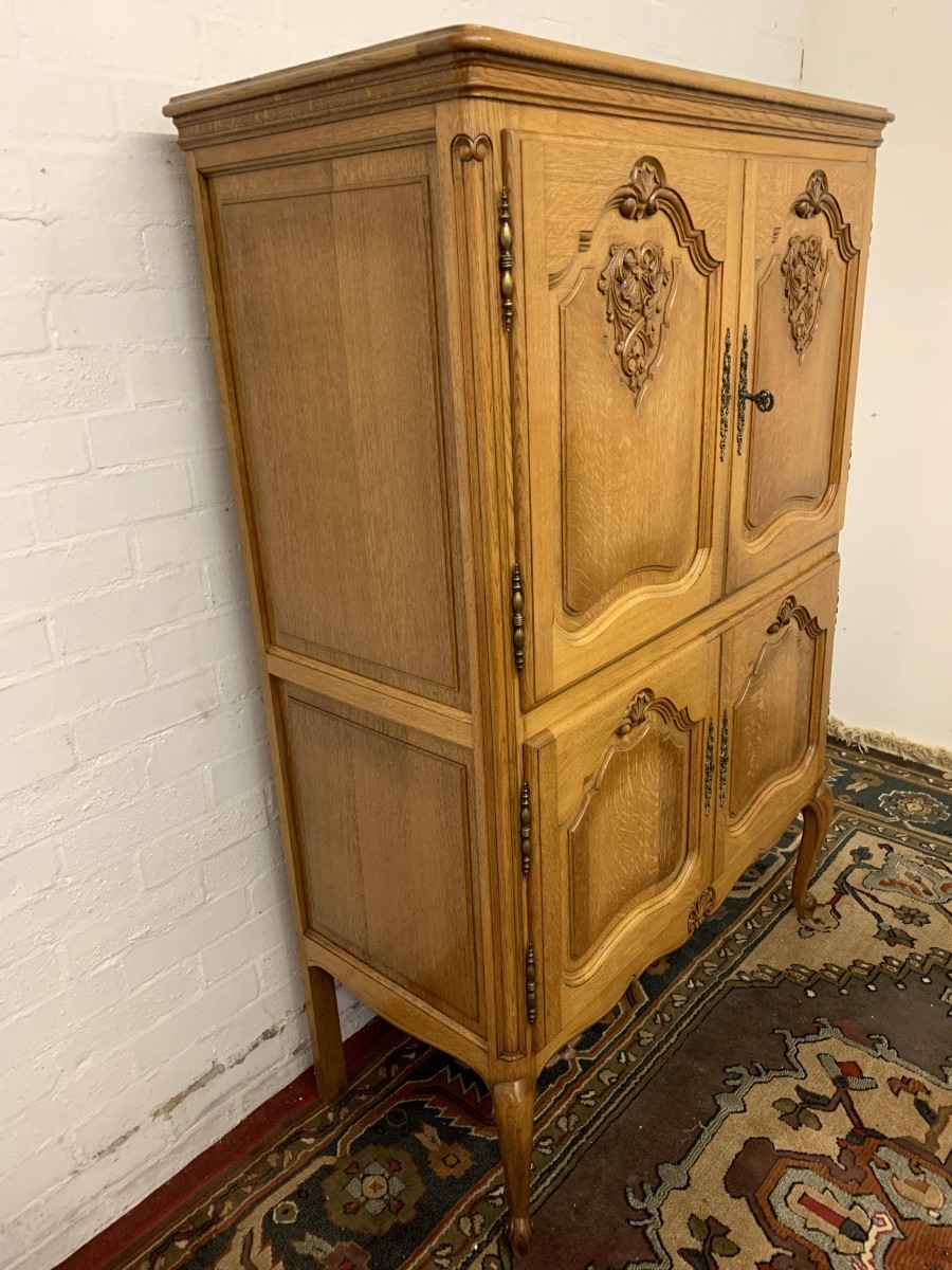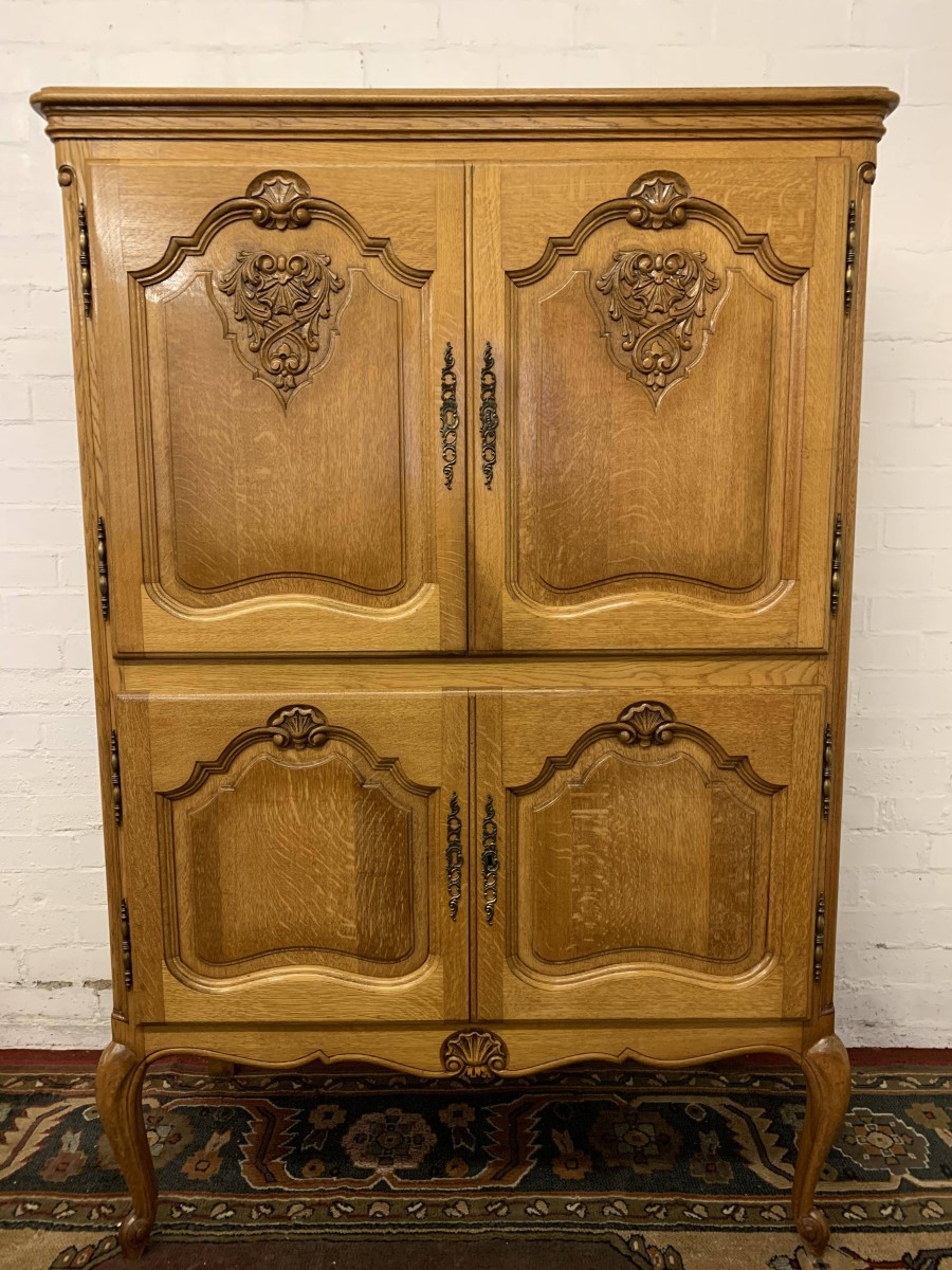We are delighted to offer this fantastic French storage cupboard which is in excellent condition. The over sailing top sits above a pair of lockable carved recessed panelled doors, each door having brass hinges and decorative escutcheon. The doors open to reveal a removable shelf. Below are a slightly smaller pair of shaped recessed panelled doors, each door also having brass hinges and escutcheon. These doors open to reveal a removable shelf. Recessed panelled sides, shaped skirt with decorative central fan carving. The super cabinet stands on two carved shaped cabriole legs to the front.
