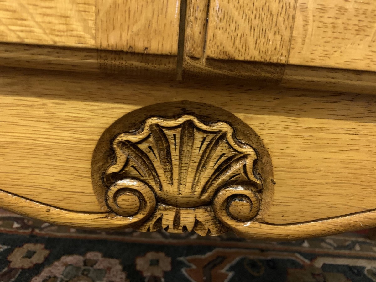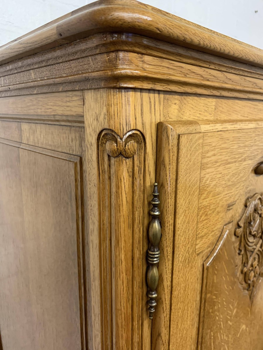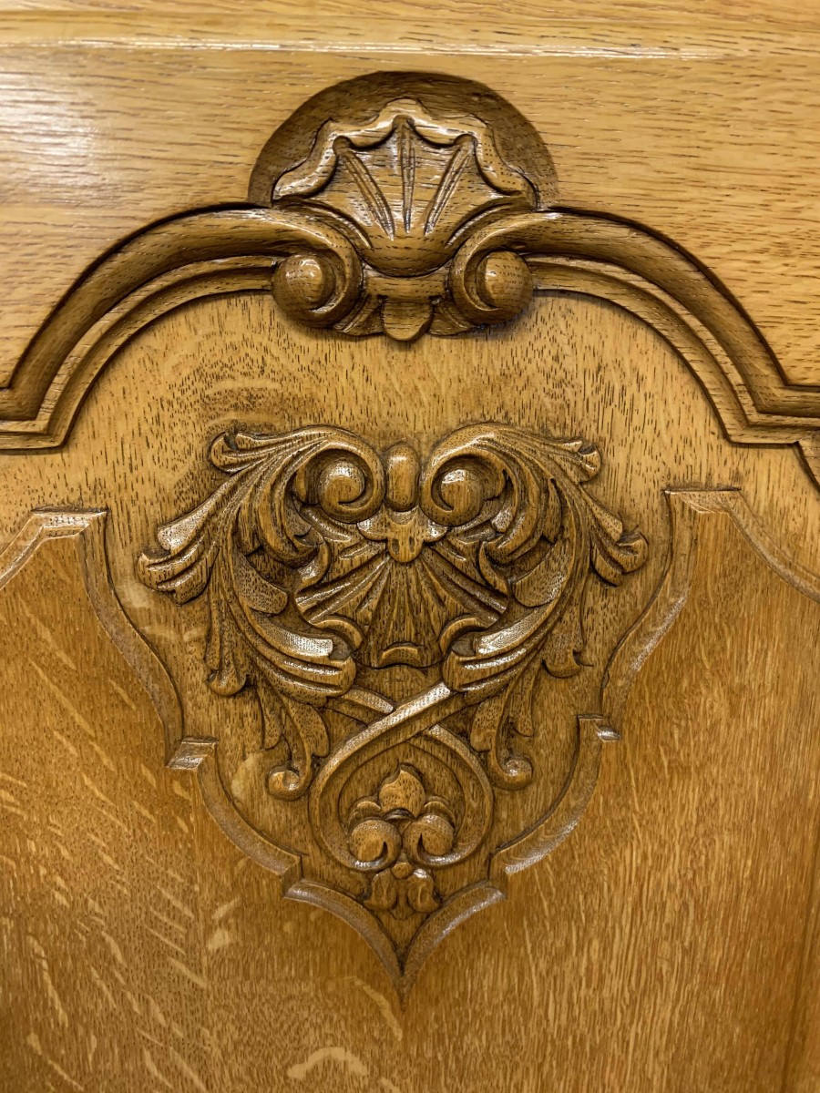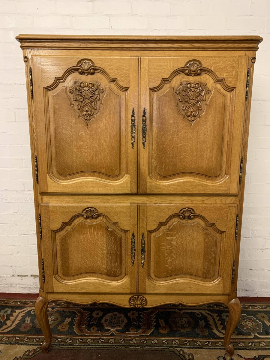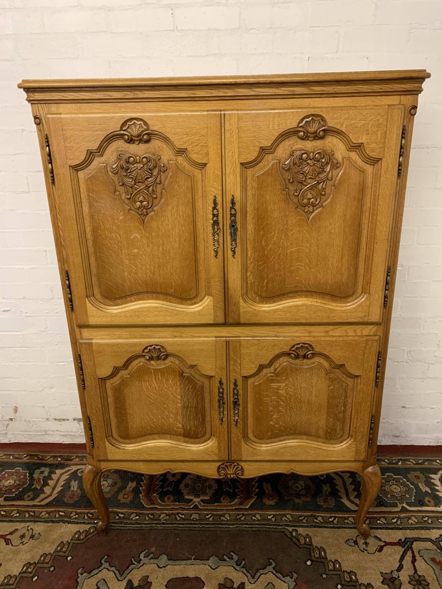 We are delighted to offer this fantastic French storage cupboard which is in excellent condition. The over sailing top sits above a pair of lockable carved recessed panelled doors, each door having brass hinges and decorative escutcheon. The doors open to reveal a removable shelf. Below are a slightly smaller pair of shaped recessed panelled doors, each door also having brass hinges and escutcheon. These doors open to reveal a removable shelf. Recessed panelled sides, shaped skirt with decorative central fan carving. The super cabinet stands on two carved shaped cabriole legs to the front.