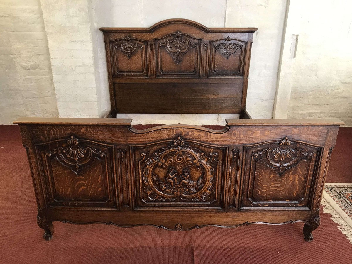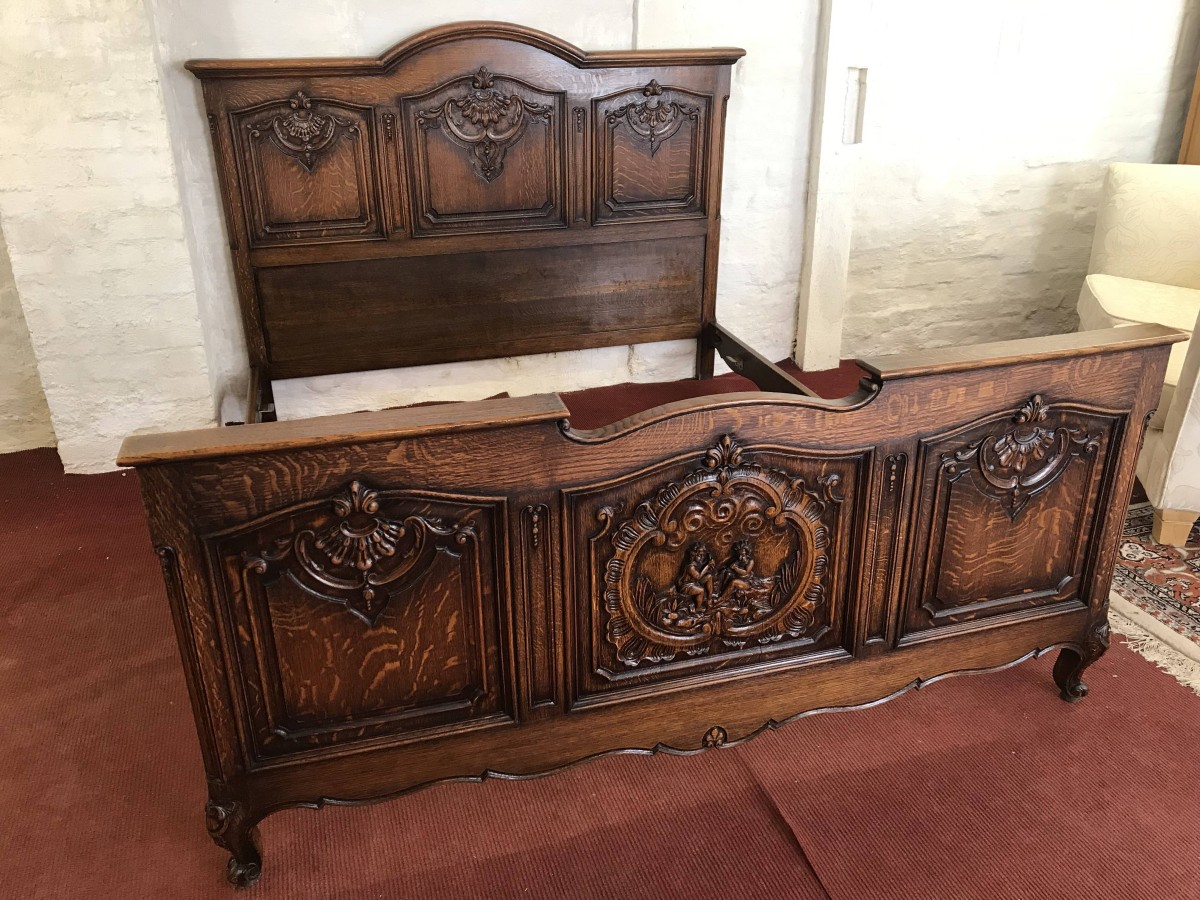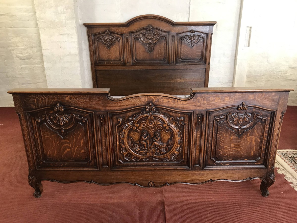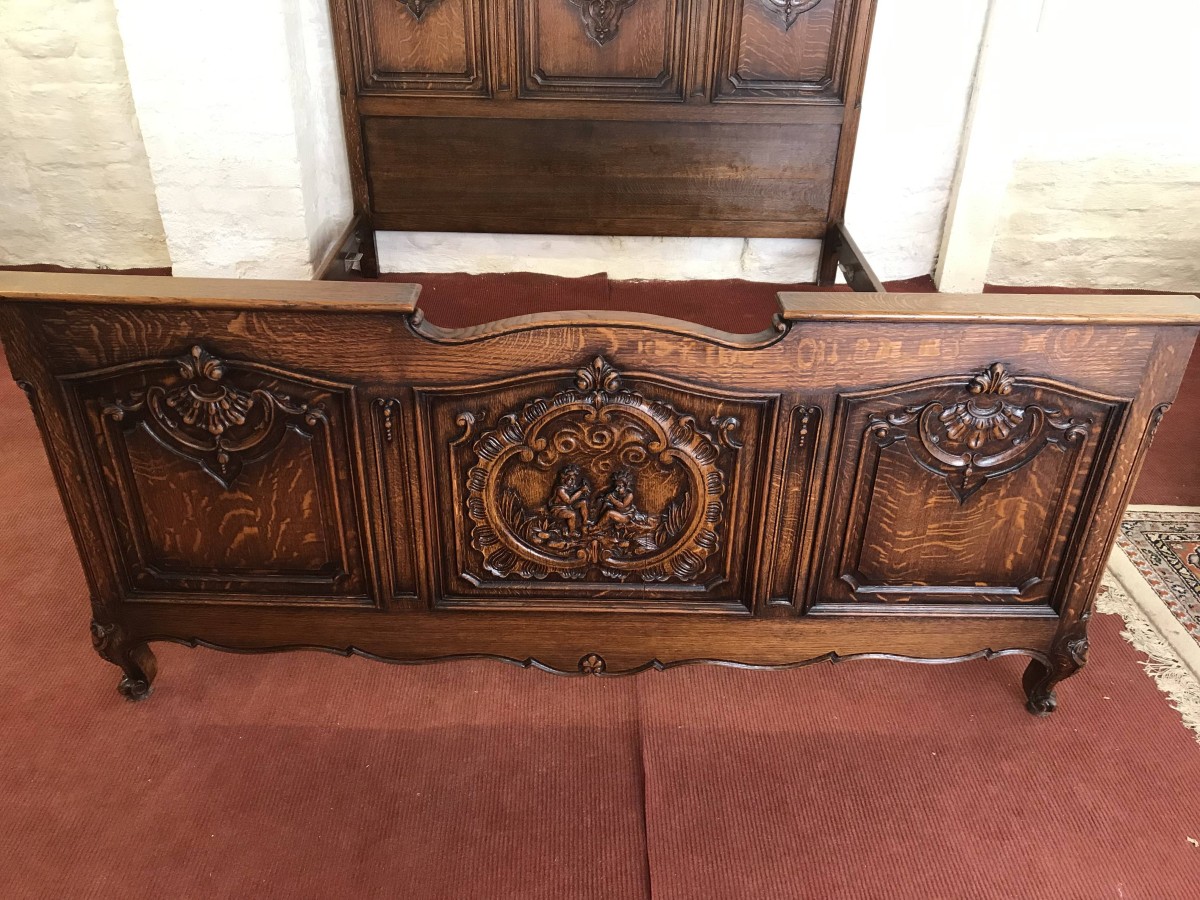 The headboard has a shaped top with three recessed panels below. Each panel has fine ornate decorative carving. The footboard also has three recessed panels, the central panel is ornately carved with lovers. Shaped skirt with central fan carving, the footboard sits on carved shaped cabriole legs. The bed is connected by two shaped carved side rails. A stunning bed.