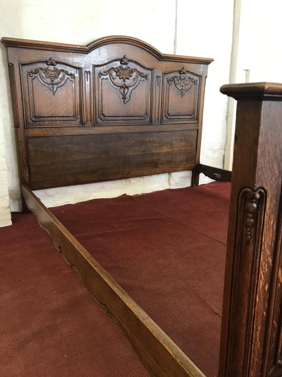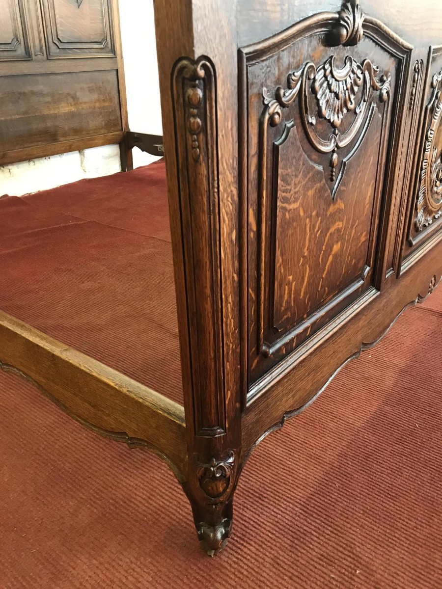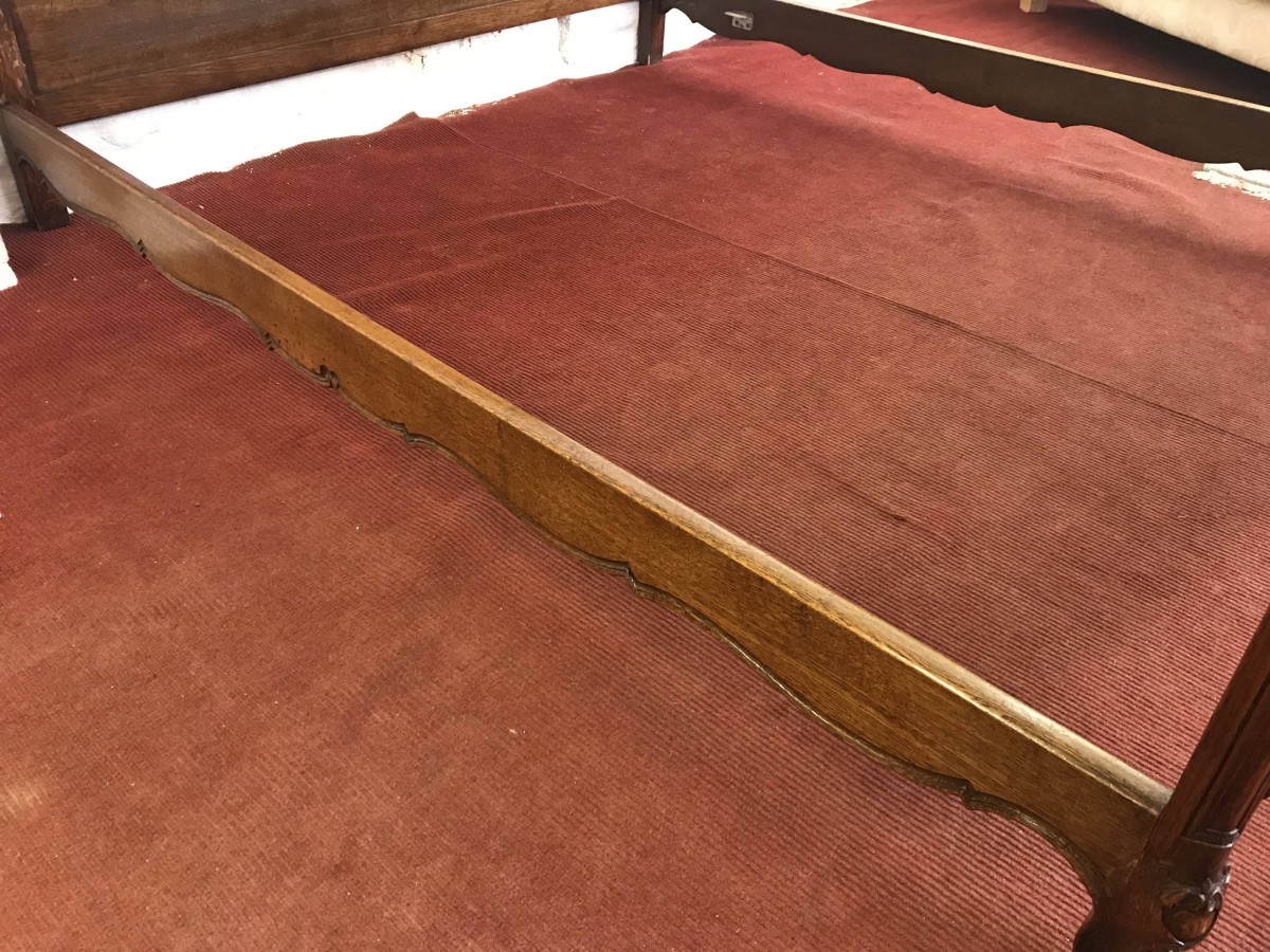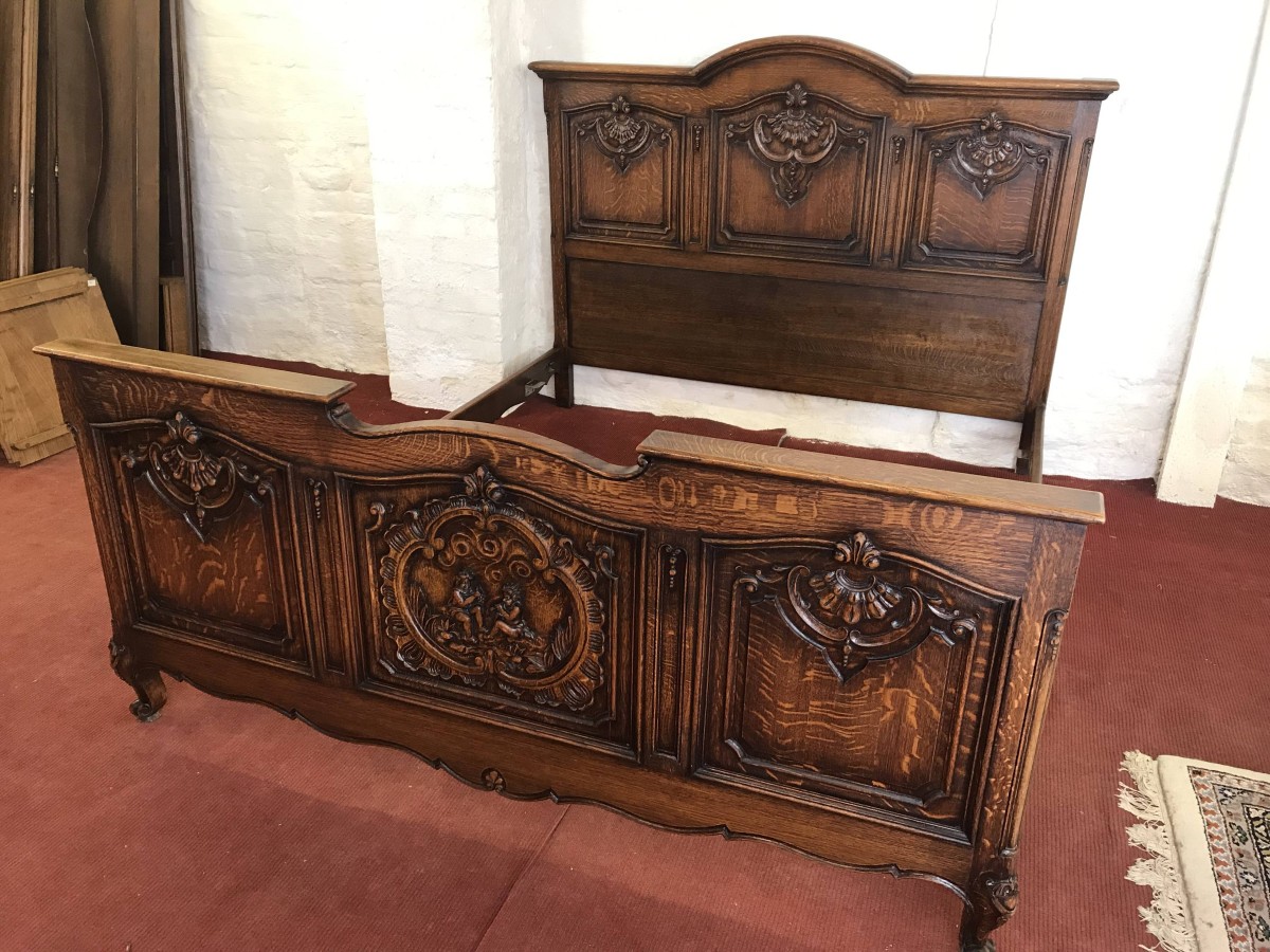The headboard has a shaped top with three recessed panels below. Each panel has fine ornate decorative carving. The footboard also has three recessed panels, the central panel is ornately carved with lovers. Shaped skirt with central fan carving, the footboard sits on carved shaped cabriole legs. The bed is connected by two shaped carved side rails. A stunning bed.