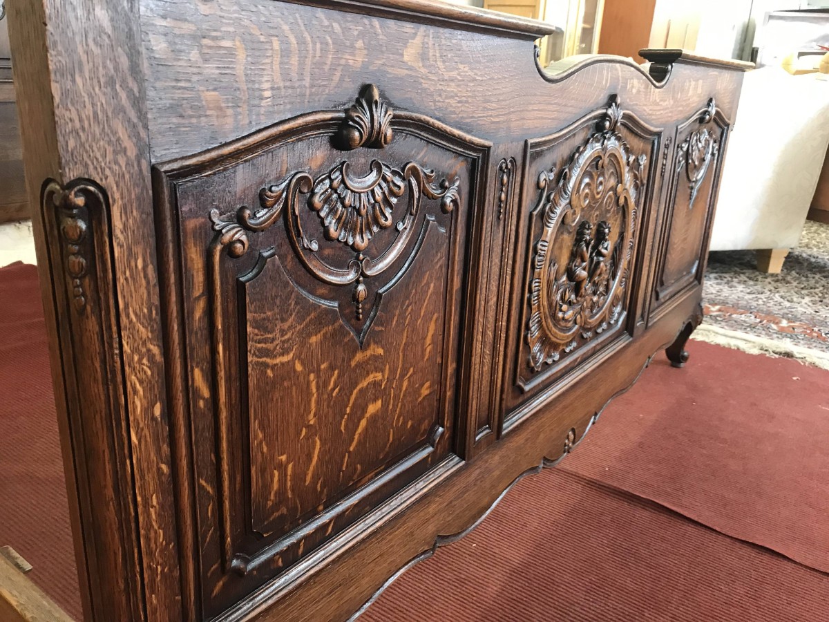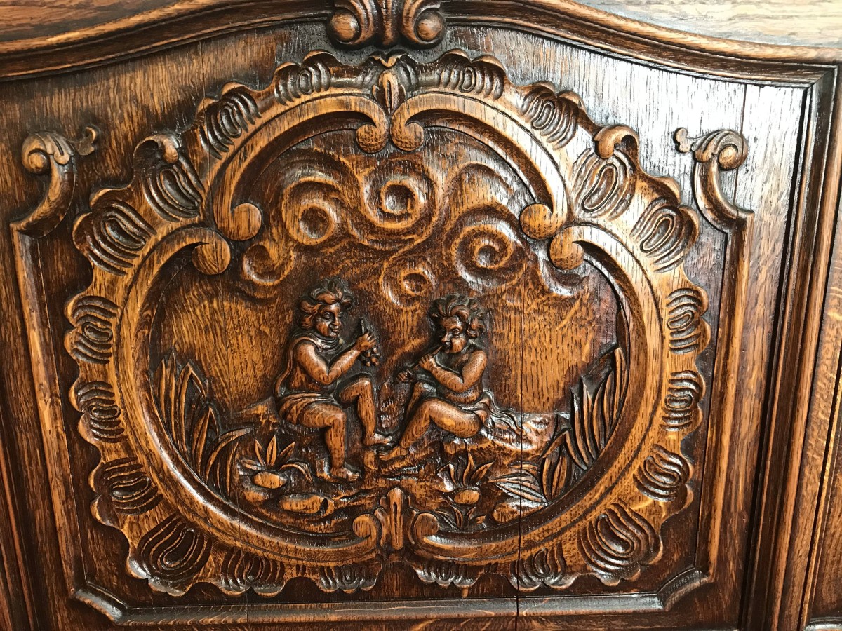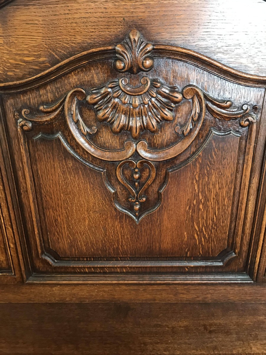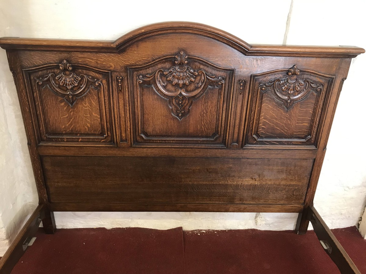 The headboard has a shaped top with three recessed panels below. Each panel has fine ornate decorative carving. The footboard also has three recessed panels, the central panel is ornately carved with lovers. Shaped skirt with central fan carving, the footboard sits on carved shaped cabriole legs. The bed is connected by two shaped carved side rails. A stunning bed.