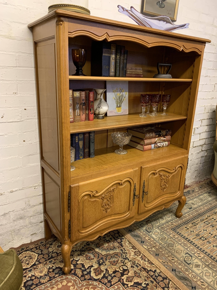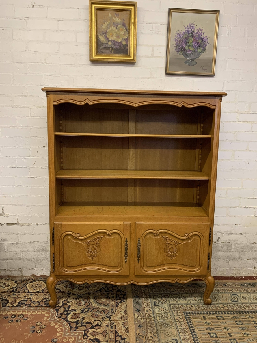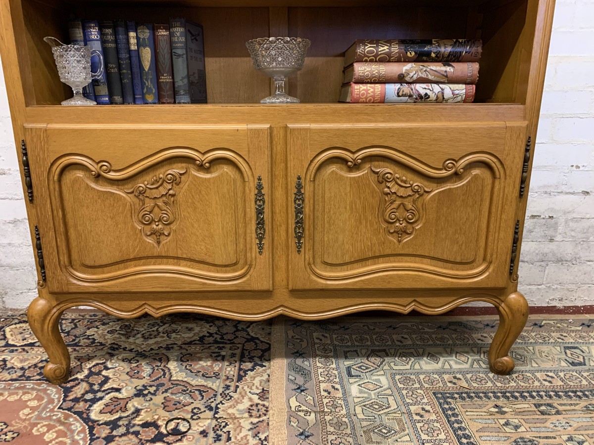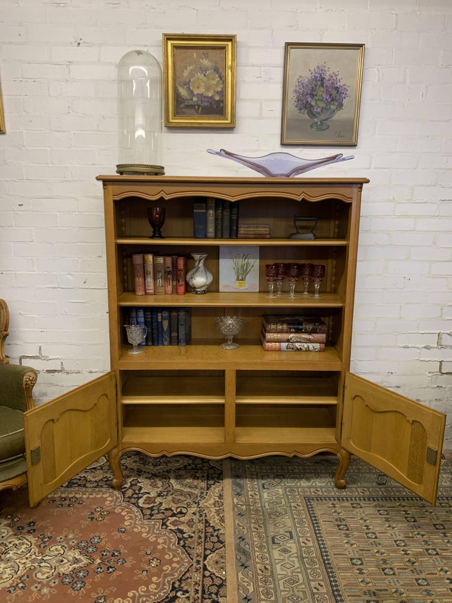 The oversailing top has cross banded edging. With a shaped freeze below which sits above two adjustable and removable shelves. Below are a pair of lockable carved recessed panelled doors, each door having brass hinges, brass escutcheon and brass key. The doors open to reveal a removable shelf. Recessed panelled sides, this super bookcase stands on two carved cabriole shaped legs to the front.