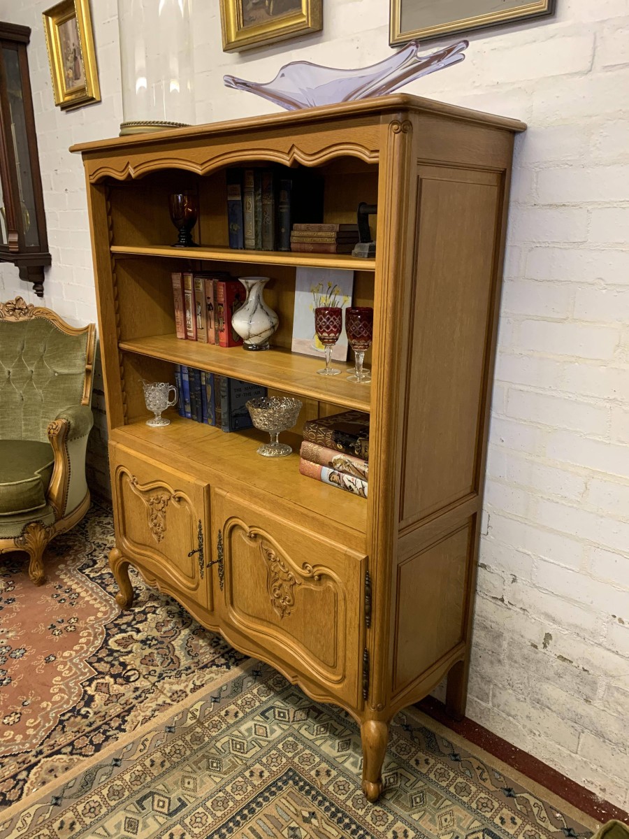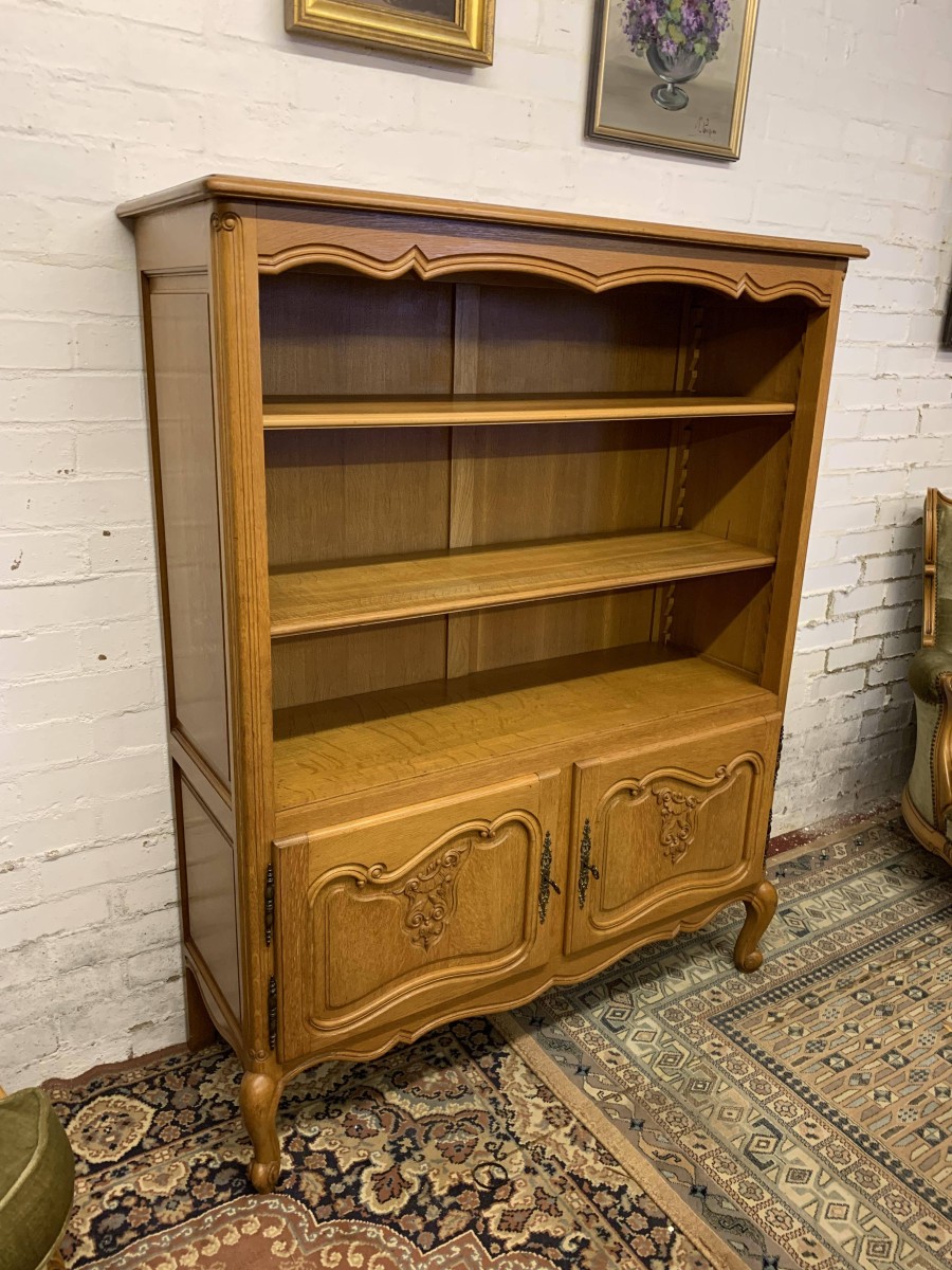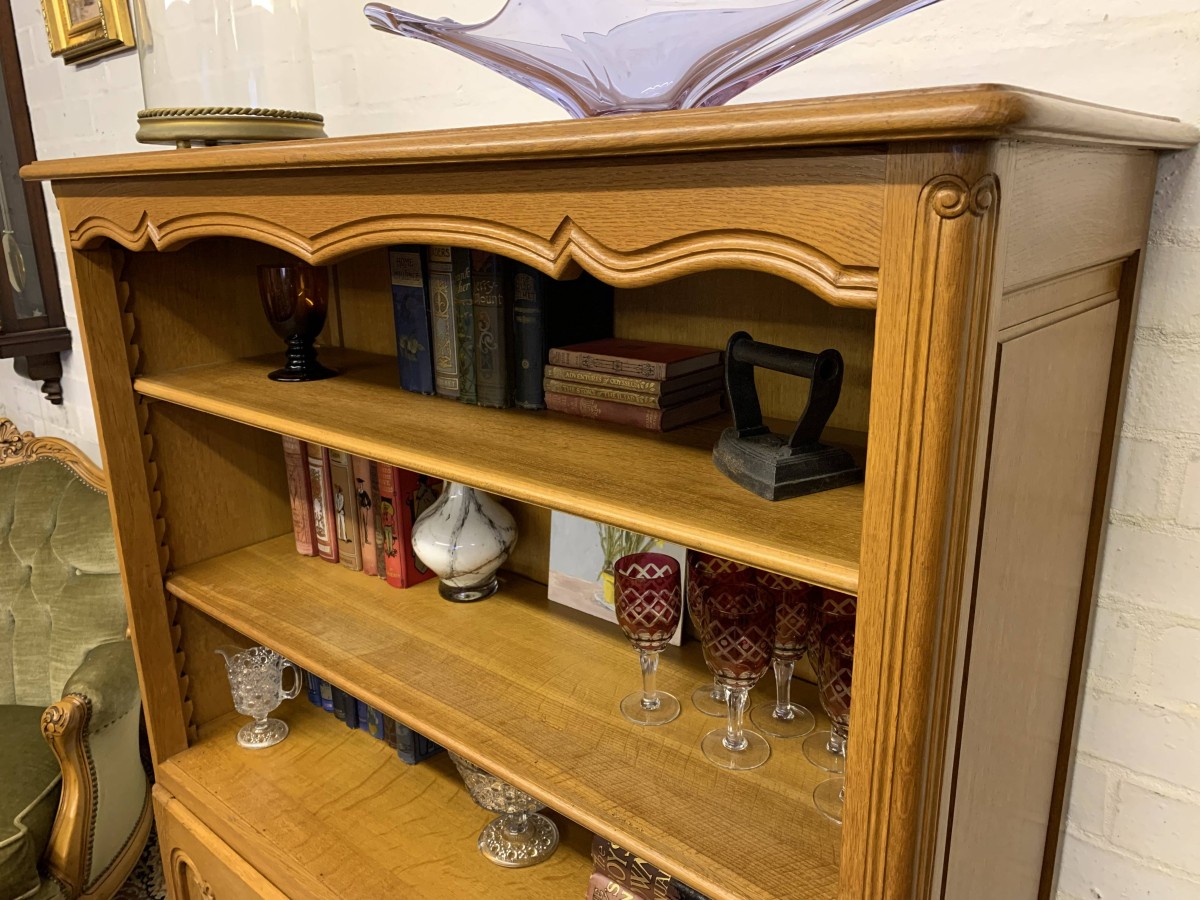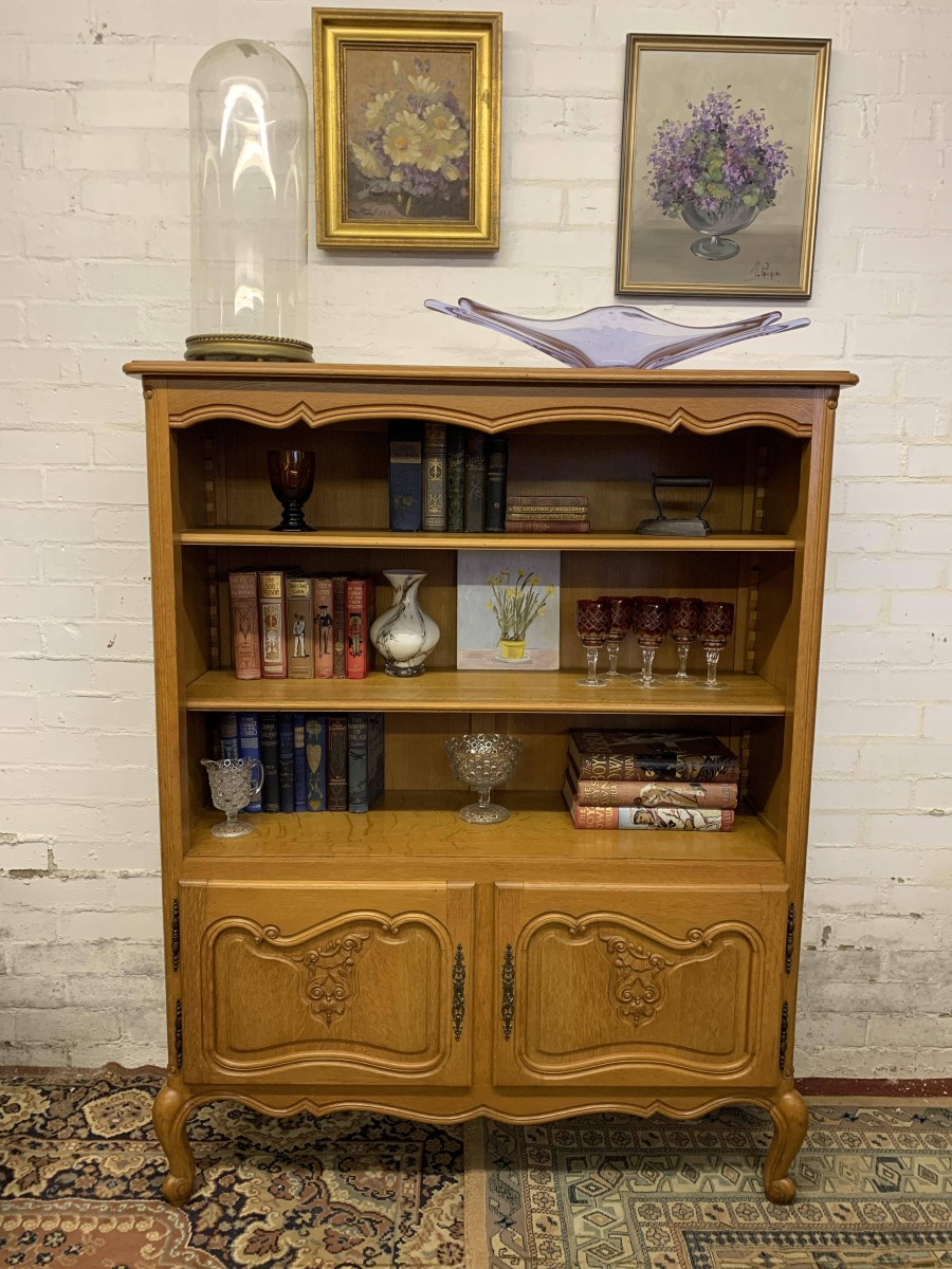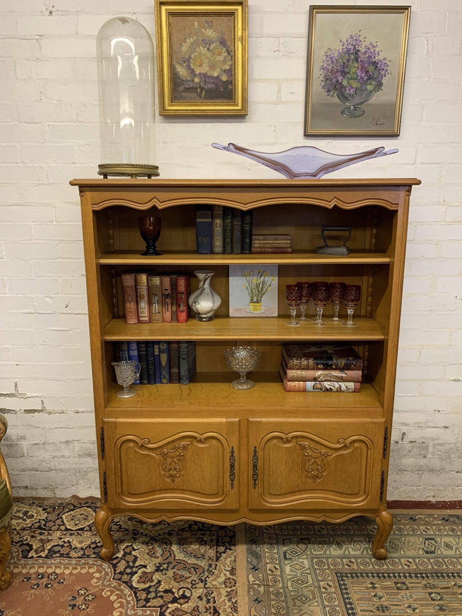 The oversailing top has cross banded edging. With a shaped freeze below which sits above two adjustable and removable shelves. Below are a pair of lockable carved recessed panelled doors, each door having brass hinges, brass escutcheon and brass key. The doors open to reveal a removable shelf. Recessed panelled sides, this super bookcase stands on two carved cabriole shaped legs to the front.
