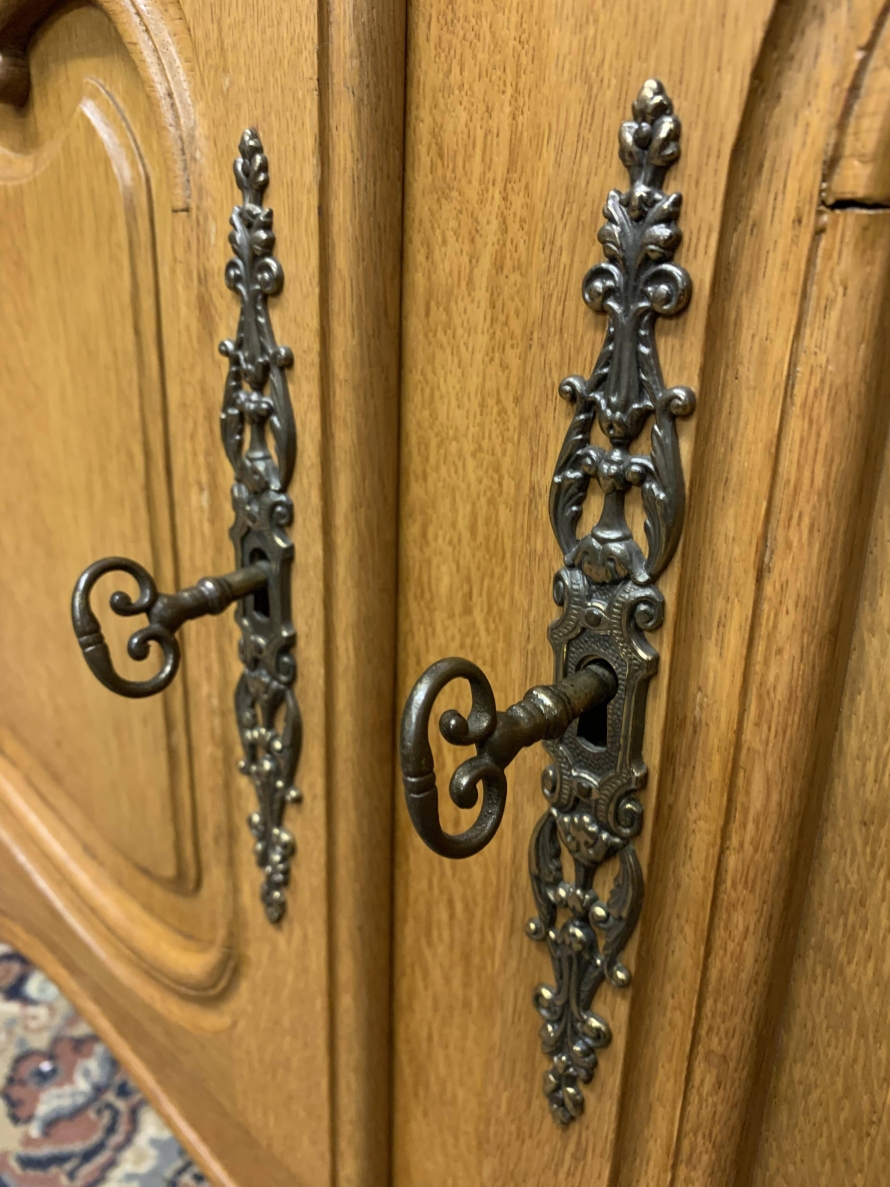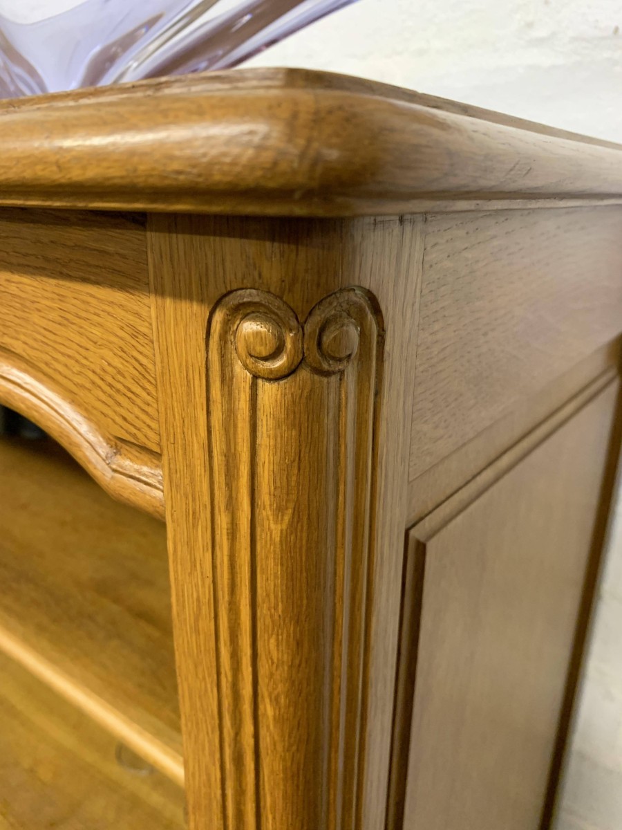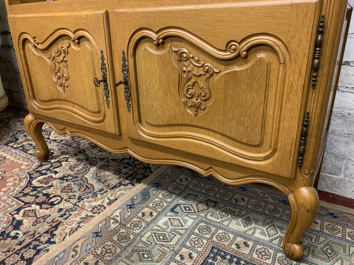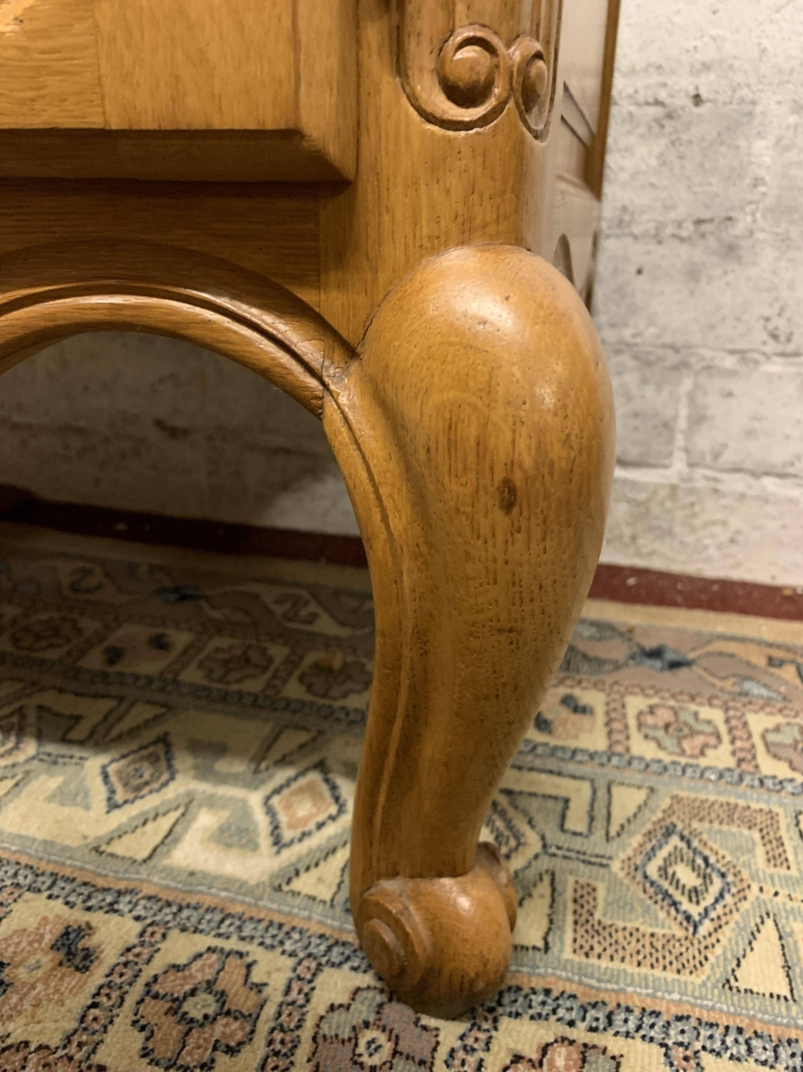 The oversailing top has cross banded edging. With a shaped freeze below which sits above two adjustable and removable shelves. Below are a pair of lockable carved recessed panelled doors, each door having brass hinges, brass escutcheon and brass key. The doors open to reveal a removable shelf. Recessed panelled sides, this super bookcase stands on two carved cabriole shaped legs to the front.
