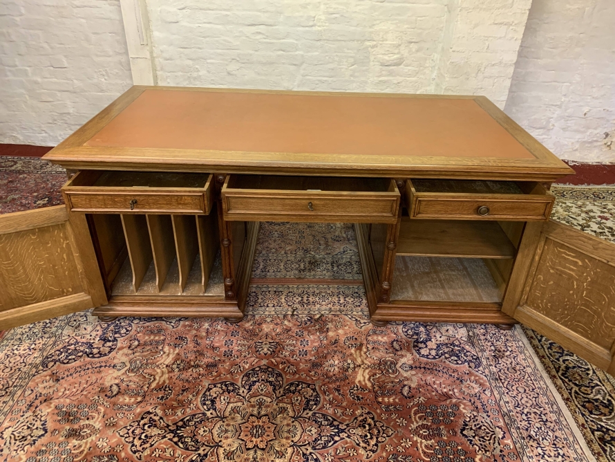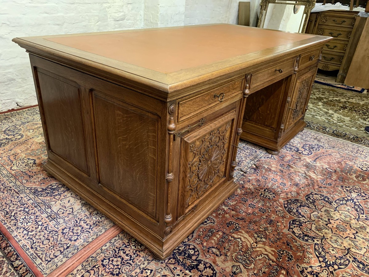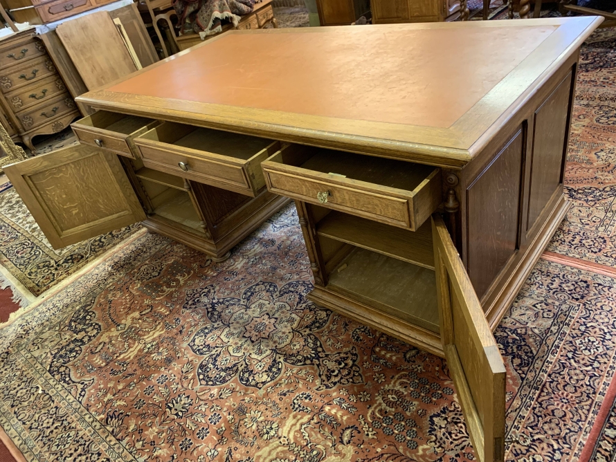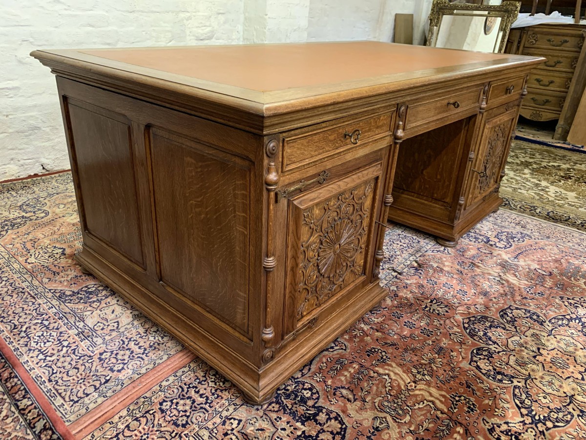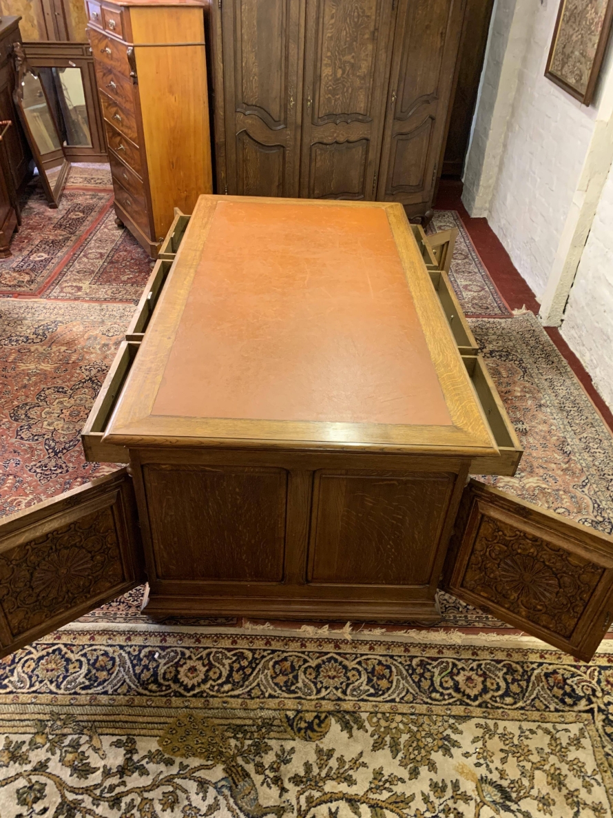 This fabulous French partners desk dates circa 1910. The desk has a leather top and is suitable for either one or two people at a time to use. One side has a central knee hole drawer which is flanked by a pair of drawers. Below is an ornately carved lockable door to the left, this door opens to reveal filing cupboard. The right-hand carved oak panelled door opens to reveal an adjustable and removable shelf. The other side of the desk also has a central knee hole drawer flanked by a pair by a pair of drawers. Below is an ornately carved lockable cupboard door to the left, this door opens to reveal an adjustable and removable shelf. The right-hand door opens to reveal an adjustable and removable shelf. Recessed panelled sides this stunning desk sits on eight turned feet.