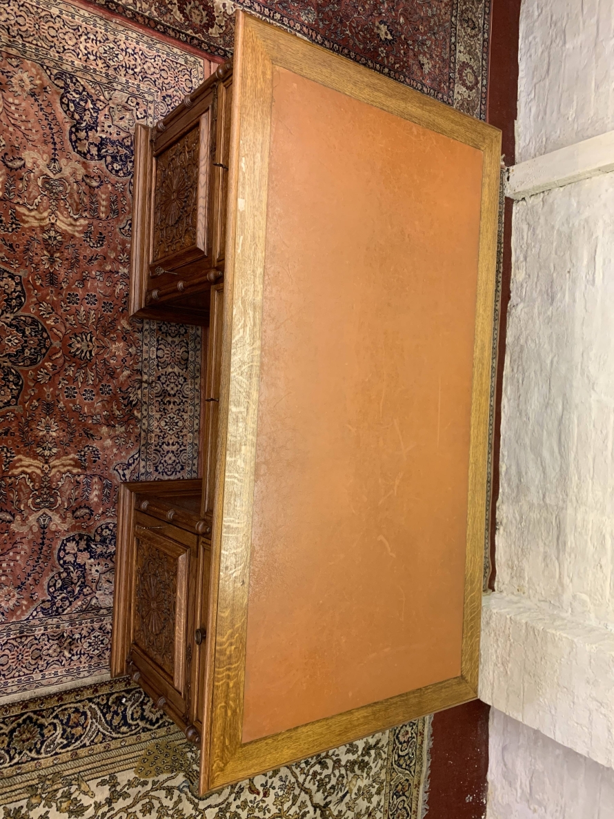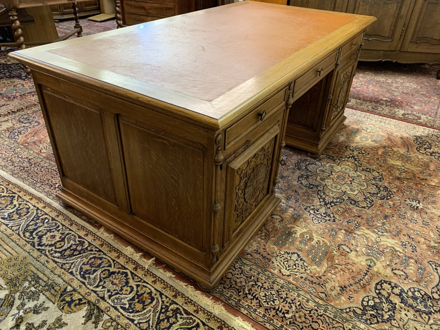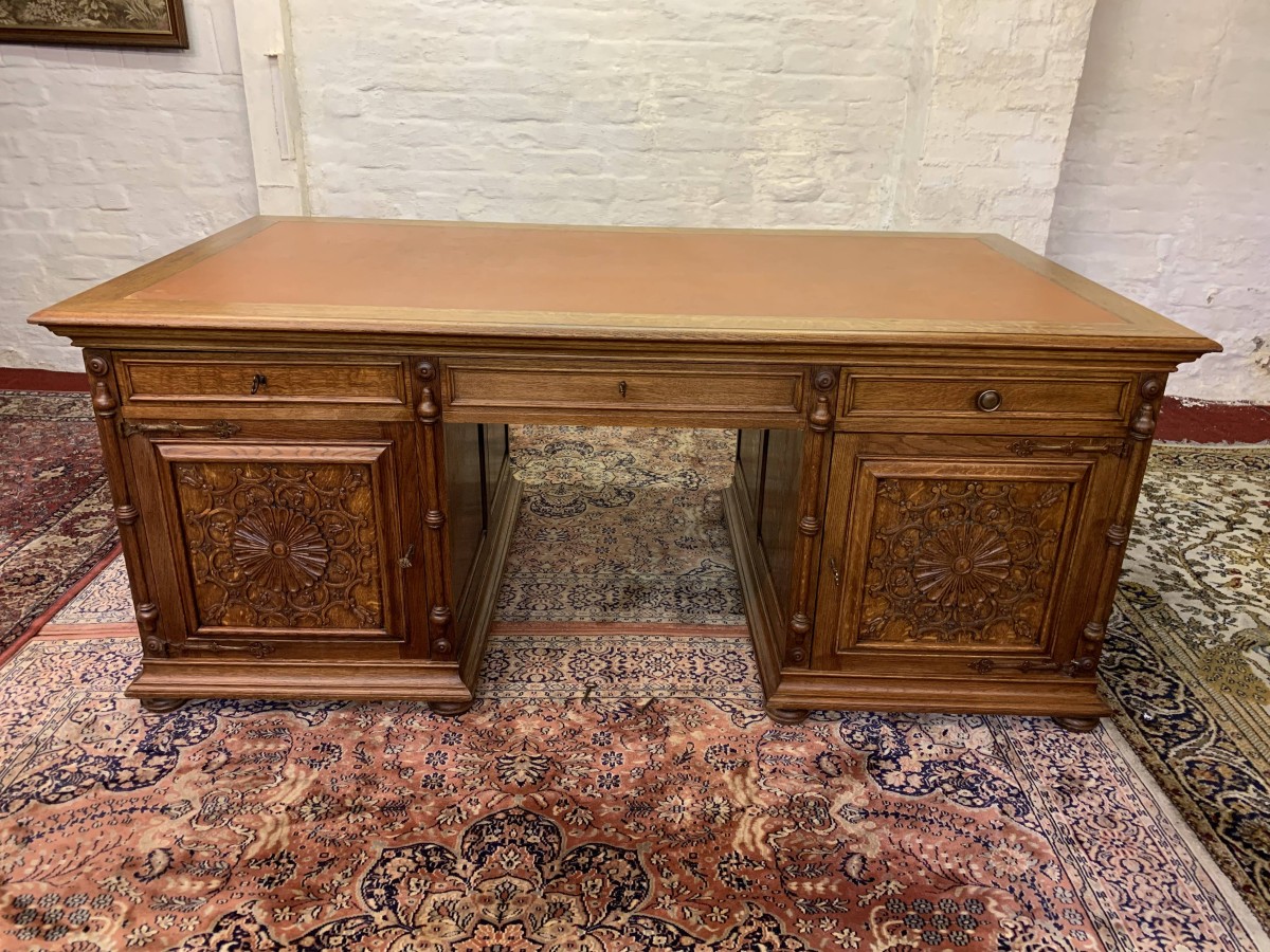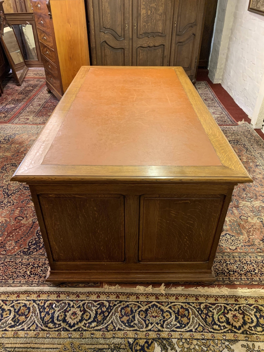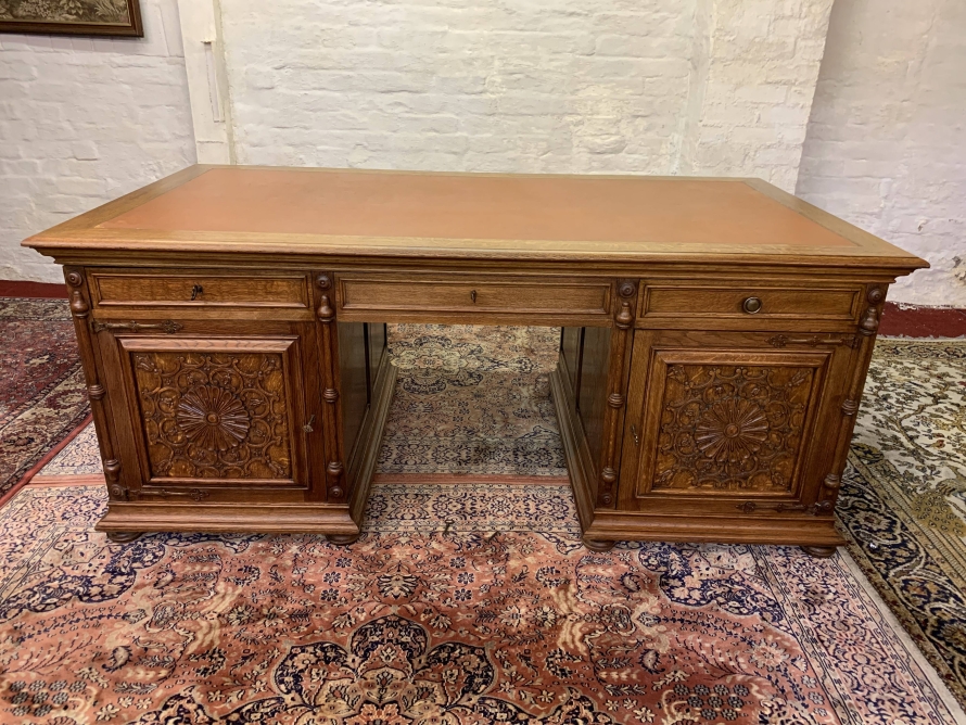 This fabulous French partners desk dates circa 1910. The desk has a leather top and is suitable for either one or two people at a time to use. One side has a central knee hole drawer which is flanked by a pair of drawers. Below is an ornately carved lockable door to the left, this door opens to reveal filing cupboard. The right-hand carved oak panelled door opens to reveal an adjustable and removable shelf. The other side of the desk also has a central knee hole drawer flanked by a pair by a pair of drawers. Below is an ornately carved lockable cupboard door to the left, this door opens to reveal an adjustable and removable shelf. The right-hand door opens to reveal an adjustable and removable shelf. Recessed panelled sides this stunning desk sits on eight turned feet.