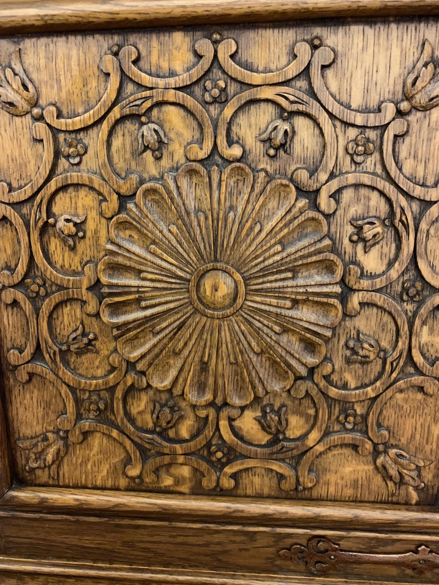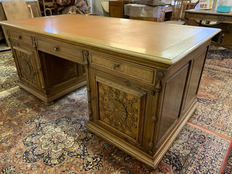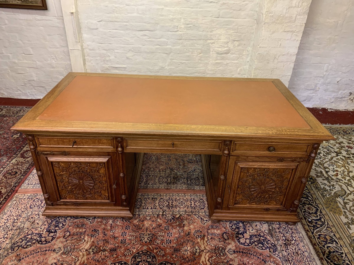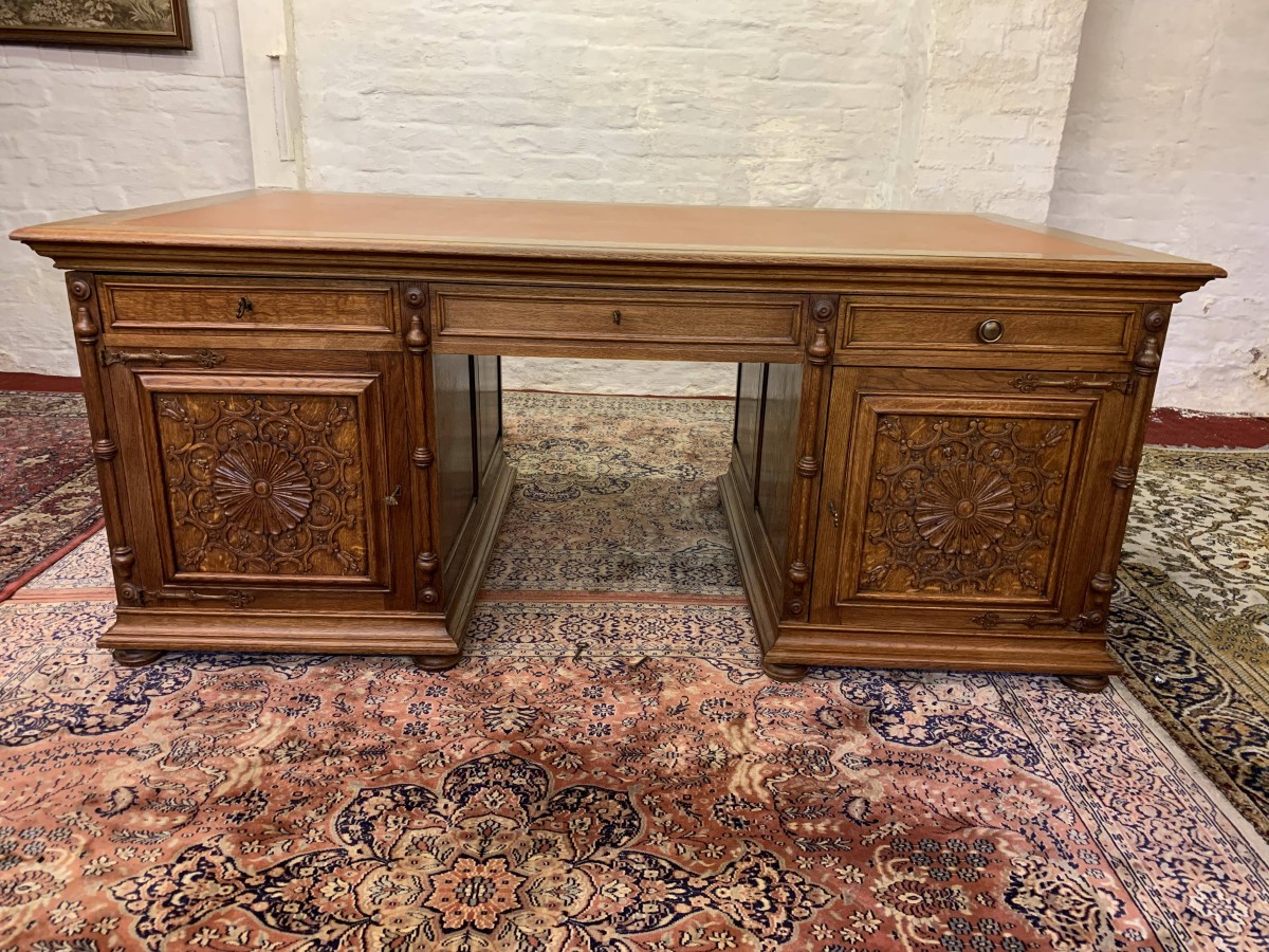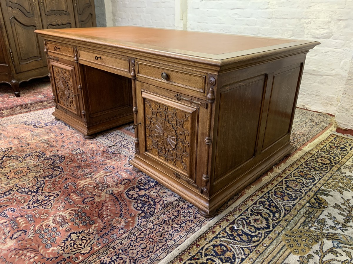 This fabulous French partners desk dates circa 1910. The desk has a leather top and is suitable for either one or two people at a time to use. One side has a central knee hole drawer which is flanked by a pair of drawers. Below is an ornately carved lockable door to the left, this door opens to reveal filing cupboard. The right-hand carved oak panelled door opens to reveal an adjustable and removable shelf. The other side of the desk also has a central knee hole drawer flanked by a pair by a pair of drawers. Below is an ornately carved lockable cupboard door to the left, this door opens to reveal an adjustable and removable shelf. The right-hand door opens to reveal an adjustable and removable shelf. Recessed panelled sides this stunning desk sits on eight turned feet.