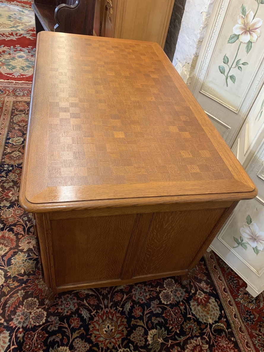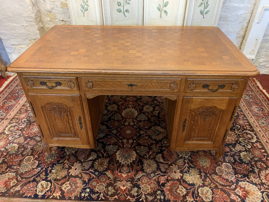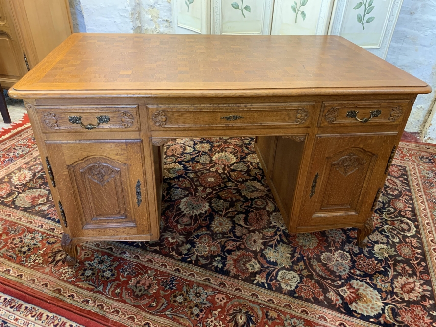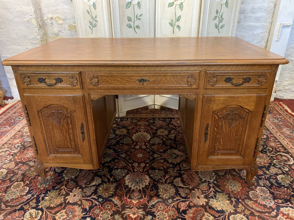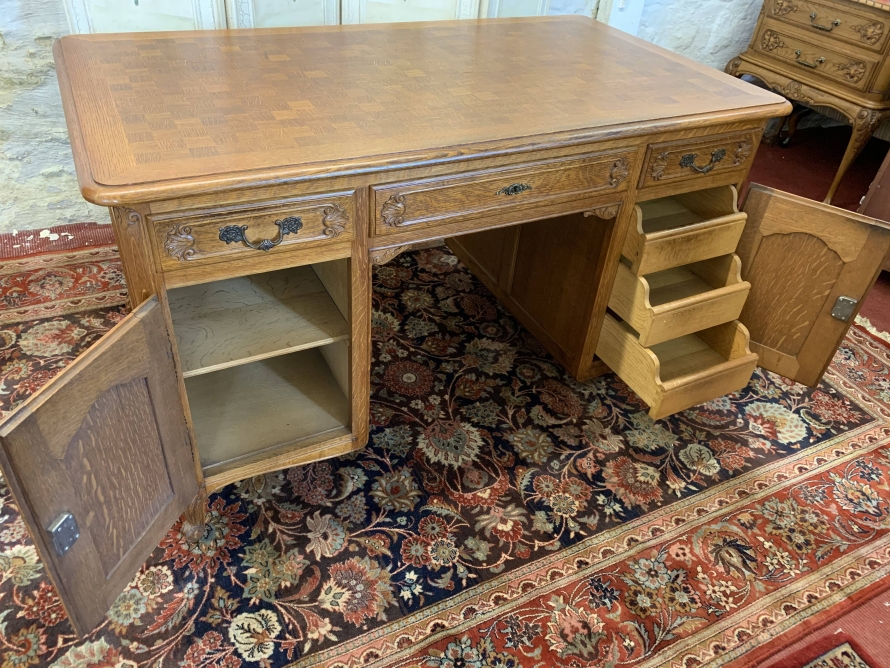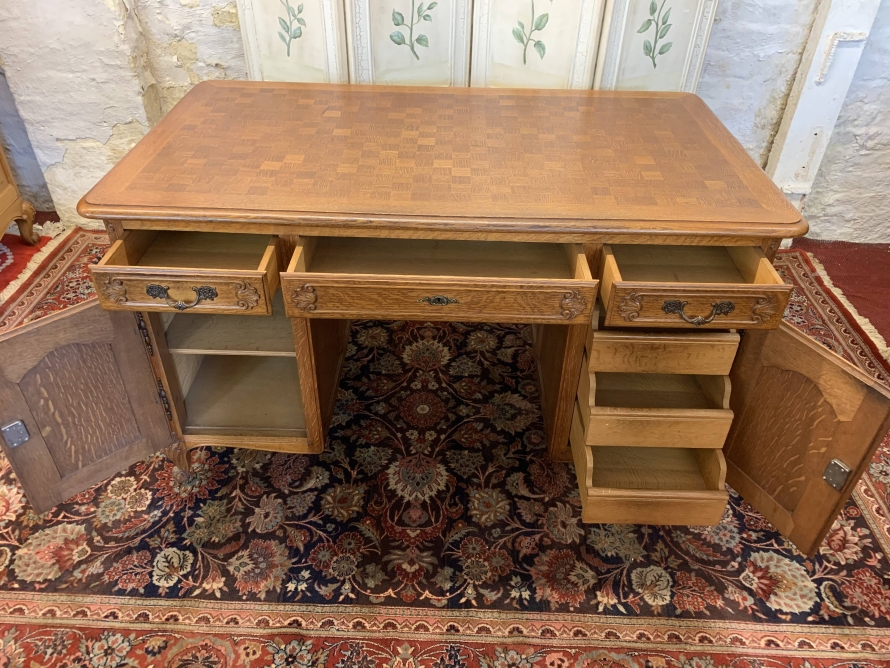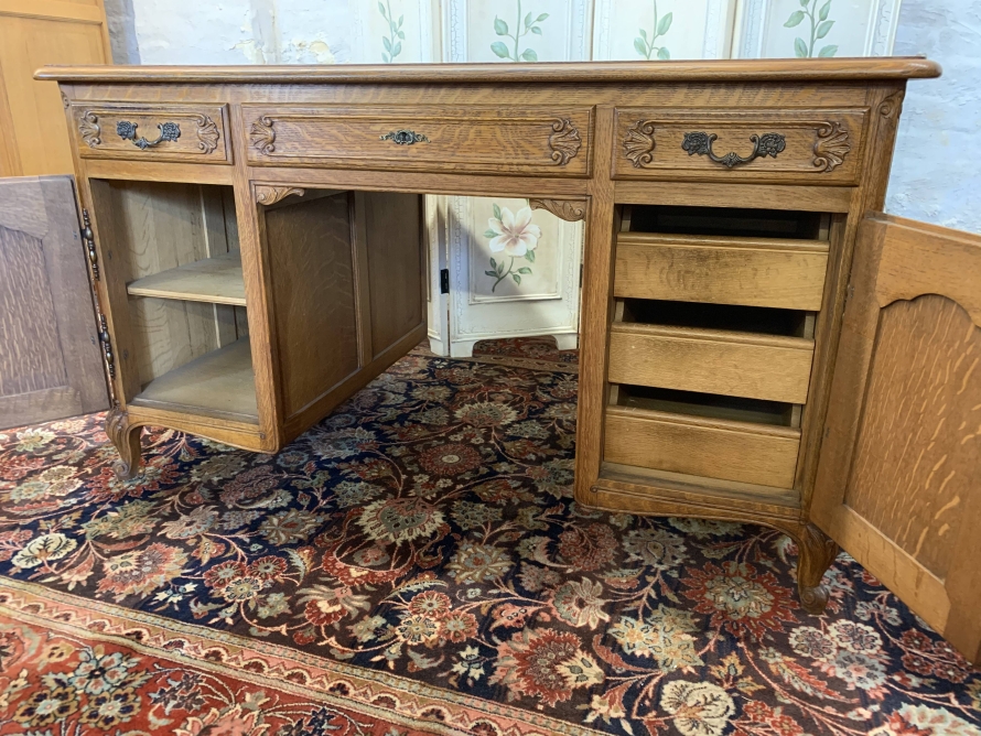 The top has rounded corners and impressive parquetry decoration. One side has a carved recessed panelled lockable central drawer flanked by a pair of carved recessed panelled small drawers. The carved recessed panelled lockable cupboard door to the left opens to reveal a removable shelf. The carved recessed panelled right-hand door opens to reveal three sliding filing drawers. The other side has dummy drawers and carved cupboard doors. With recessed panelled sides this attractive French carved oak partners desk stands on four cabriole shaped carved legs.