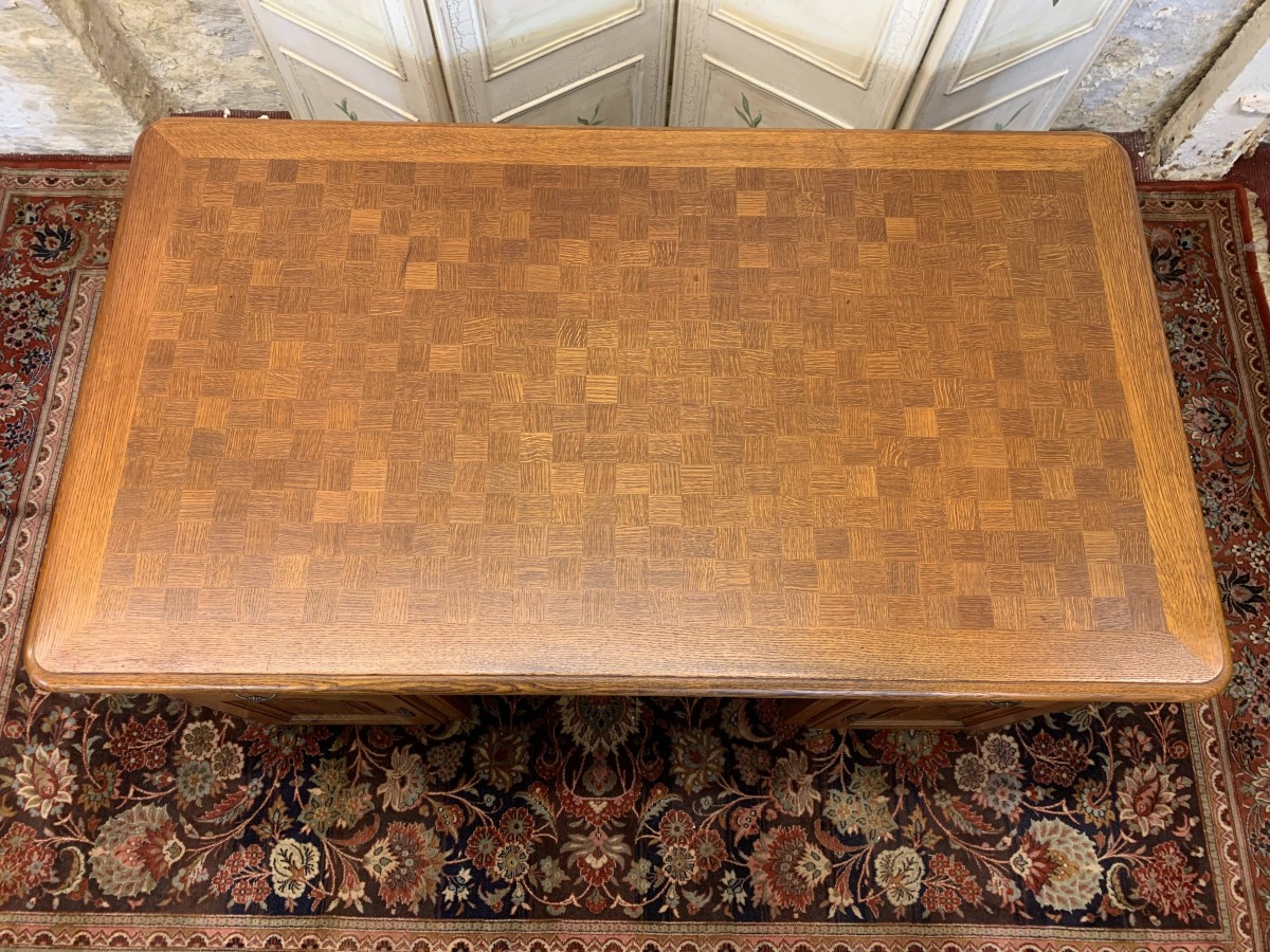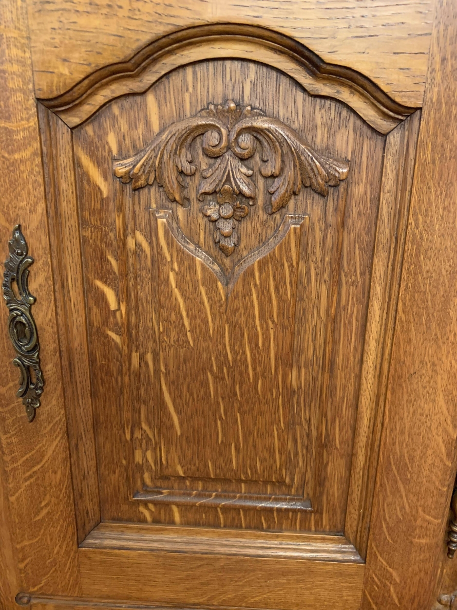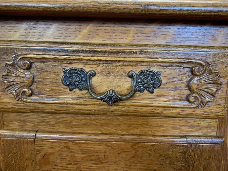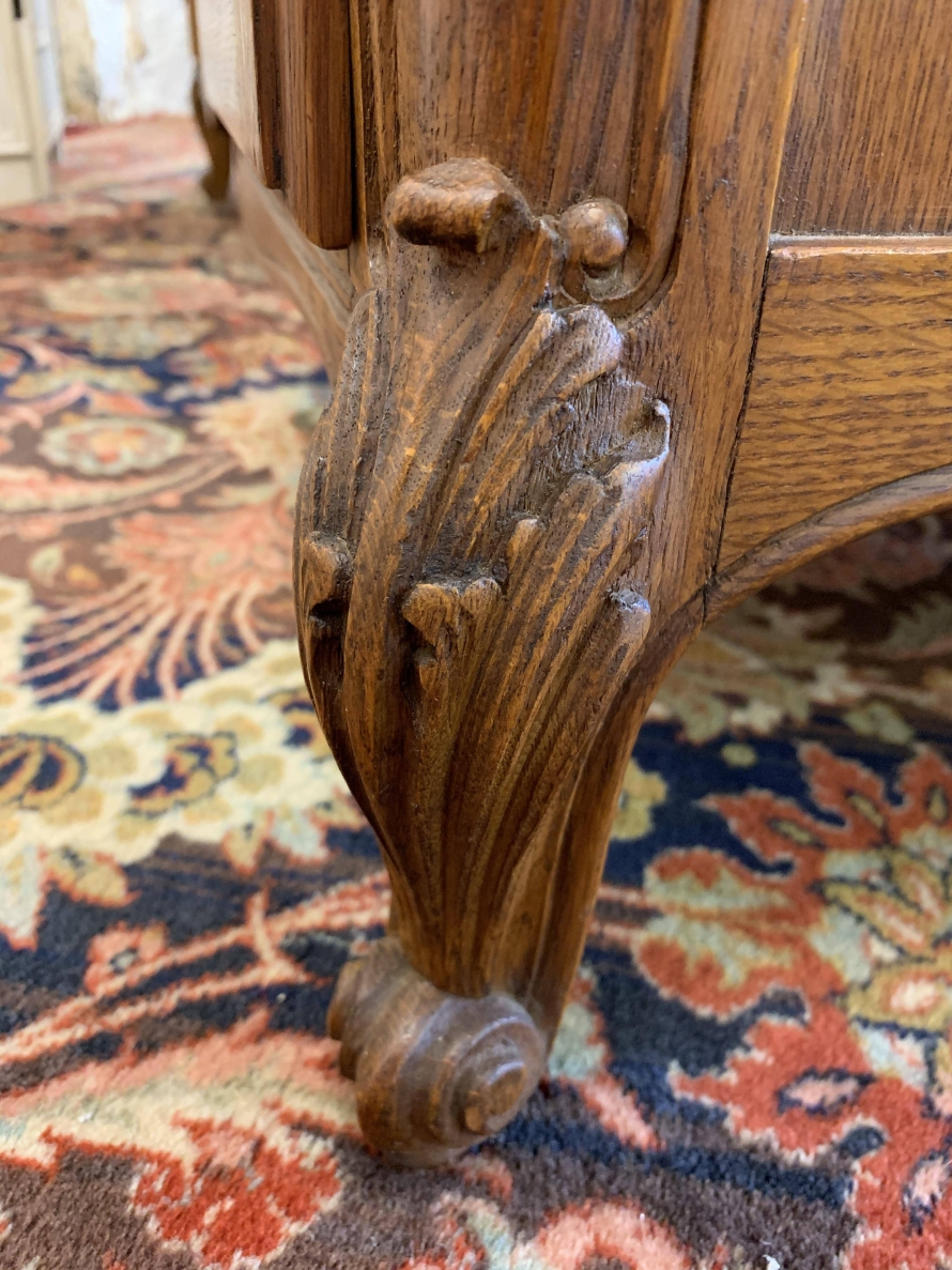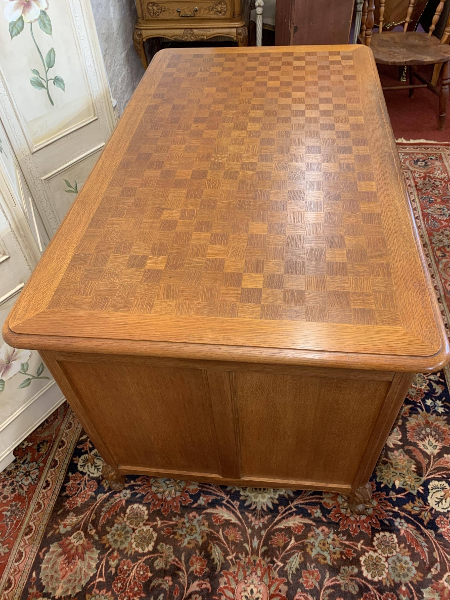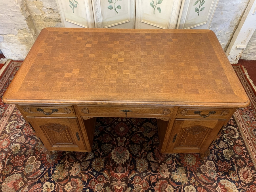 The top has rounded corners and impressive parquetry decoration. One side has a carved recessed panelled lockable central drawer flanked by a pair of carved recessed panelled small drawers. The carved recessed panelled lockable cupboard door to the left opens to reveal a removable shelf. The carved recessed panelled right-hand door opens to reveal three sliding filing drawers. The other side has dummy drawers and carved cupboard doors. With recessed panelled sides this attractive French carved oak partners desk stands on four cabriole shaped carved legs.