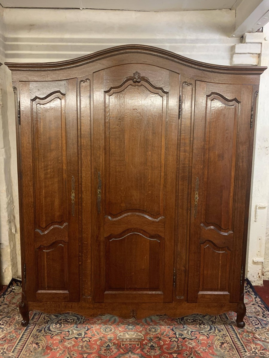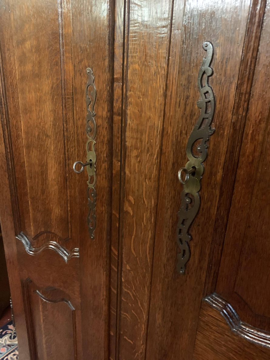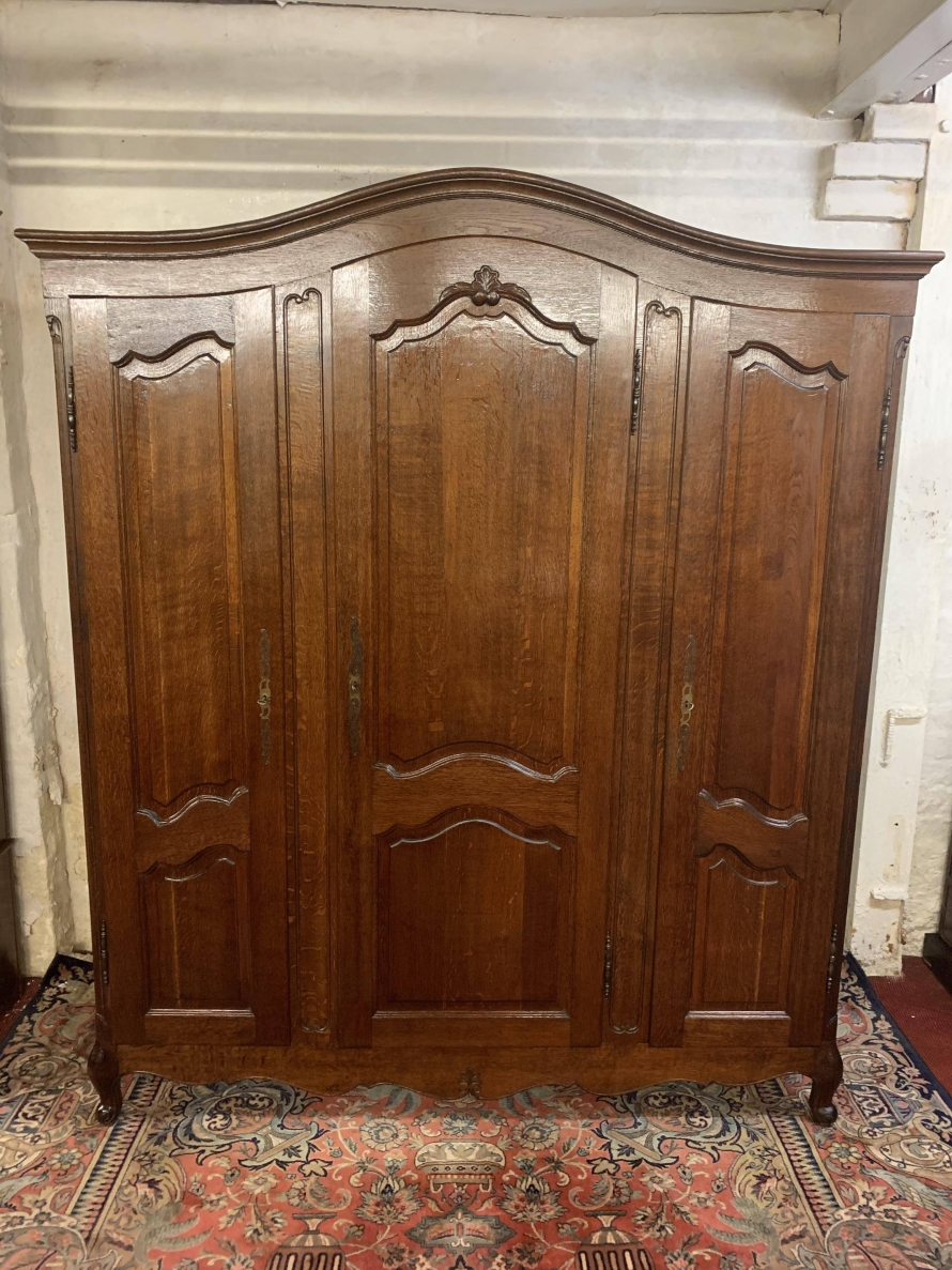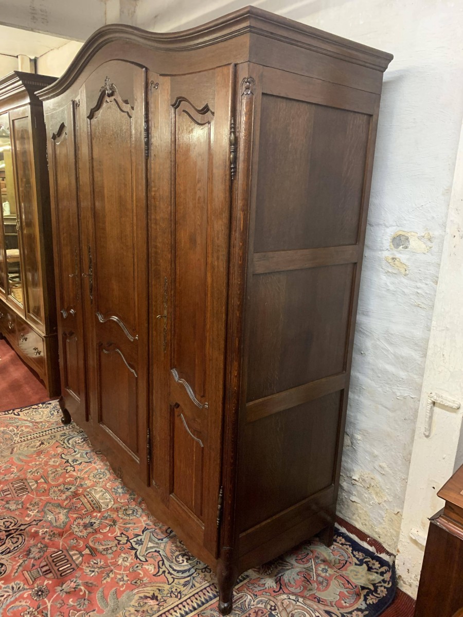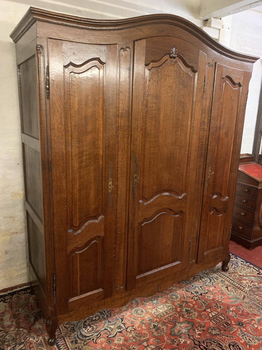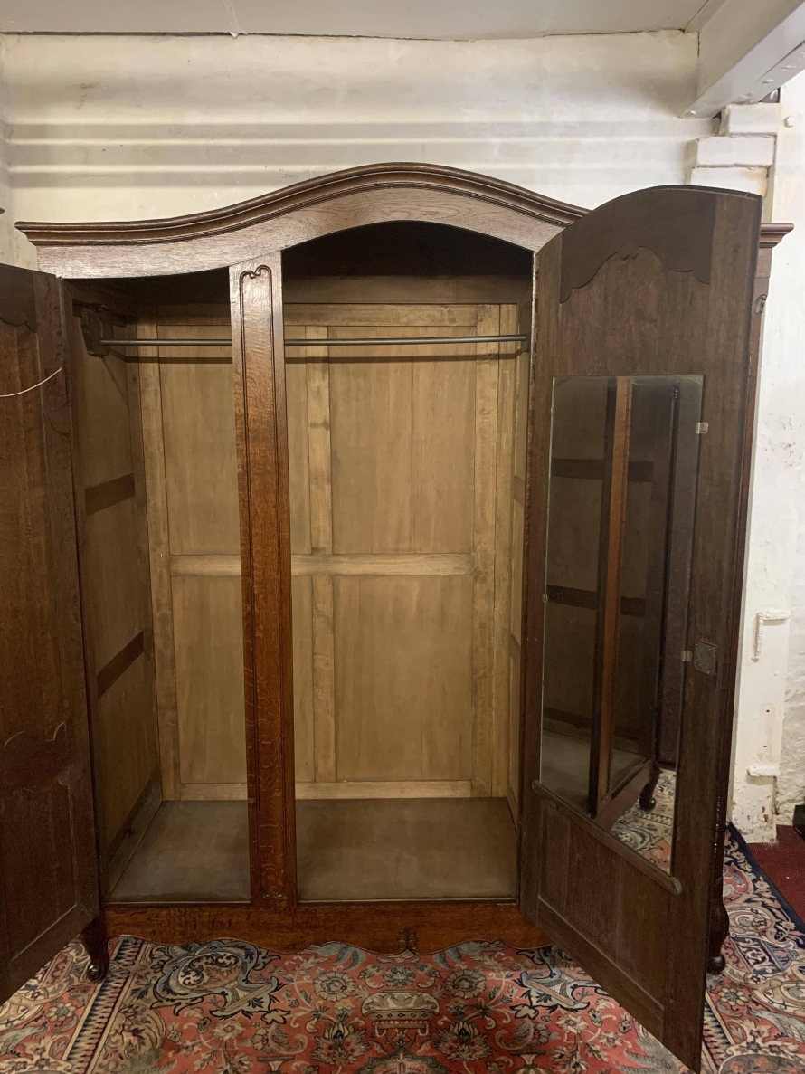 The shaped top sits above three shaped recessed panelled doors. The left-hand door and central door open to reveal brass hanging rail. Behind the central door is a dressing mirror. The right-hand door opens to reveal two removable shelves. Each door is lockable having brass hinges, key and decorative escutcheon. Recessed panelled sides, shaped skirt with central decoration this fantastic French armoire stands on two carved cabriole legs to the front.