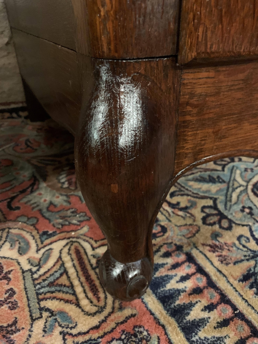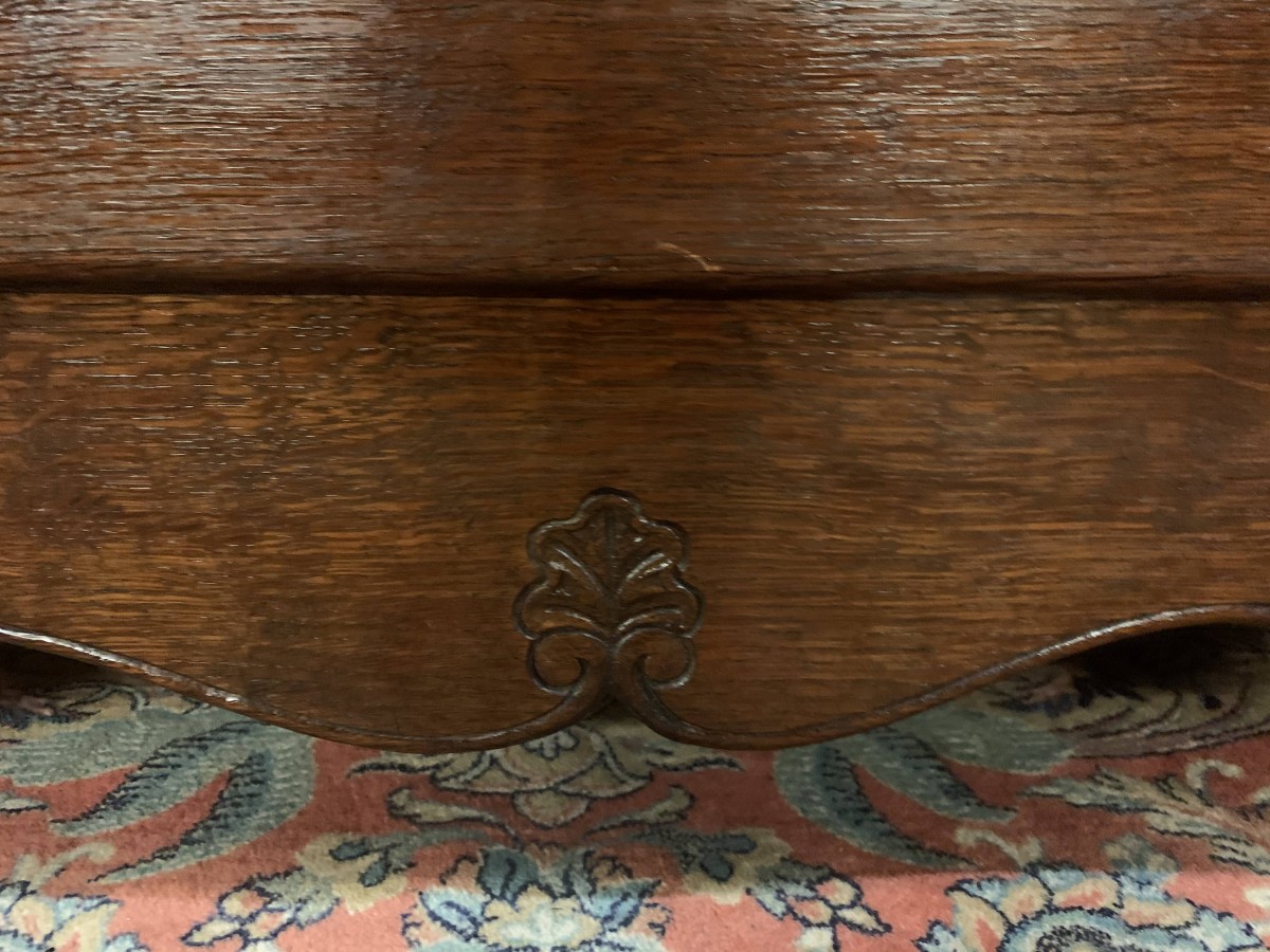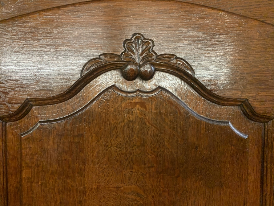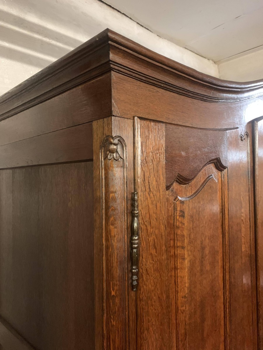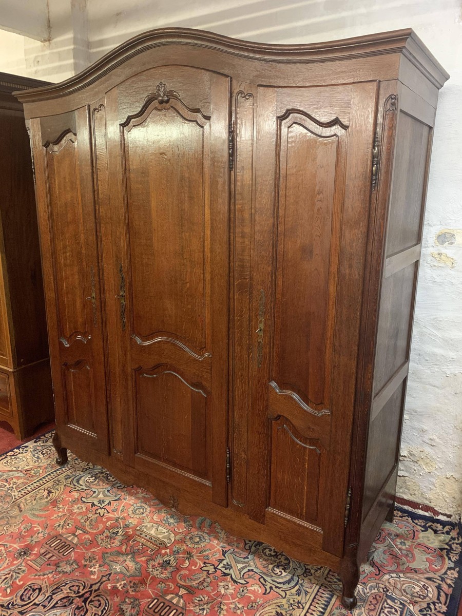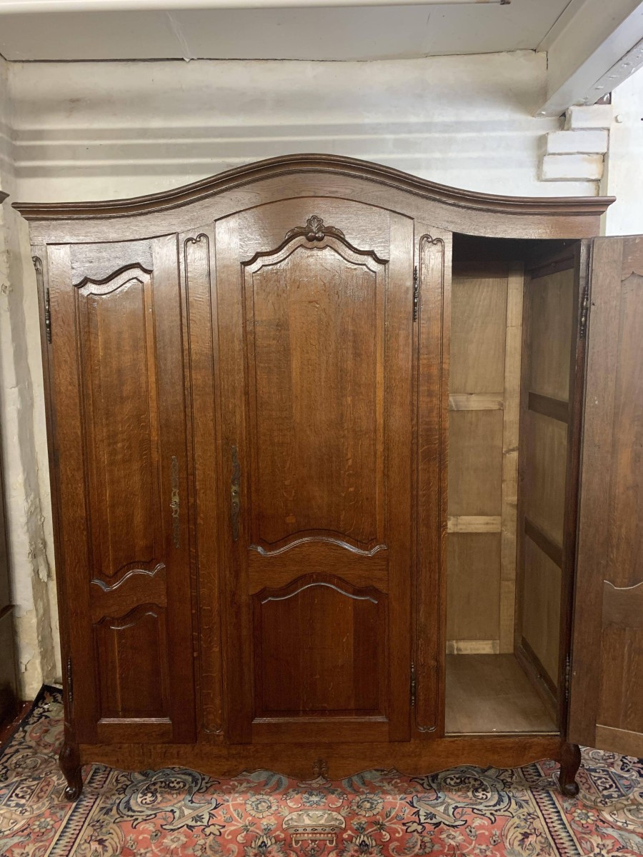 The shaped top sits above three shaped recessed panelled doors. The left-hand door and central door open to reveal brass hanging rail. Behind the central door is a dressing mirror. The right-hand door opens to reveal two removable shelves. Each door is lockable having brass hinges, key and decorative escutcheon. Recessed panelled sides, shaped skirt with central decoration this fantastic French armoire stands on two carved cabriole legs to the front.
