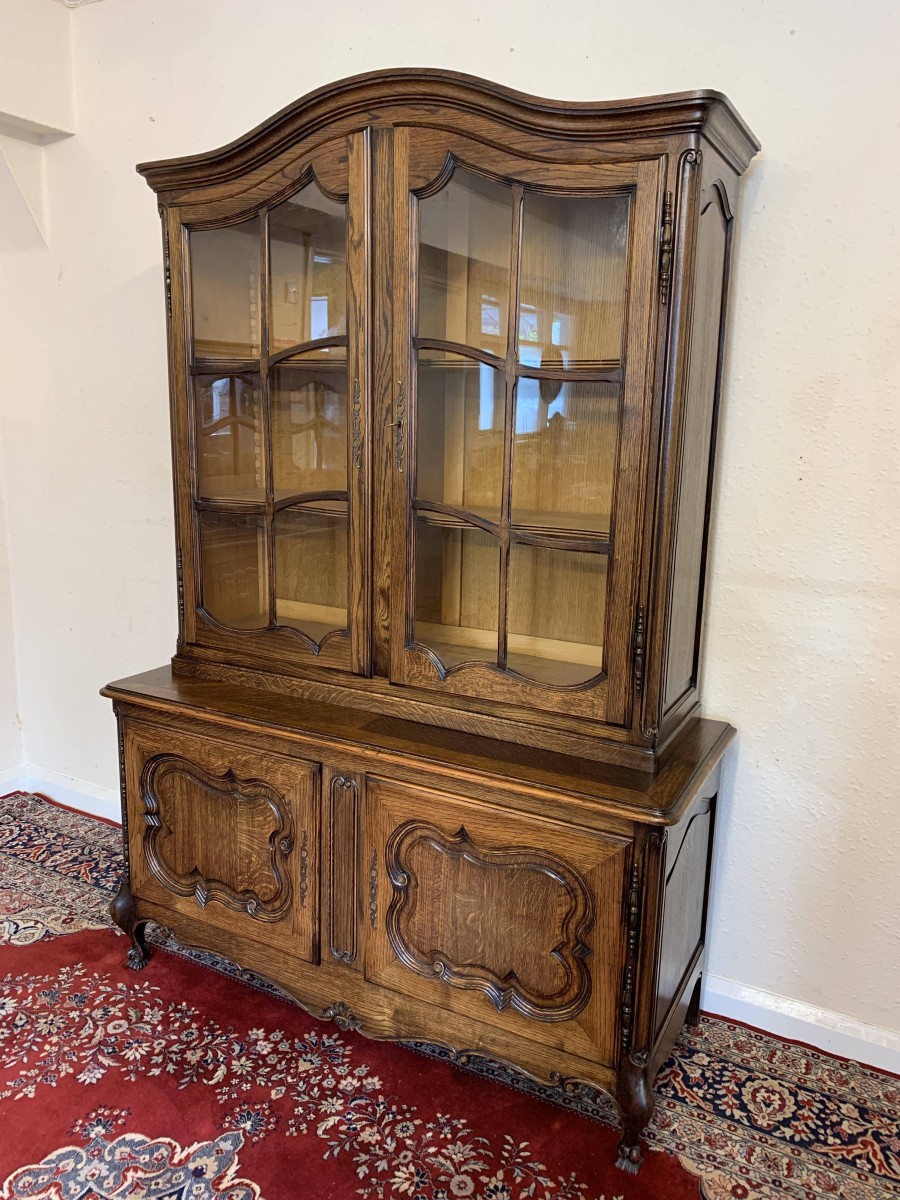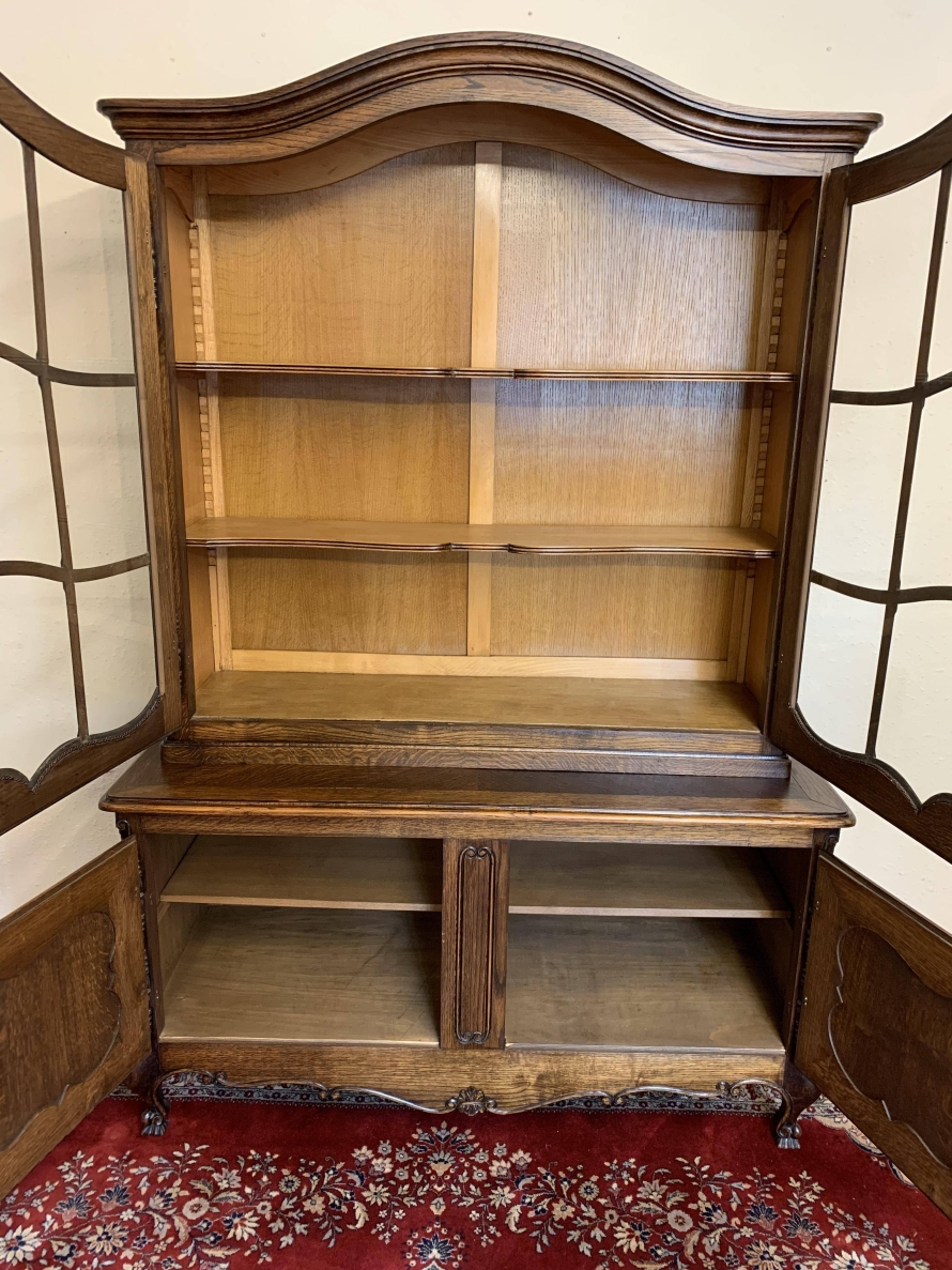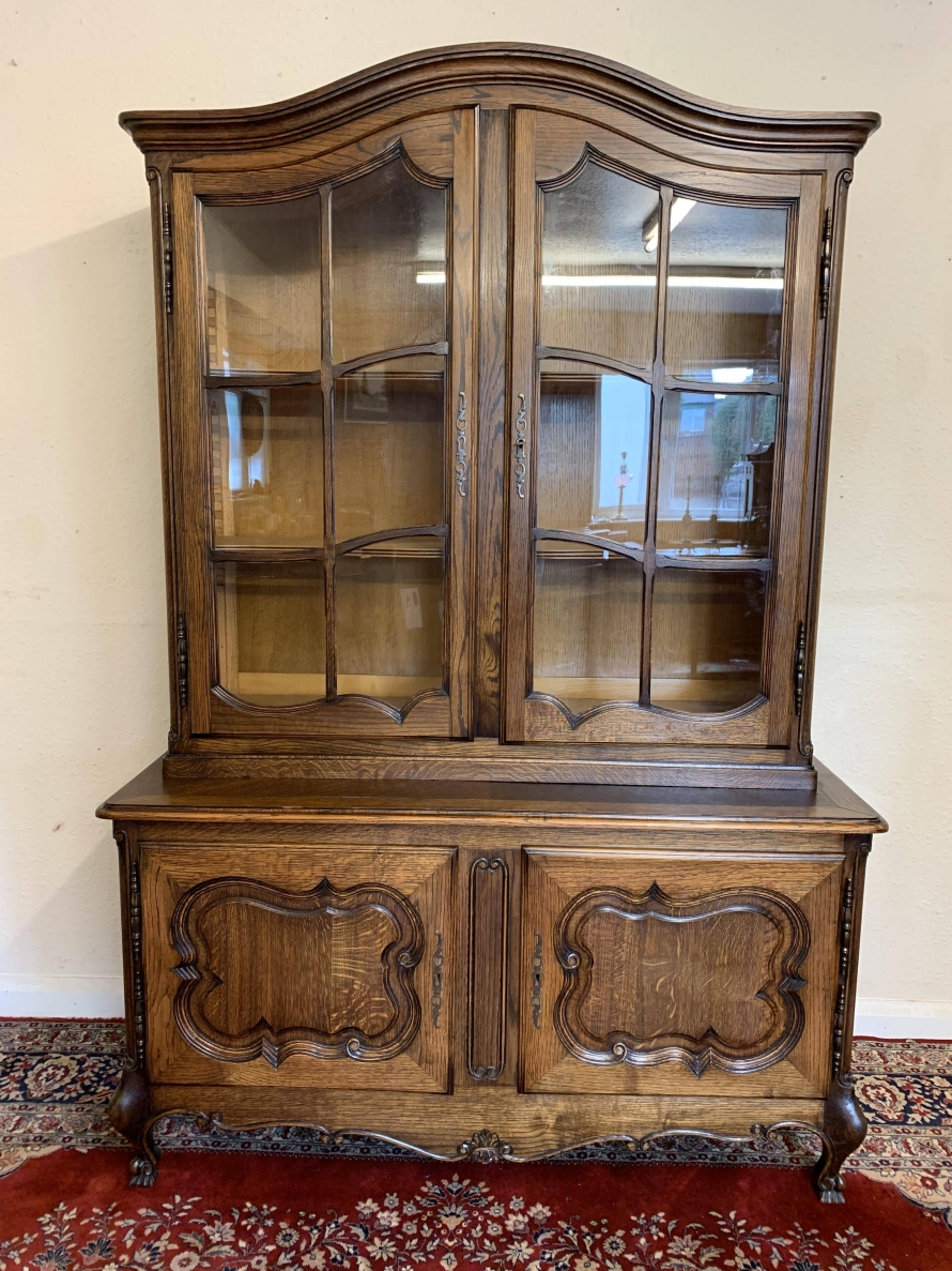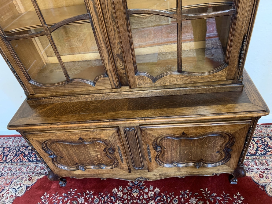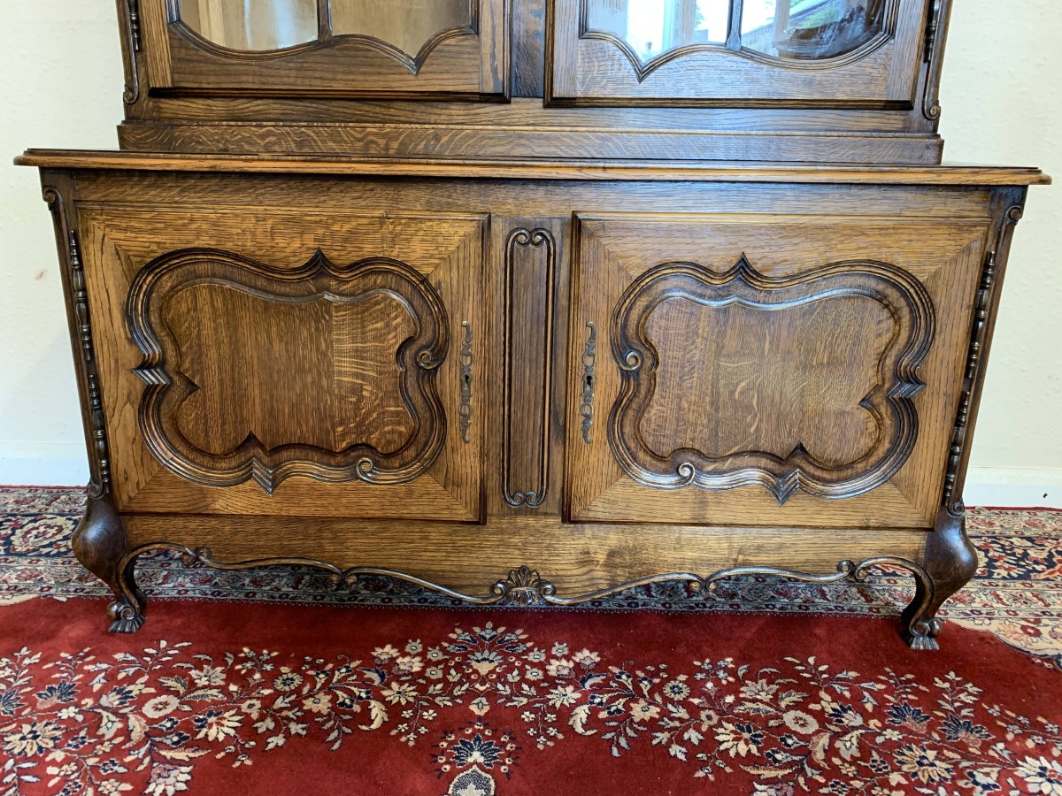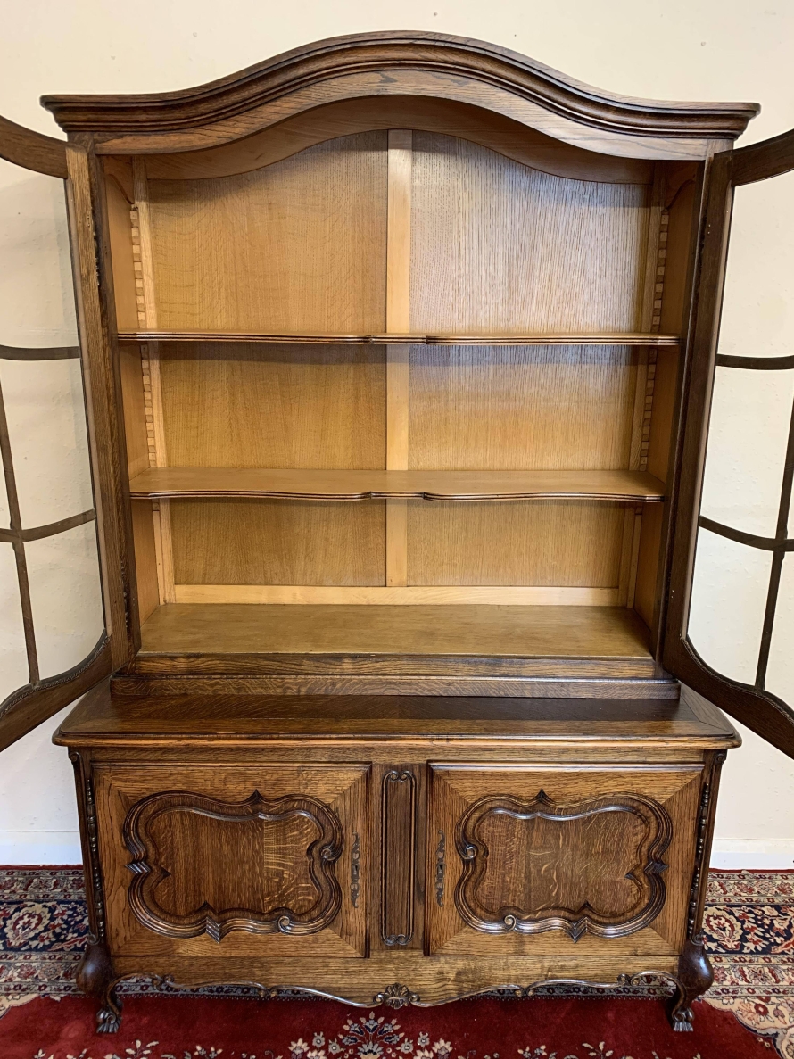 The shaped over sailing top sits above a pair of lockable glazed doors, each door having brass hinges and decorative escutcheon. The doors open to reveal to shaped adjustable and removable shelves. The base has a pair of lockable shaped recessed panelled doors, each with brass hinges and brass escutcheon. The doors open to reveal a removable shelf. Recessed panelled sides, shaped skirt with central carved decoration this top quality item of French furniture stands on two carved cabriole shaped legs to the front.