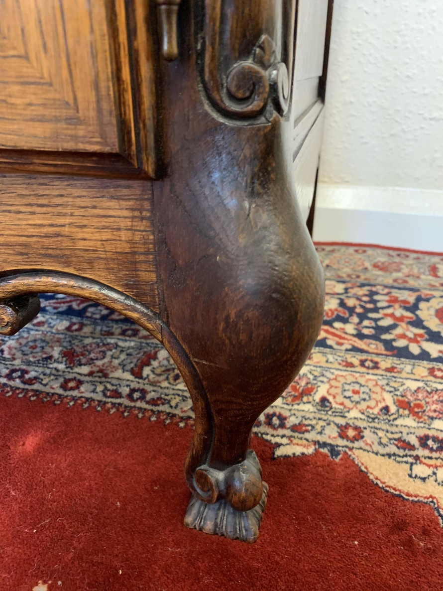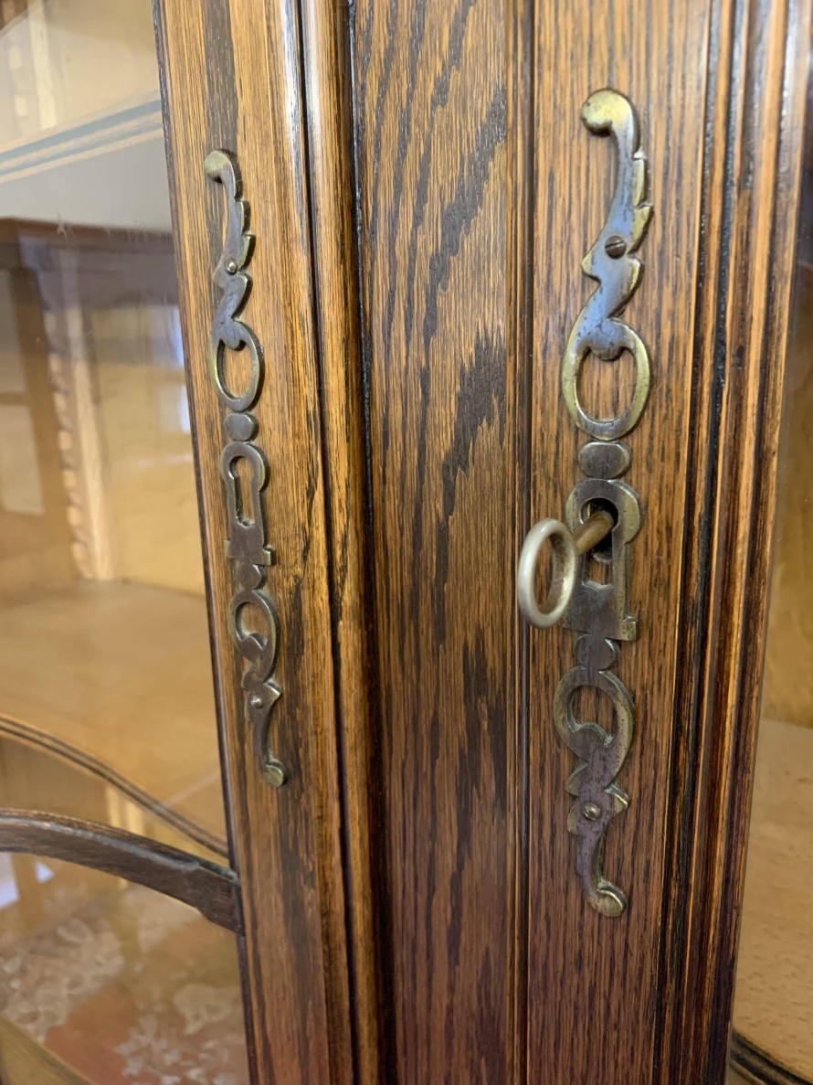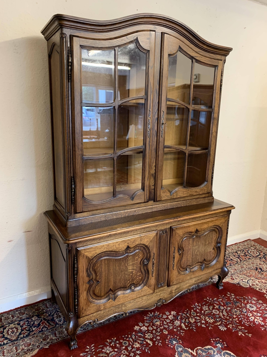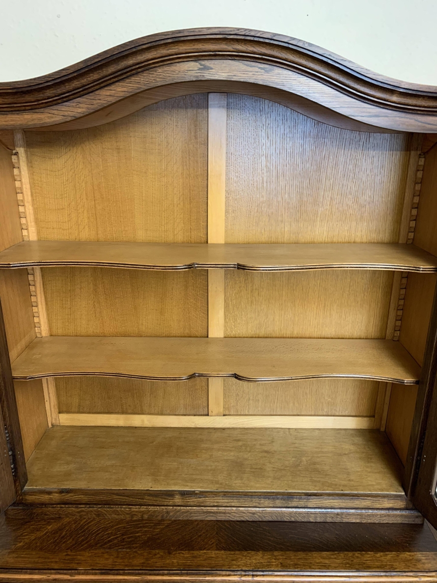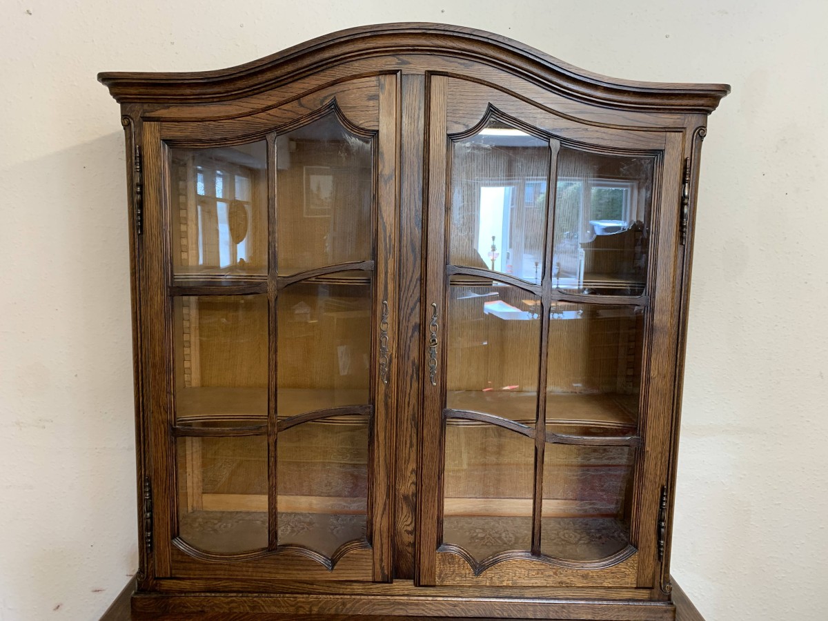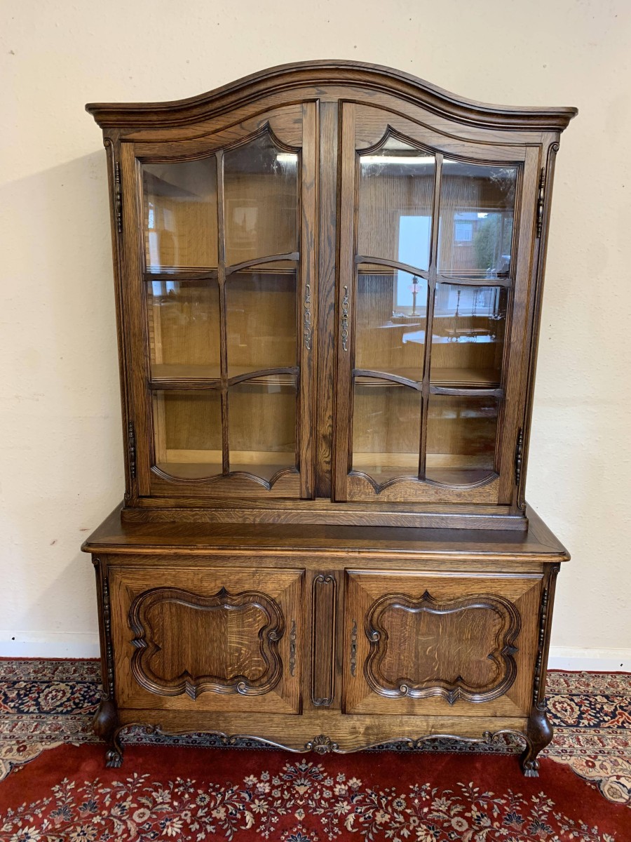 The shaped over sailing top sits above a pair of lockable glazed doors, each door having brass hinges and decorative escutcheon. The doors open to reveal to shaped adjustable and removable shelves. The base has a pair of lockable shaped recessed panelled doors, each with brass hinges and brass escutcheon. The doors open to reveal a removable shelf. Recessed panelled sides, shaped skirt with central carved decoration this top quality item of French furniture stands on two carved cabriole shaped legs to the front.