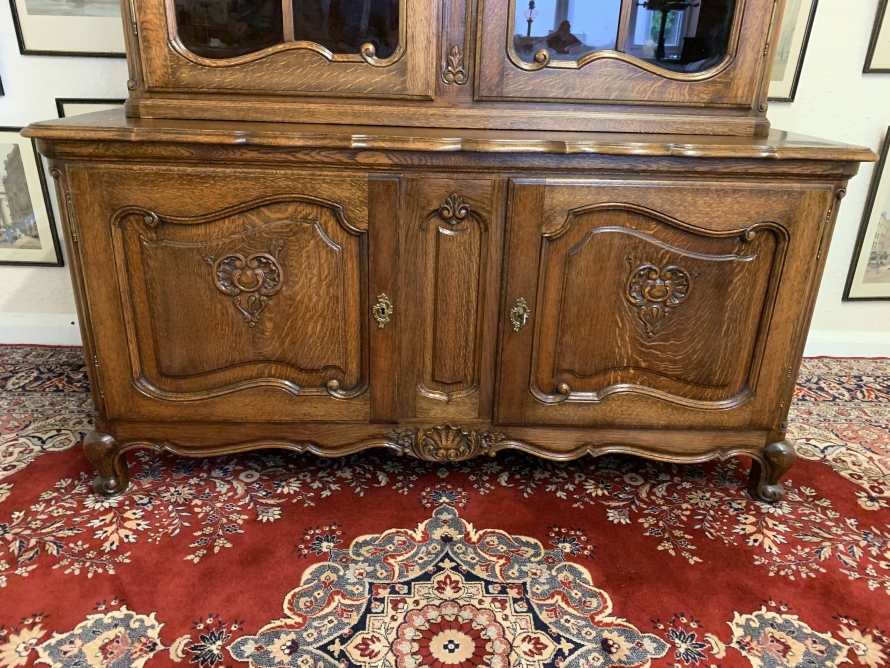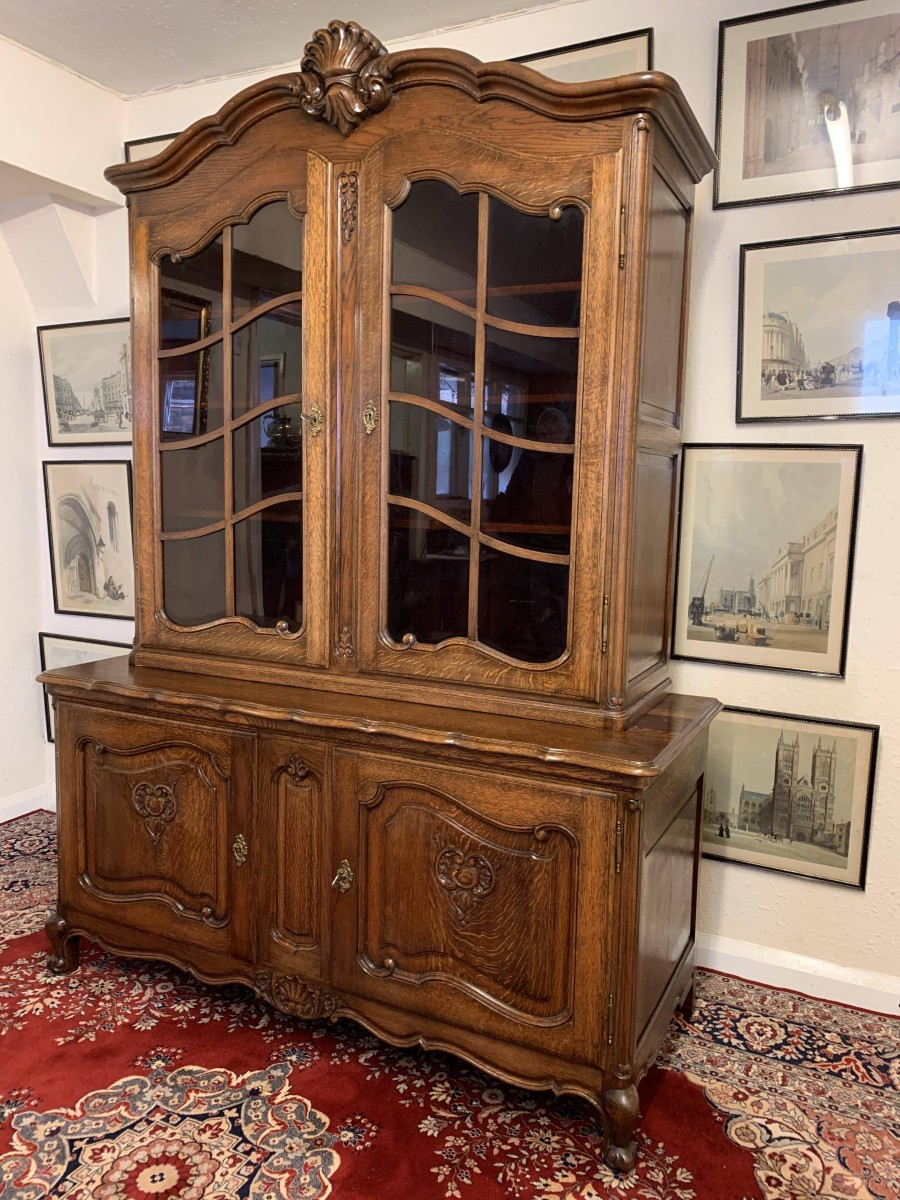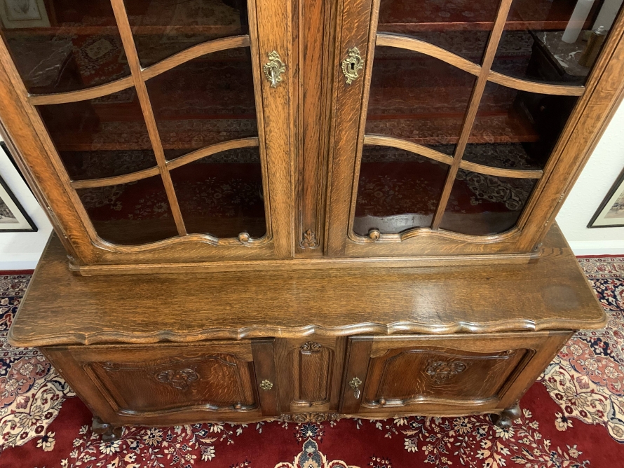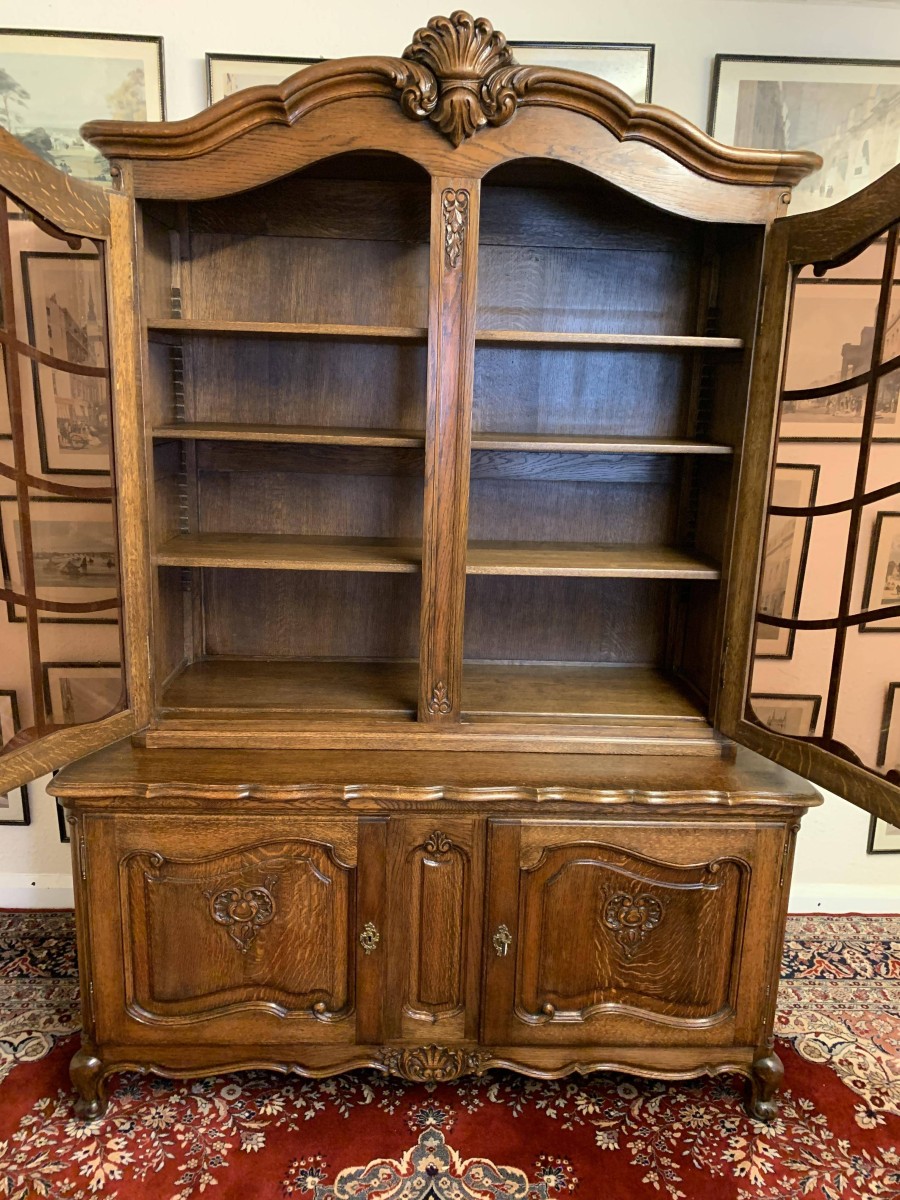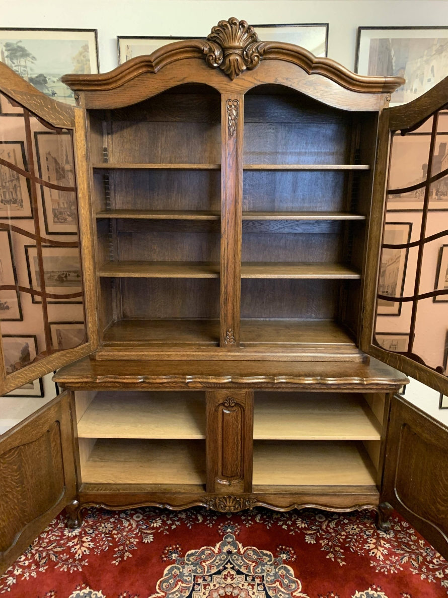 The shaped oversailing top rises to a glorious central carving. Below aretwo lockable glazed doors. Each door has brass hinges and decorative escutcheon. the doors open to reveal three adjustable and remvable shelves. The shaped base has two carved recessed panelled lockable cupboard doors. Each door has brass hinges and decorative escutcheons. The doors open to reveal a removable shelf. Recessed panelled sides, shaped skirt with central carving. This stylish French vitrine stands on two carved cabriole legs to the front.