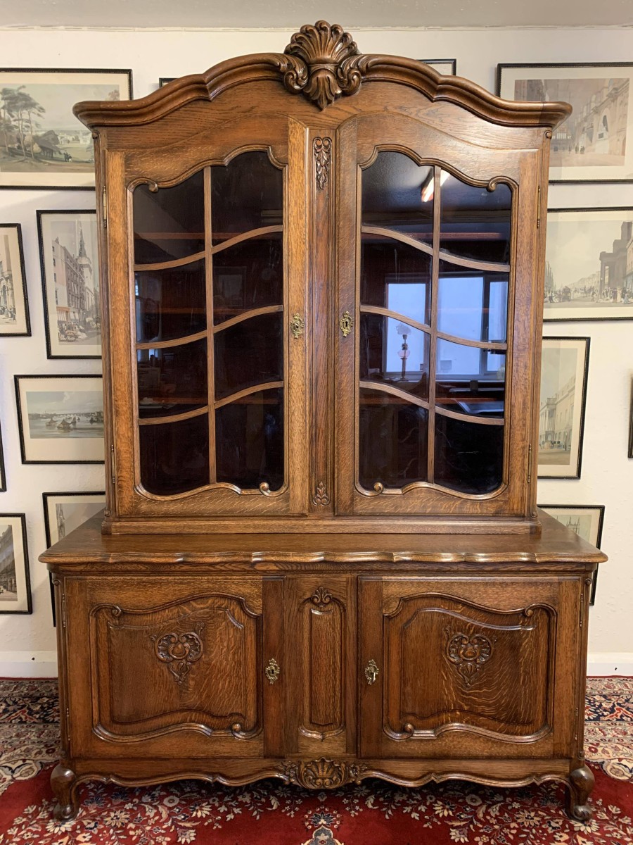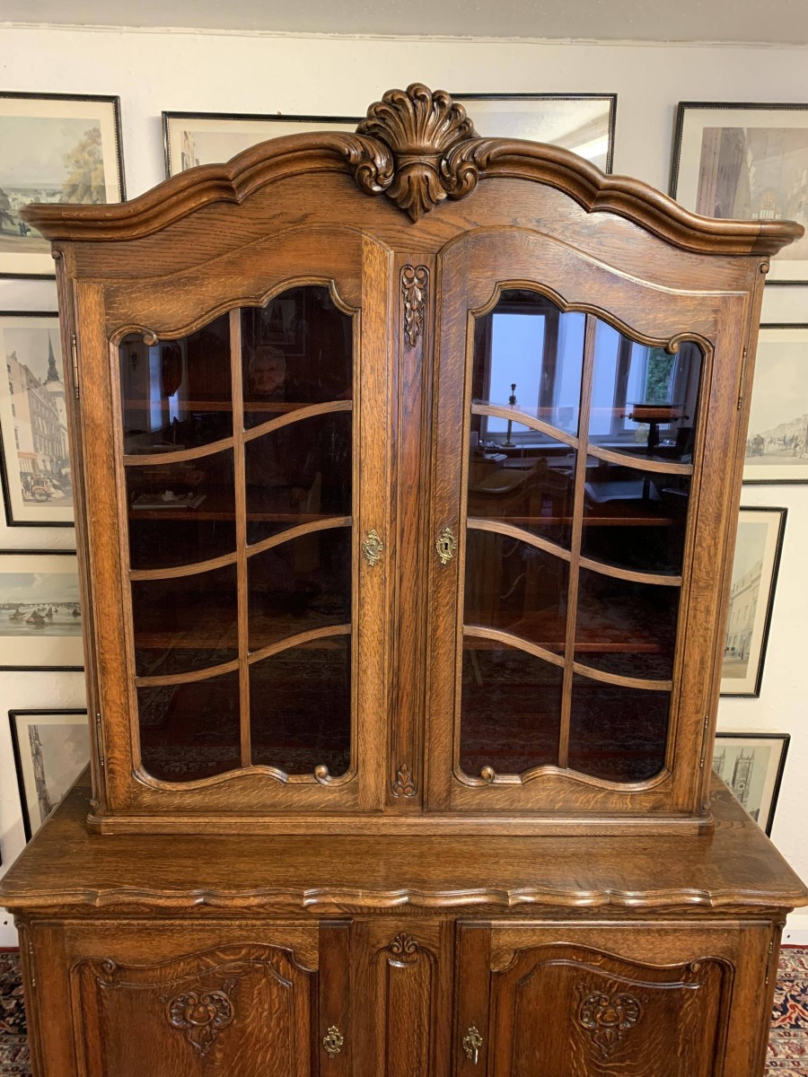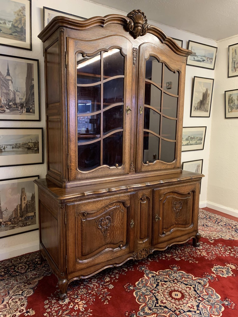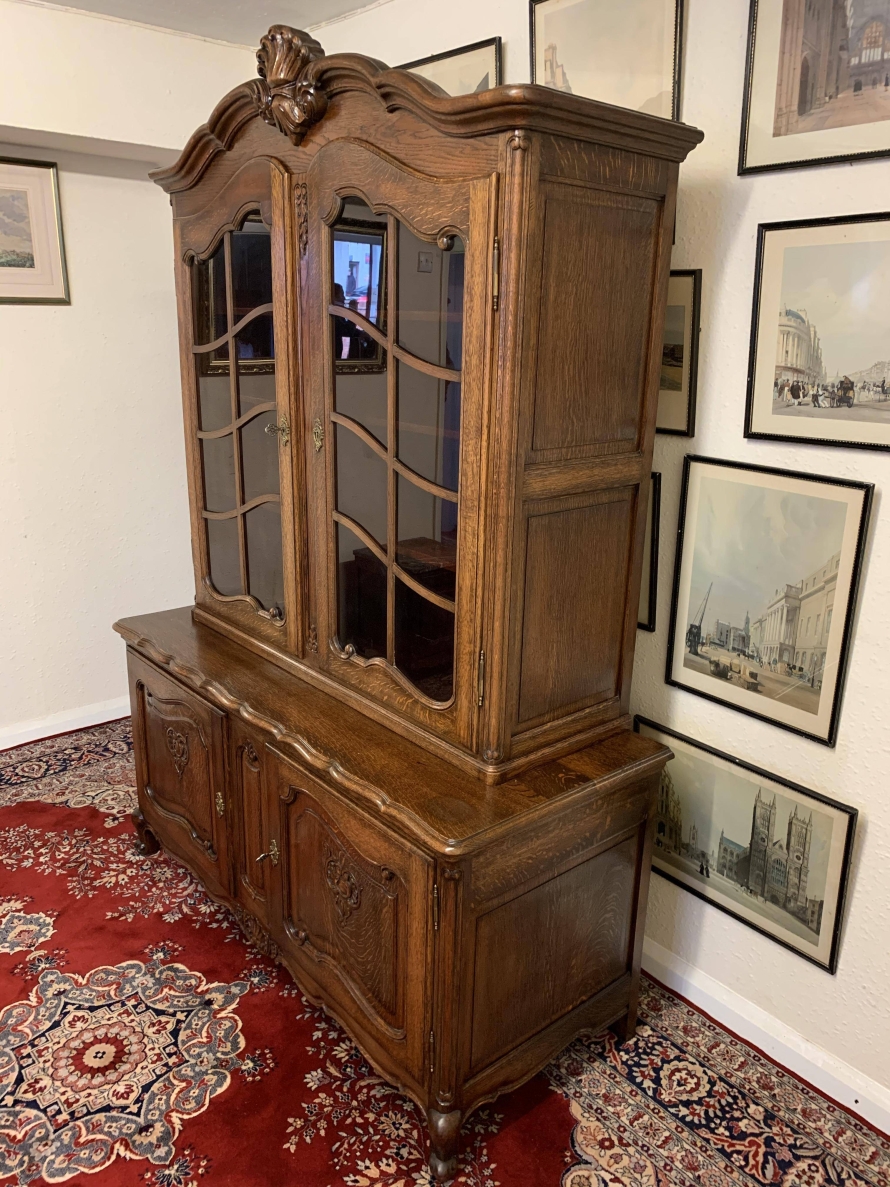 The shaped oversailing top rises to a glorious central carving. Below aretwo lockable glazed doors. Each door has brass hinges and decorative escutcheon. the doors open to reveal three adjustable and remvable shelves. The shaped base has two carved recessed panelled lockable cupboard doors. Each door has brass hinges and decorative escutcheons. The doors open to reveal a removable shelf. Recessed panelled sides, shaped skirt with central carving. This stylish French vitrine stands on two carved cabriole legs to the front.