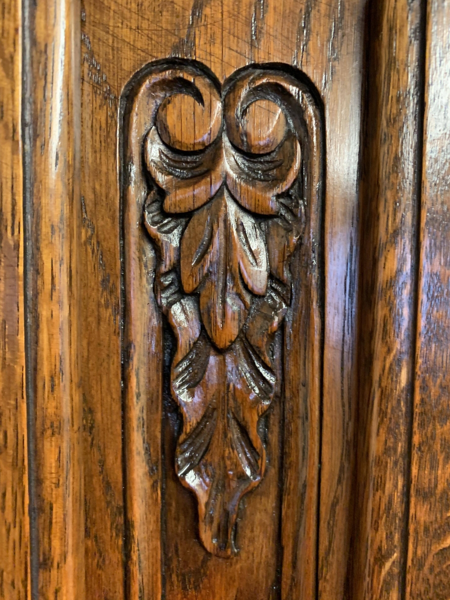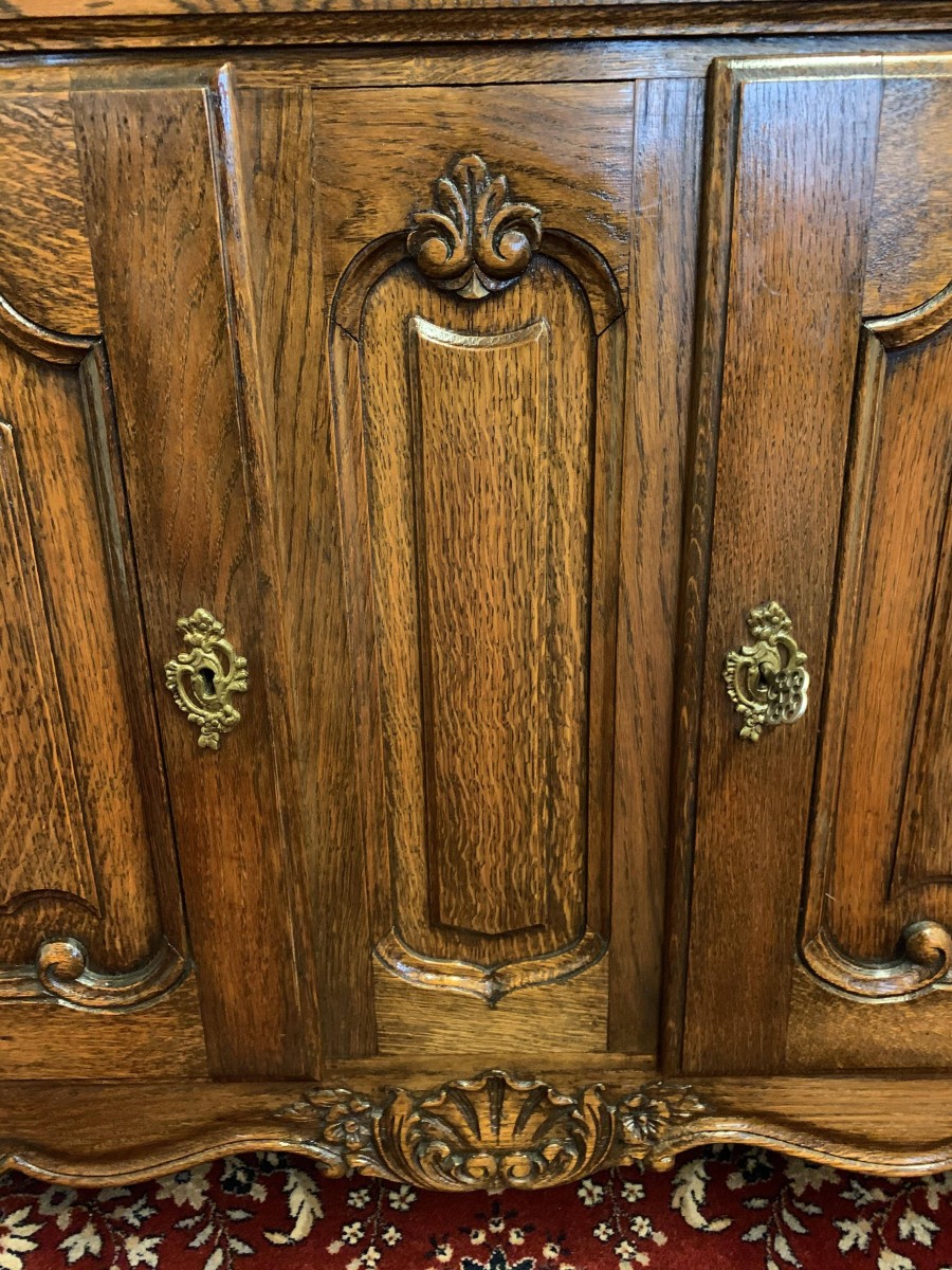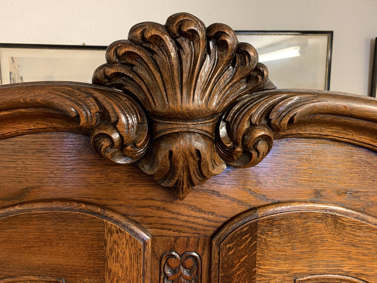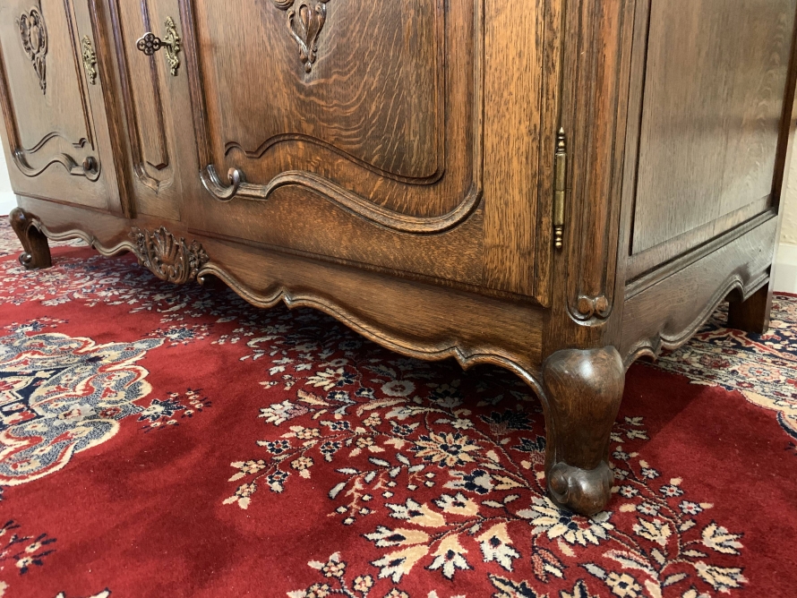 The shaped oversailing top rises to a glorious central carving. Below aretwo lockable glazed doors. Each door has brass hinges and decorative escutcheon. the doors open to reveal three adjustable and remvable shelves. The shaped base has two carved recessed panelled lockable cupboard doors. Each door has brass hinges and decorative escutcheons. The doors open to reveal a removable shelf. Recessed panelled sides, shaped skirt with central carving. This stylish French vitrine stands on two carved cabriole legs to the front.