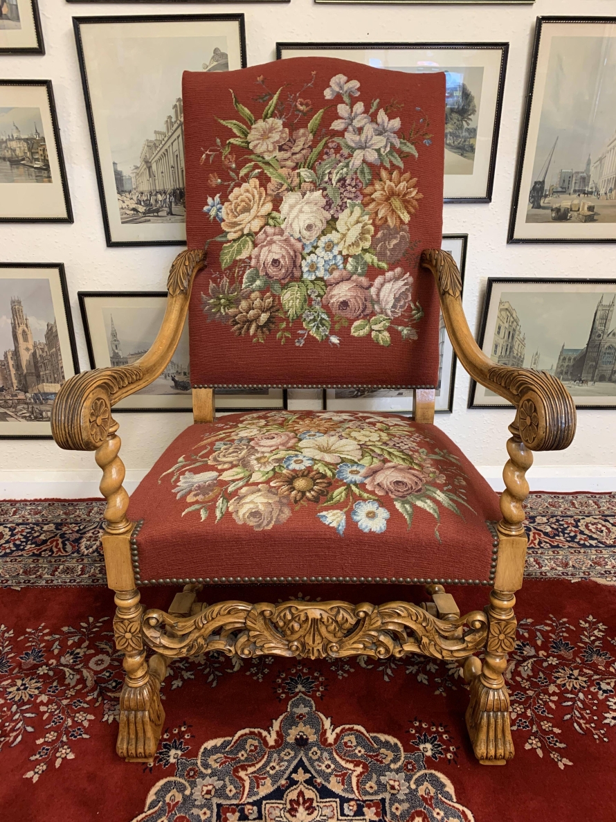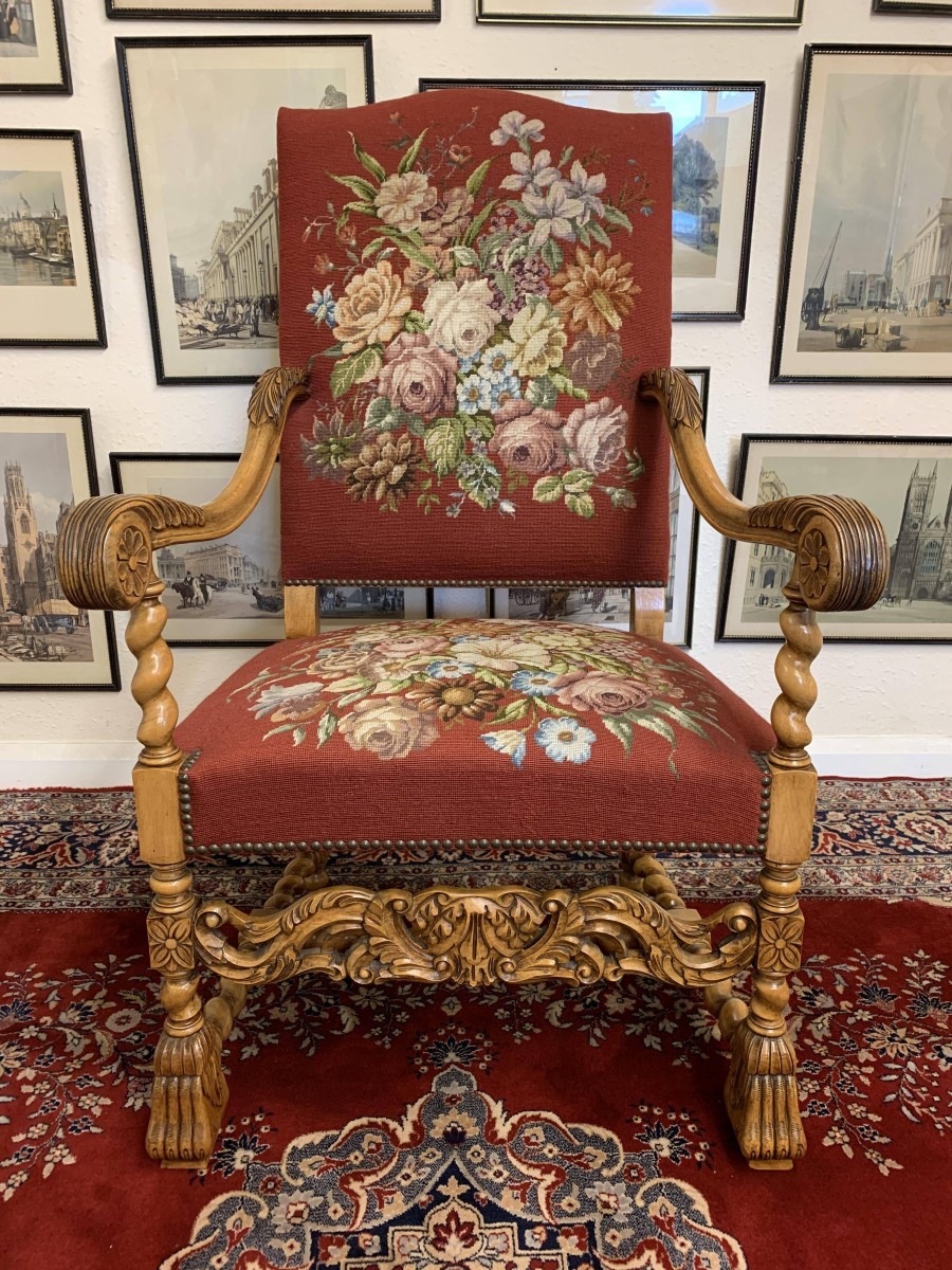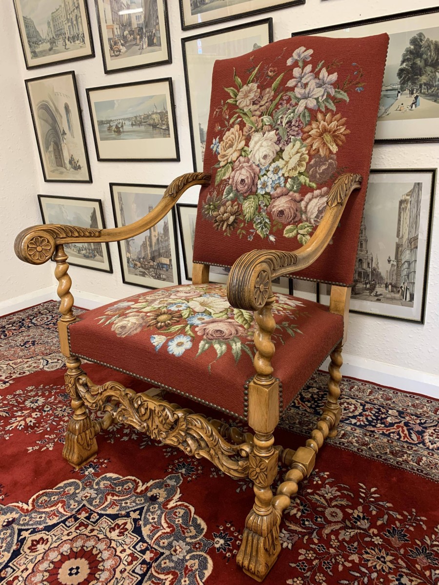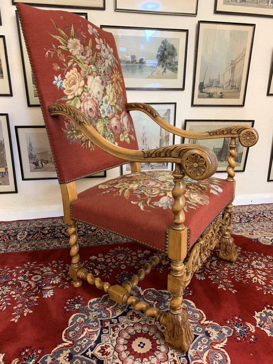 Outstanding Quality French Carved Walnut Barley Twist Needlepoint Throne/armchair – Now Sold