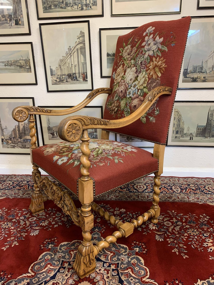 - Outstanding Quality French Carved Walnut Barley Twist Needlepoint Throne/armchair – Now Sold