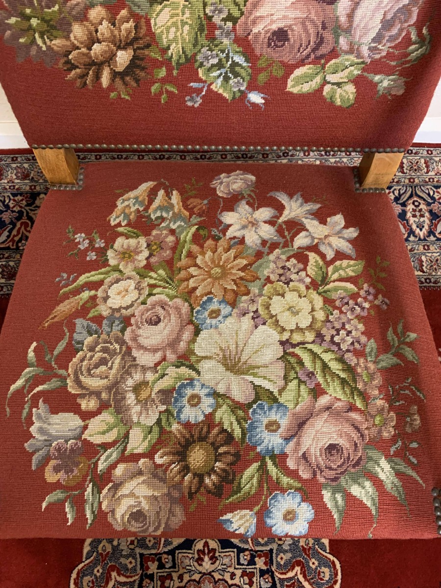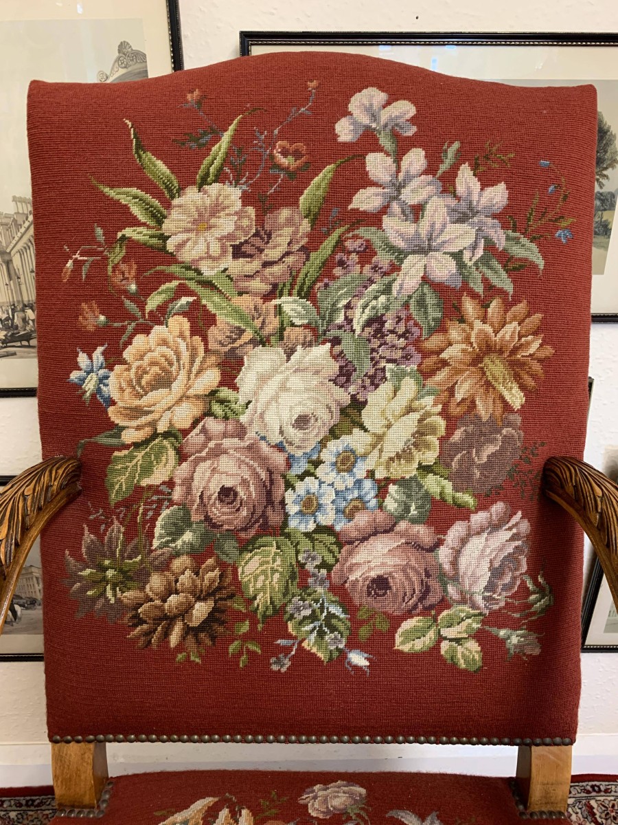 The cushioned back and seat have glorious floral needlepoint decoration. The back and seat have metal studded decoration. The carved flowing arms have barley twist supports. Ornate front carved rail, barley twist back legs and stretcher supports, this fantastic throne armchair sits on paw feet to the front. Please note this chair is in excellent condition