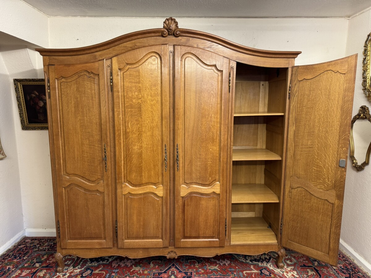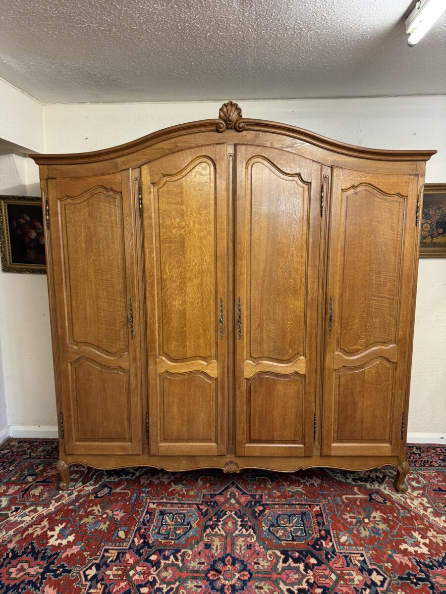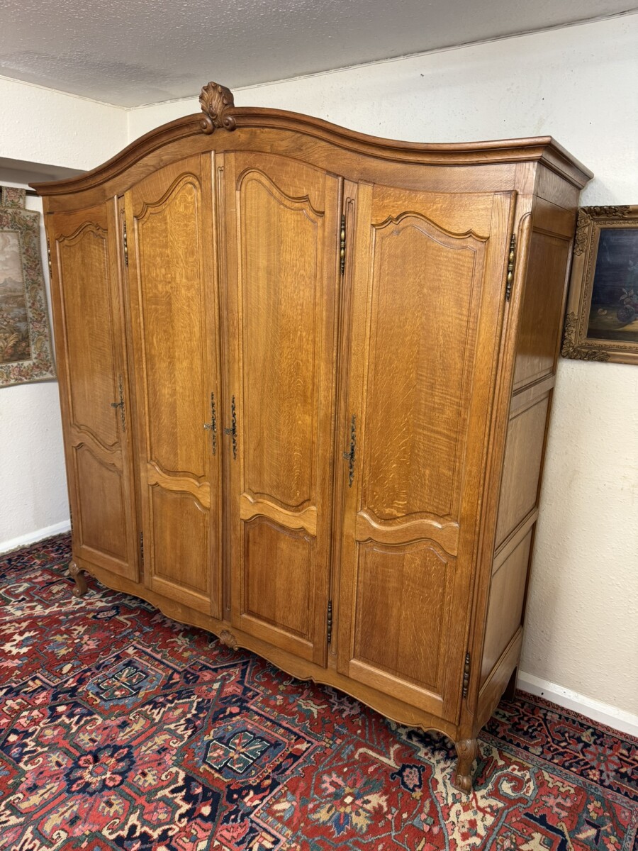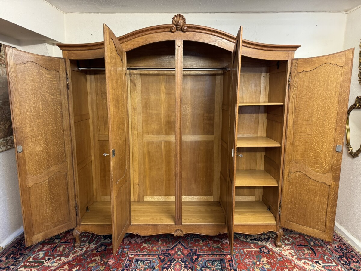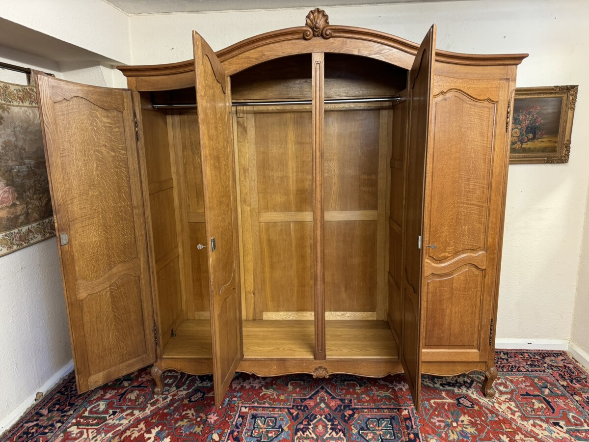 The shaped oversailing top rises to a central carving, below are four lockable doors each door having brass hinges decorative escutcheon and key. The left-hand door and pair of central doors open to reveal a hanging rail. The right-hand door opens to reveal three removable shelves. Recessed panelled sides, shaped skirt with central carving and standing on two carved cabriole shaped legs to the front. Please not that this armoire completely splits down for easy transportation and delivery into your home.