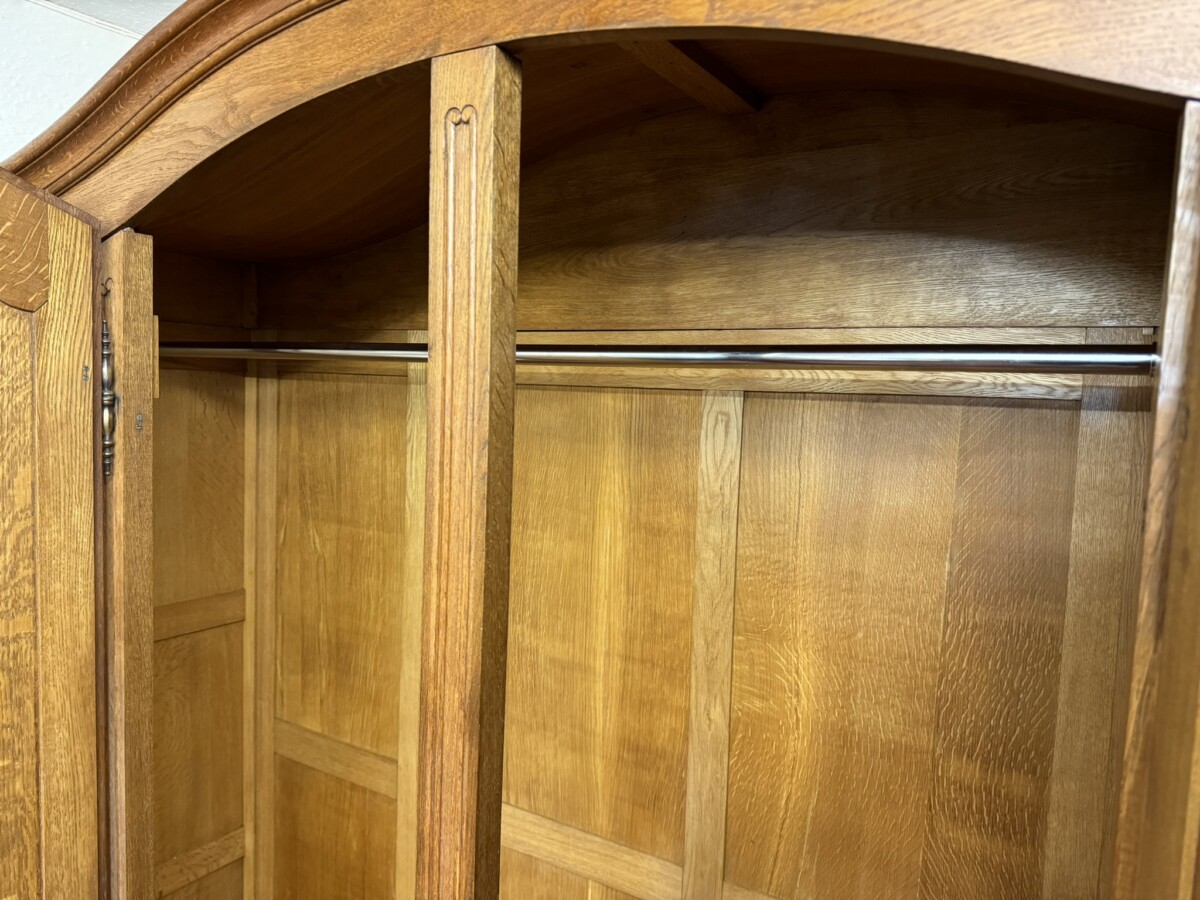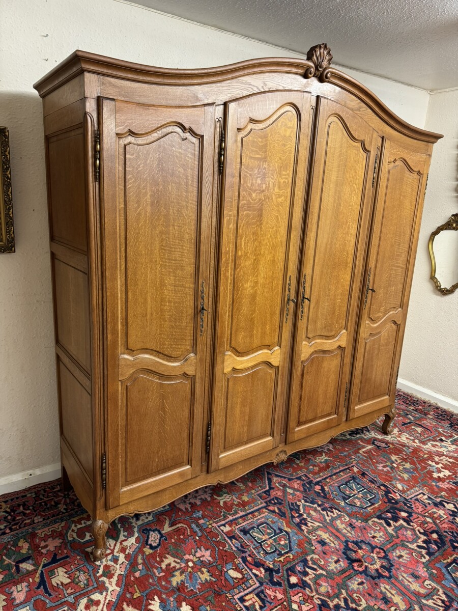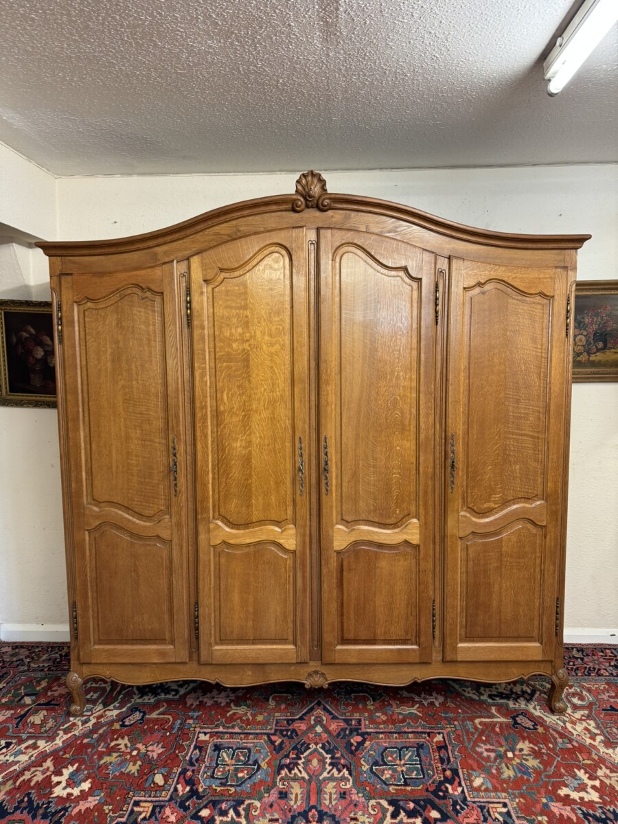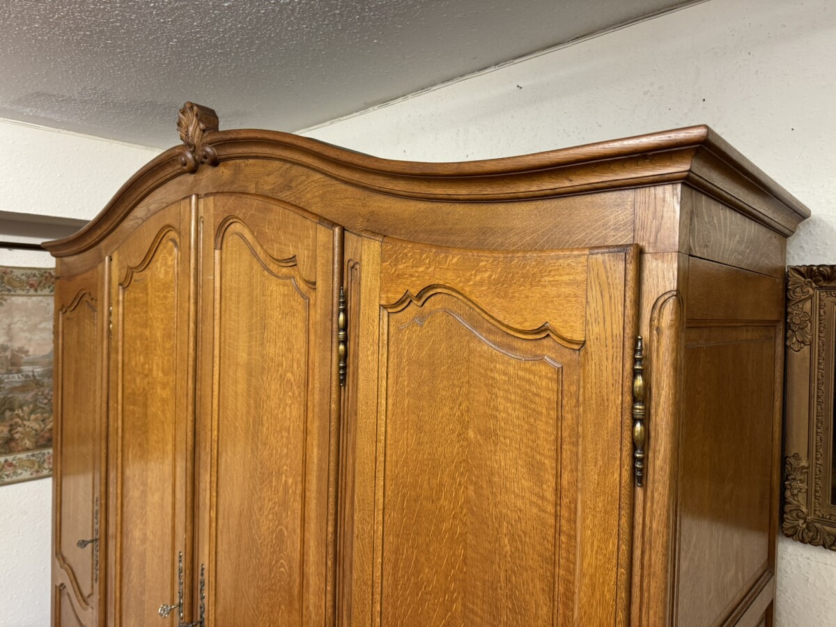 The shaped oversailing top rises to a central carving, below are four lockable doors each door having brass hinges decorative escutcheon and key. The left-hand door and pair of central doors open to reveal a hanging rail. The right-hand door opens to reveal three removable shelves. Recessed panelled sides, shaped skirt with central carving and standing on two carved cabriole shaped legs to the front. Please not that this armoire completely splits down for easy transportation and delivery into your home.