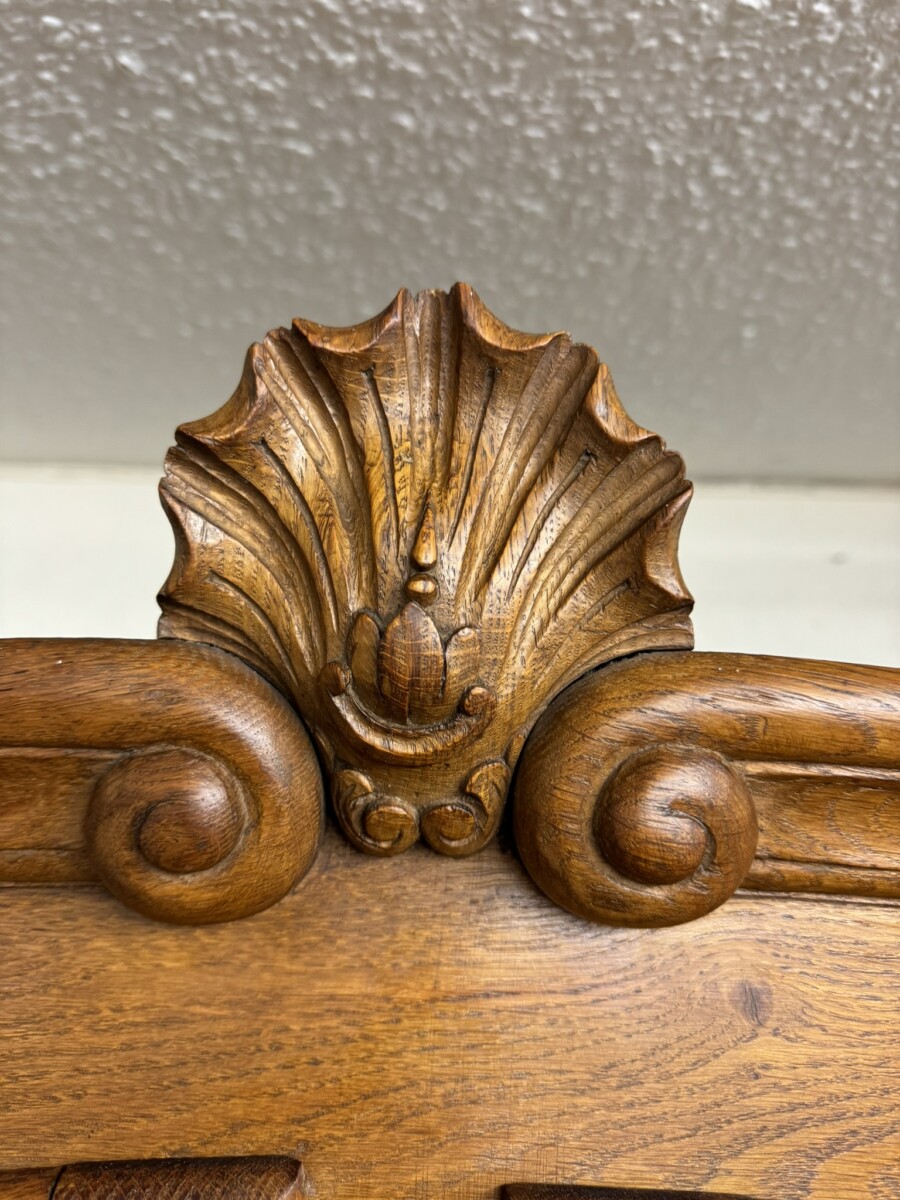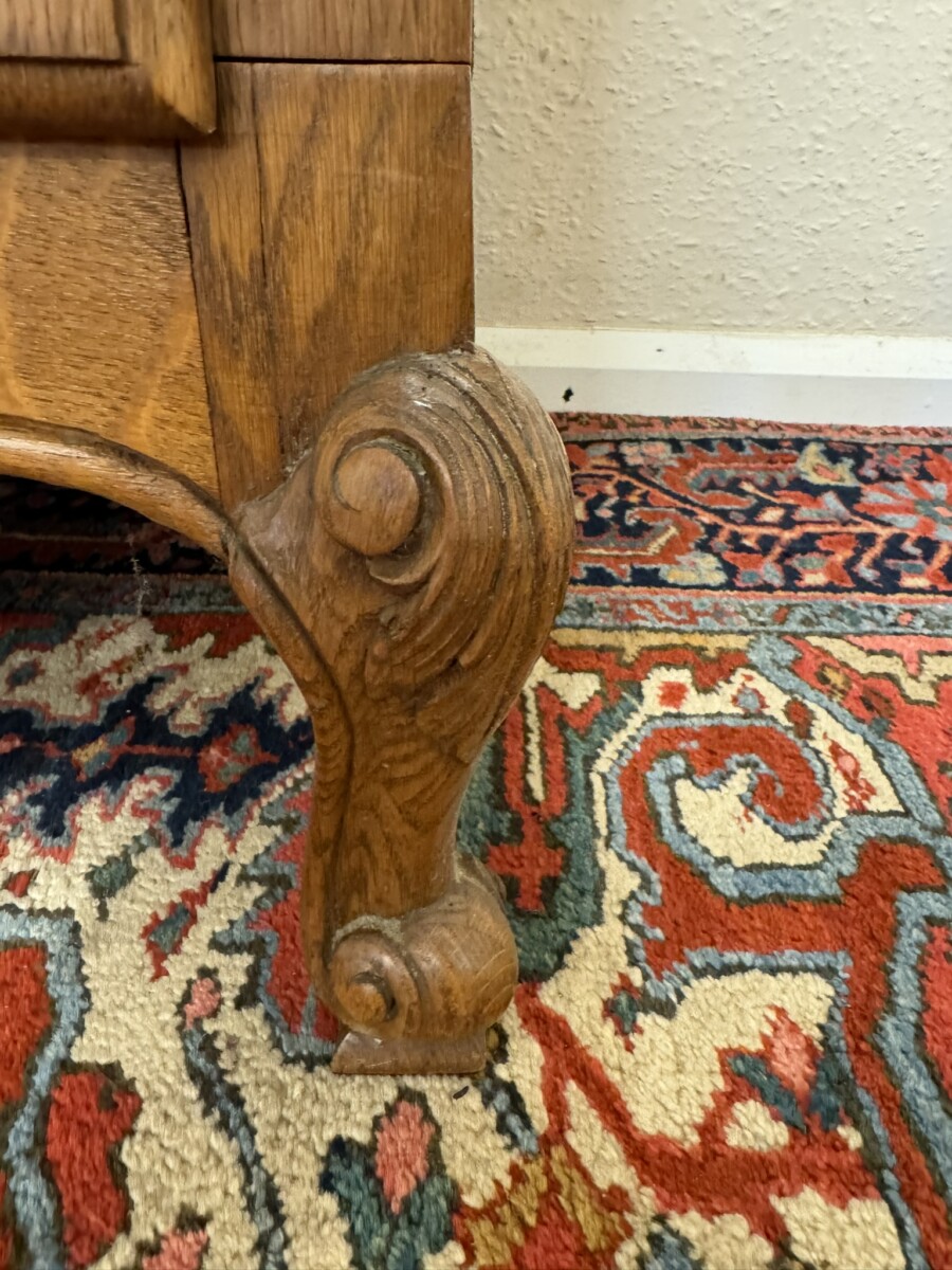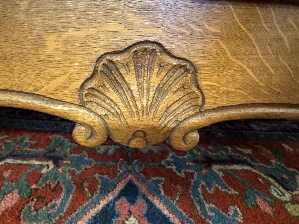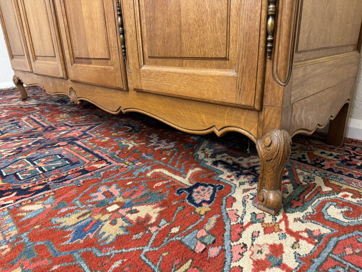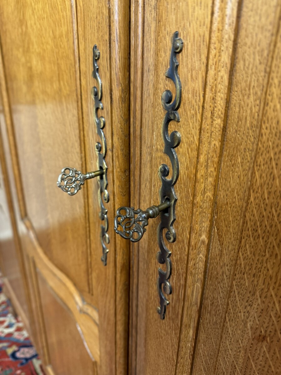 The shaped oversailing top rises to a central carving, below are four lockable doors each door having brass hinges decorative escutcheon and key. The left-hand door and pair of central doors open to reveal a hanging rail. The right-hand door opens to reveal three removable shelves. Recessed panelled sides, shaped skirt with central carving and standing on two carved cabriole shaped legs to the front. Please not that this armoire completely splits down for easy transportation and delivery into your home.