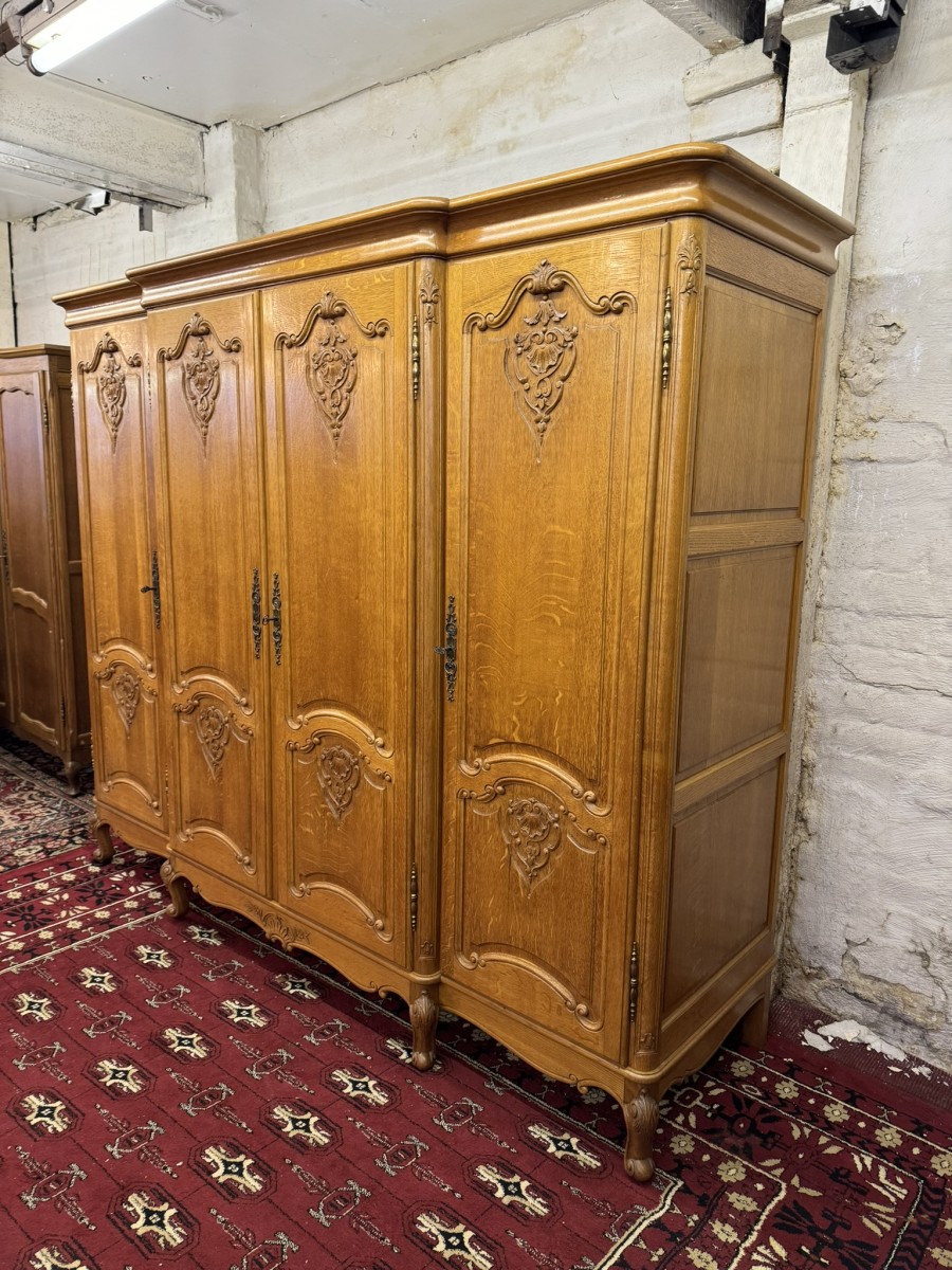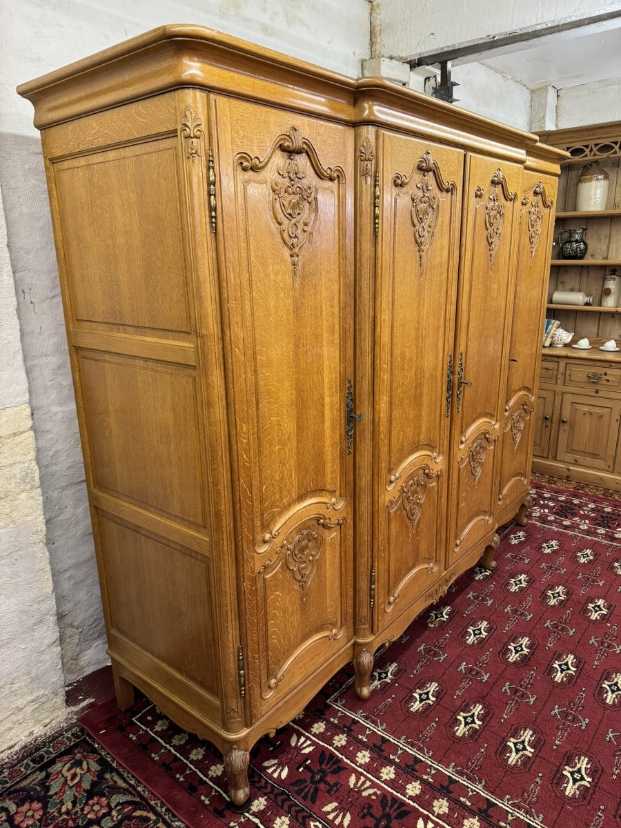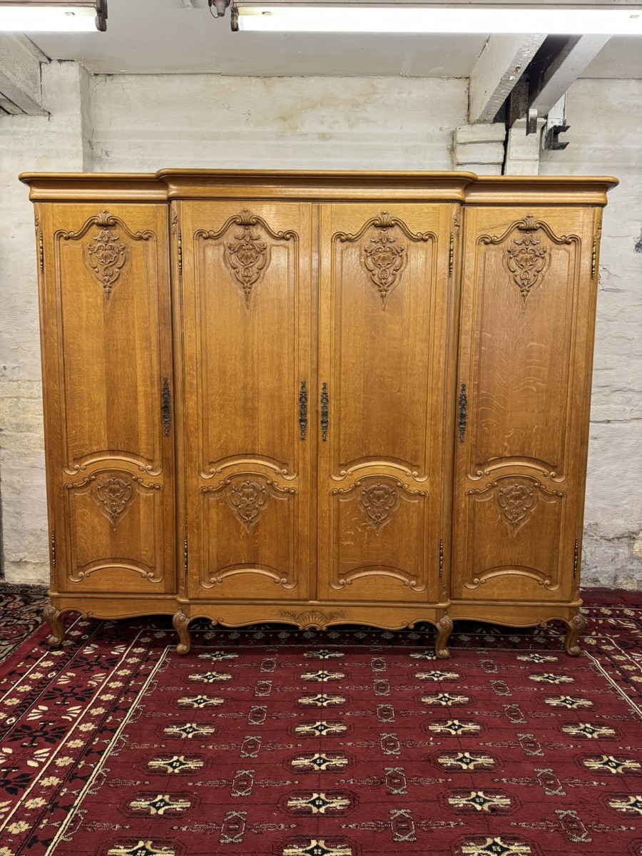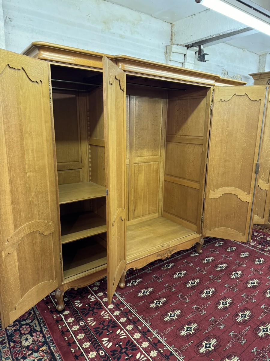 The oversailing top sits above four lockable carved recessed panelled doors, each door having brass hinges and decorative brass escutcheon. The central pair of doors are brakefront. The left-hand door opens to reveal a hanging rail above two adjustable and removable shelves the central pair of doors open to reveal a hanging rail the right-hand door opens to reveal three adjustable and removable shelves. Recessed panelled sides shaped skirt with decorative central carving this fabulous armoire stands on four carved cabriole legs to the front. Please note this armoire completely splits down for easy transportation and delivery into any home.