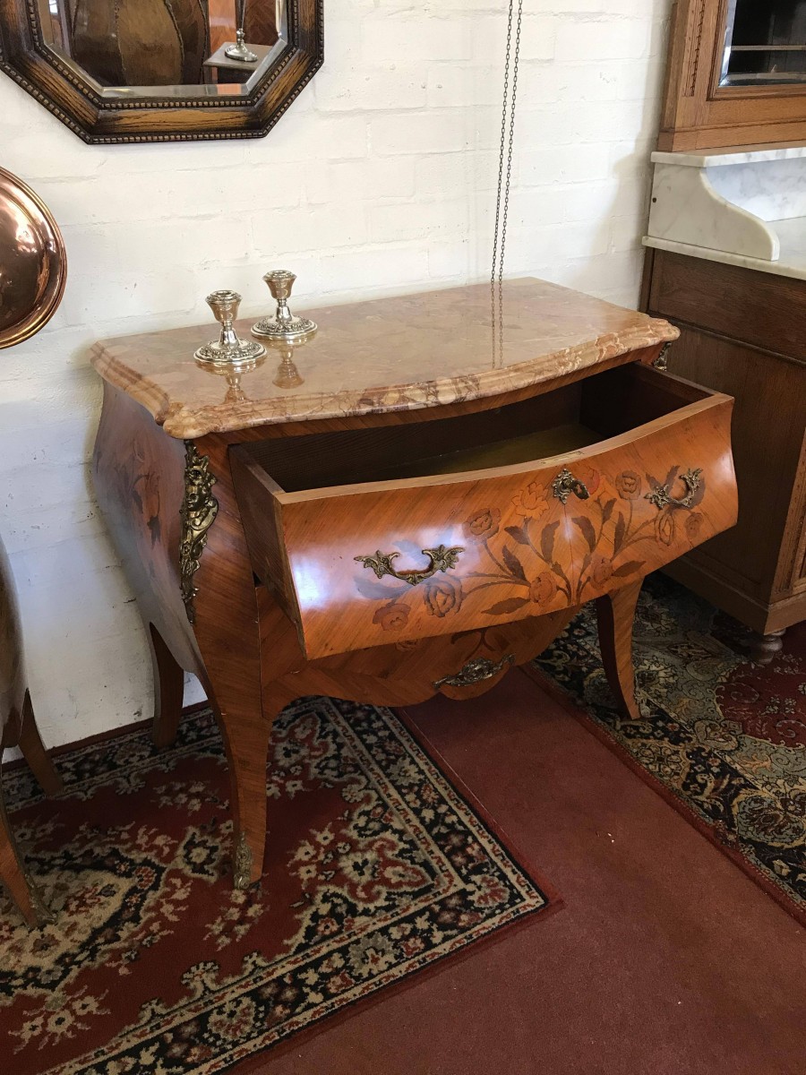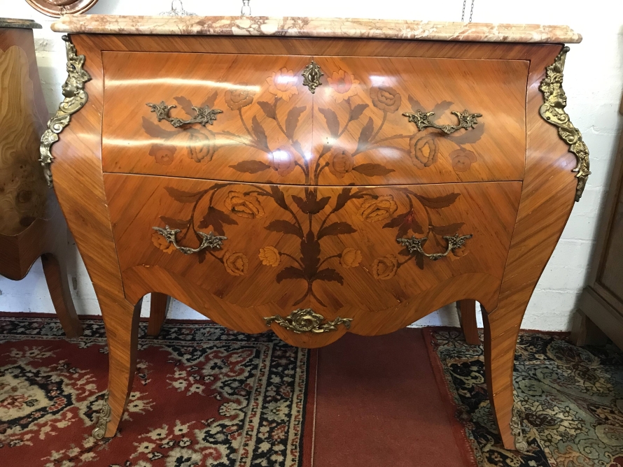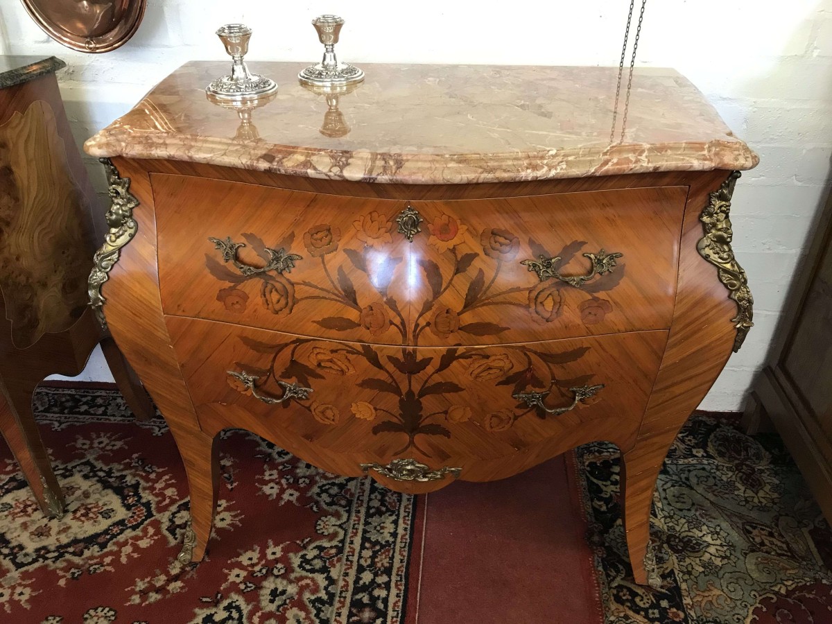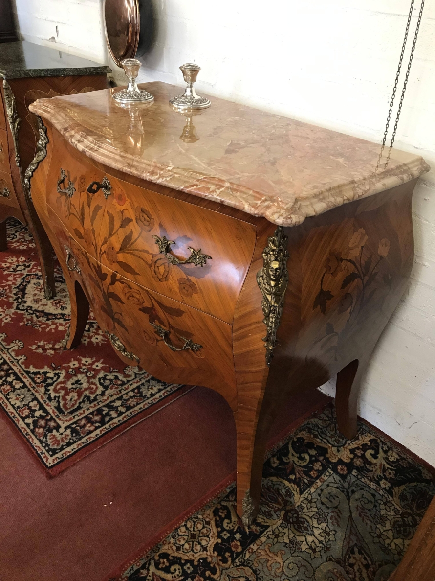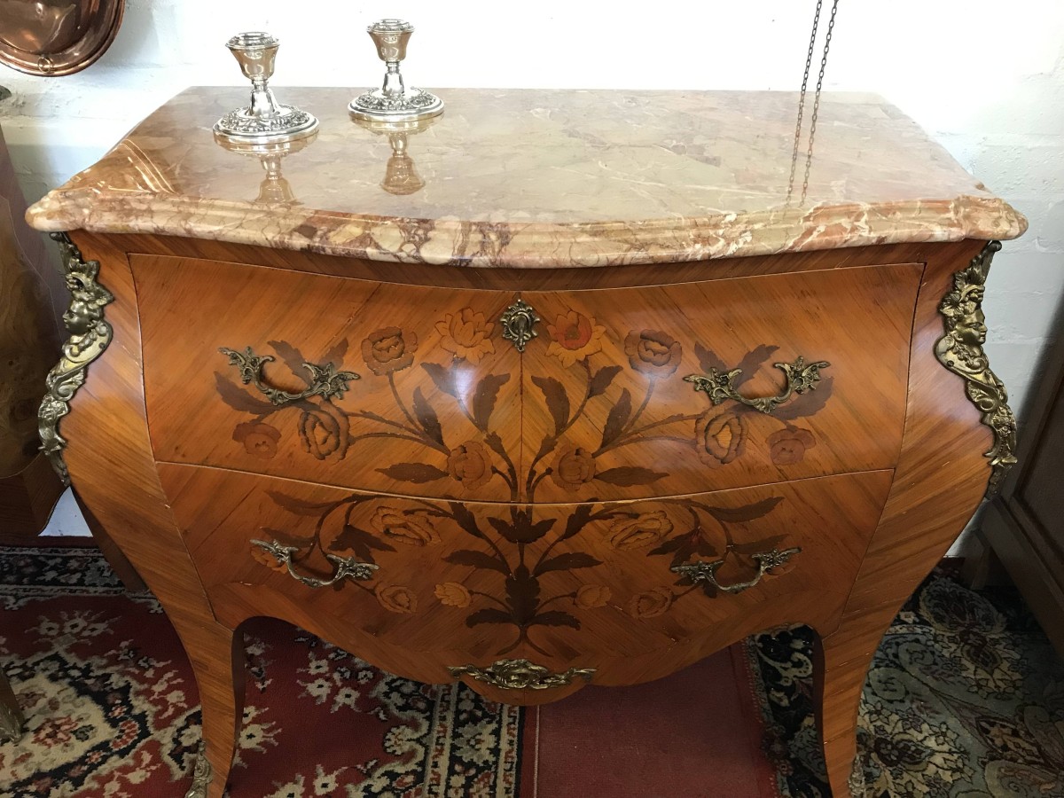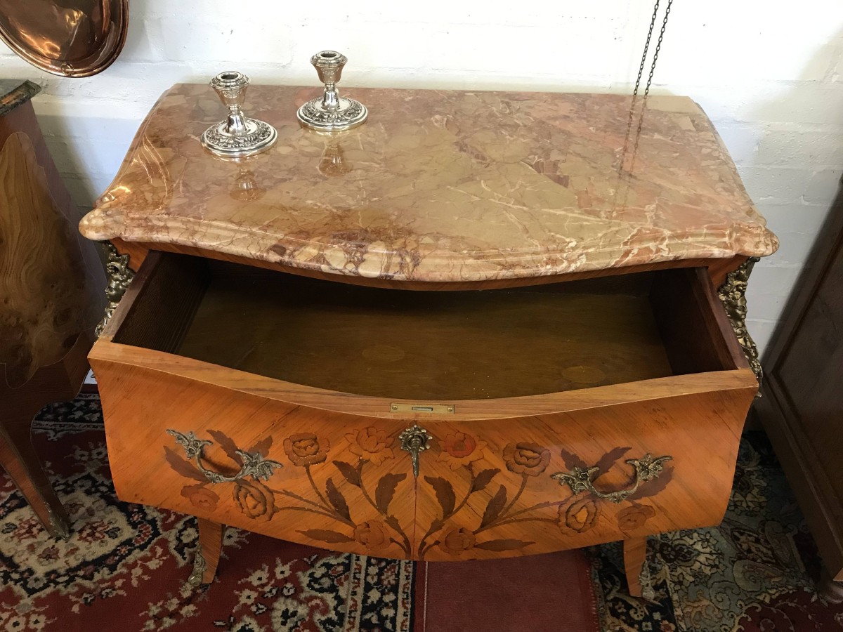 The chest has a beautiful shaped marble top, the marble can be removed. Below are two shaped drawers, each drawer has a pair of brass handles and floral inlay decoration. The top drawer has a brass key and escutcheon and the bottom drawer has a central brass decorative mount. To the sides are a pair of brass decorated mounts. The shaped sides also have floral inlay decoration. This beautiful chest of drawers sits on four shaped legs, the front two legs having brass decoration to the front. A beautiful stylish item of furniture.